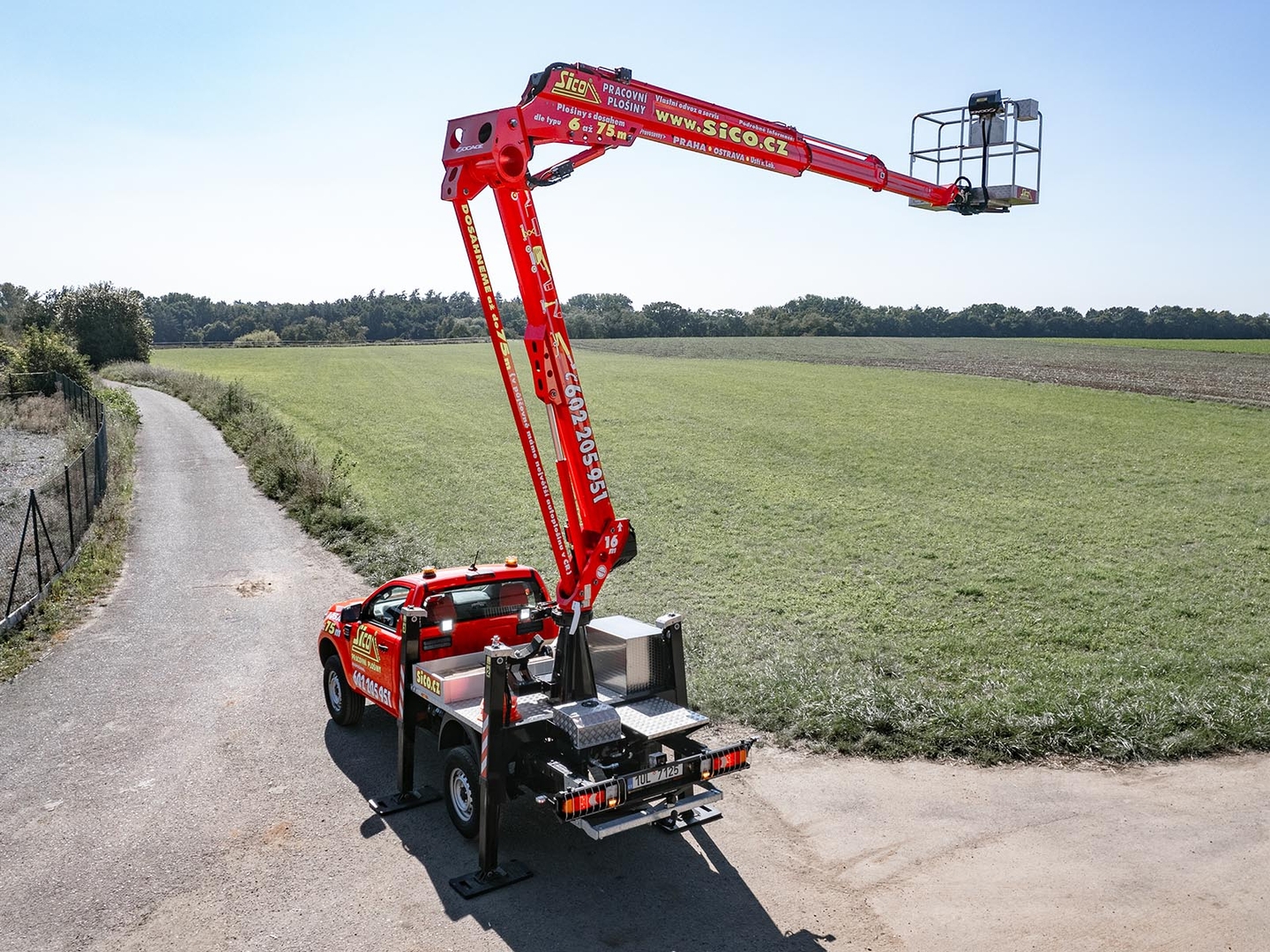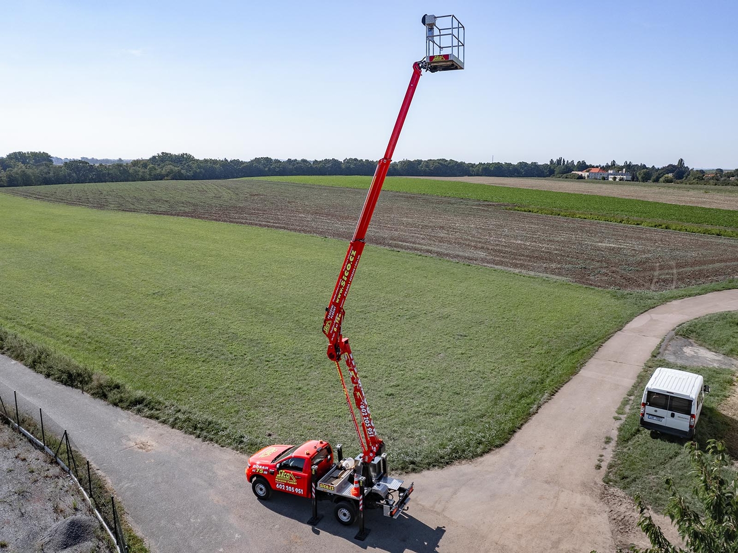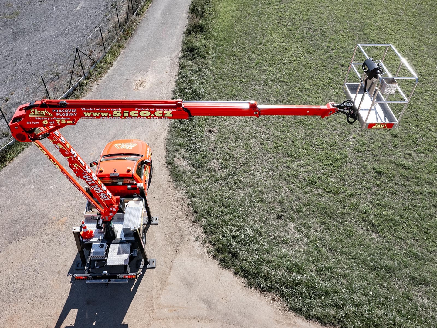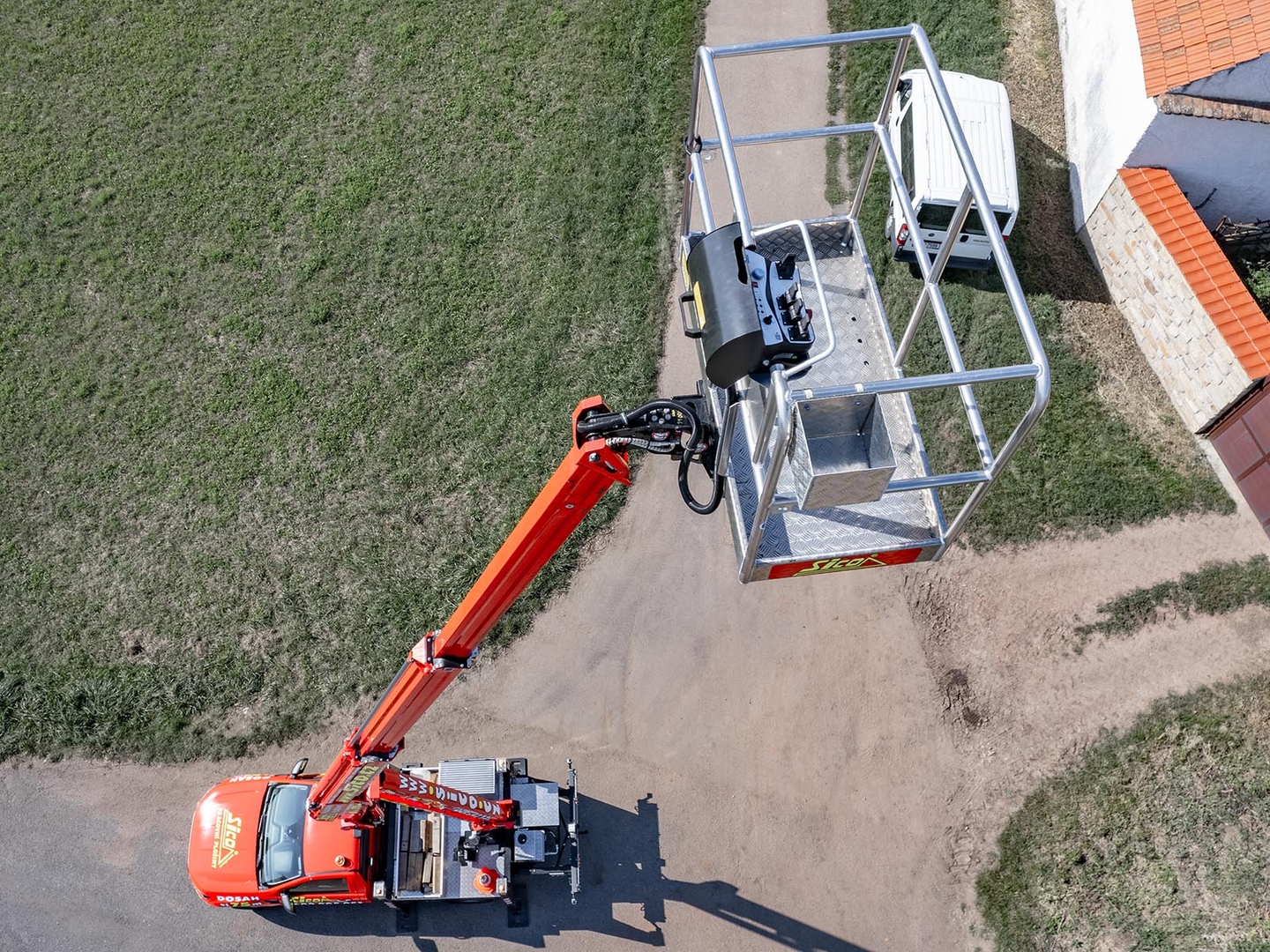 A truck mounted platform on a 4x4 car chassis with intuitive controls, good cross-country ability and a working height of up to 15,5 meters. The machine uses a two-arm articulated-telescopic construction allowing a lateral reach of up to 7,3 meters with a platform load of 80 kilograms. Control is fully proportional and very clear and intuitive. The machine is also equipped with an electric drive (230V). Maximum stability when working at height is ensured by 4 hydraulic supports, and the safety of workers is ensured by hydraulic cylinder locks that prevent loss of pressure. The weight of the machine does not exceed 3,5 tons and therefore it is possible to rent it with a driving license of group B.