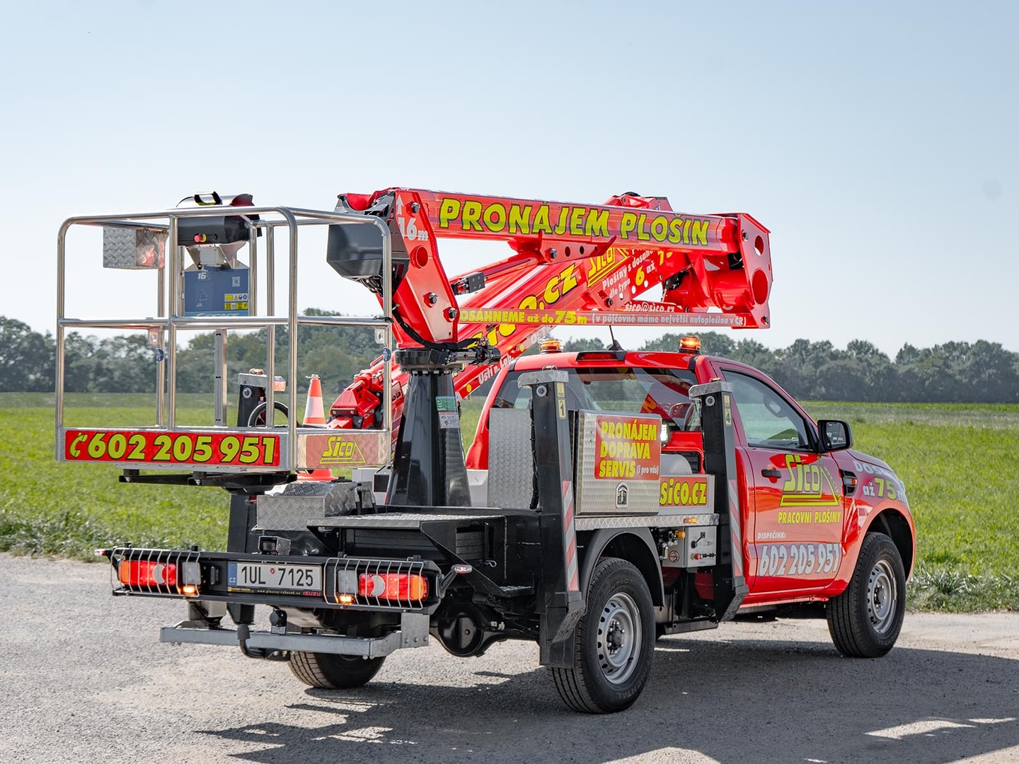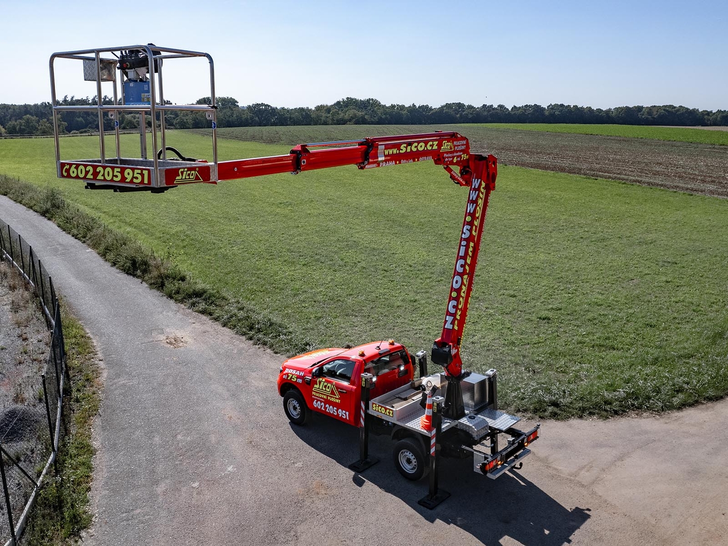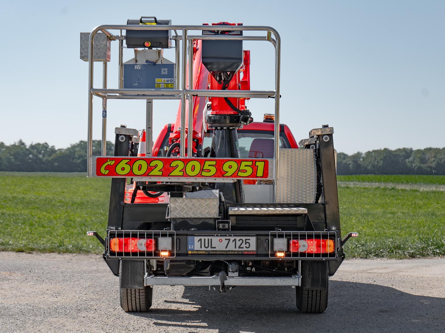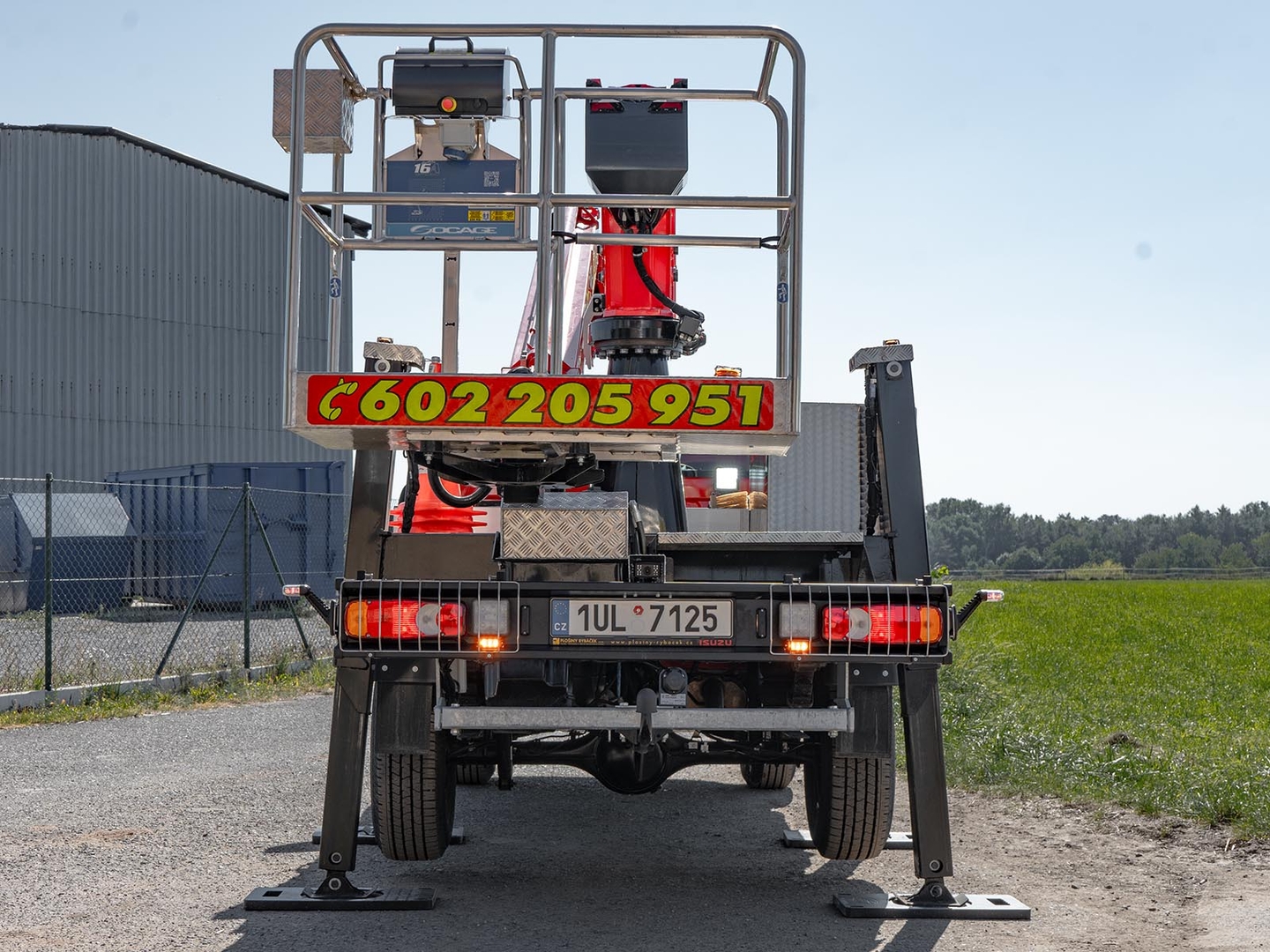 A truck mounted platform on a 4x4 car chassis with intuitive controls, good cross-country ability and a working height of up to 15,5 meters. The machine uses a two-arm articulated-telescopic construction allowing a lateral reach of up to 7,3 meters with a platform load of 80 kilograms. Control is fully proportional and very clear and intuitive. The machine is also equipped with an electric drive (230V). Maximum stability when working at height is ensured by 4 hydraulic supports, and the safety of workers is ensured by hydraulic cylinder locks that prevent loss of pressure. The weight of the machine does not exceed 3,5 tons and therefore it is possible to rent it with a driving license of group B.