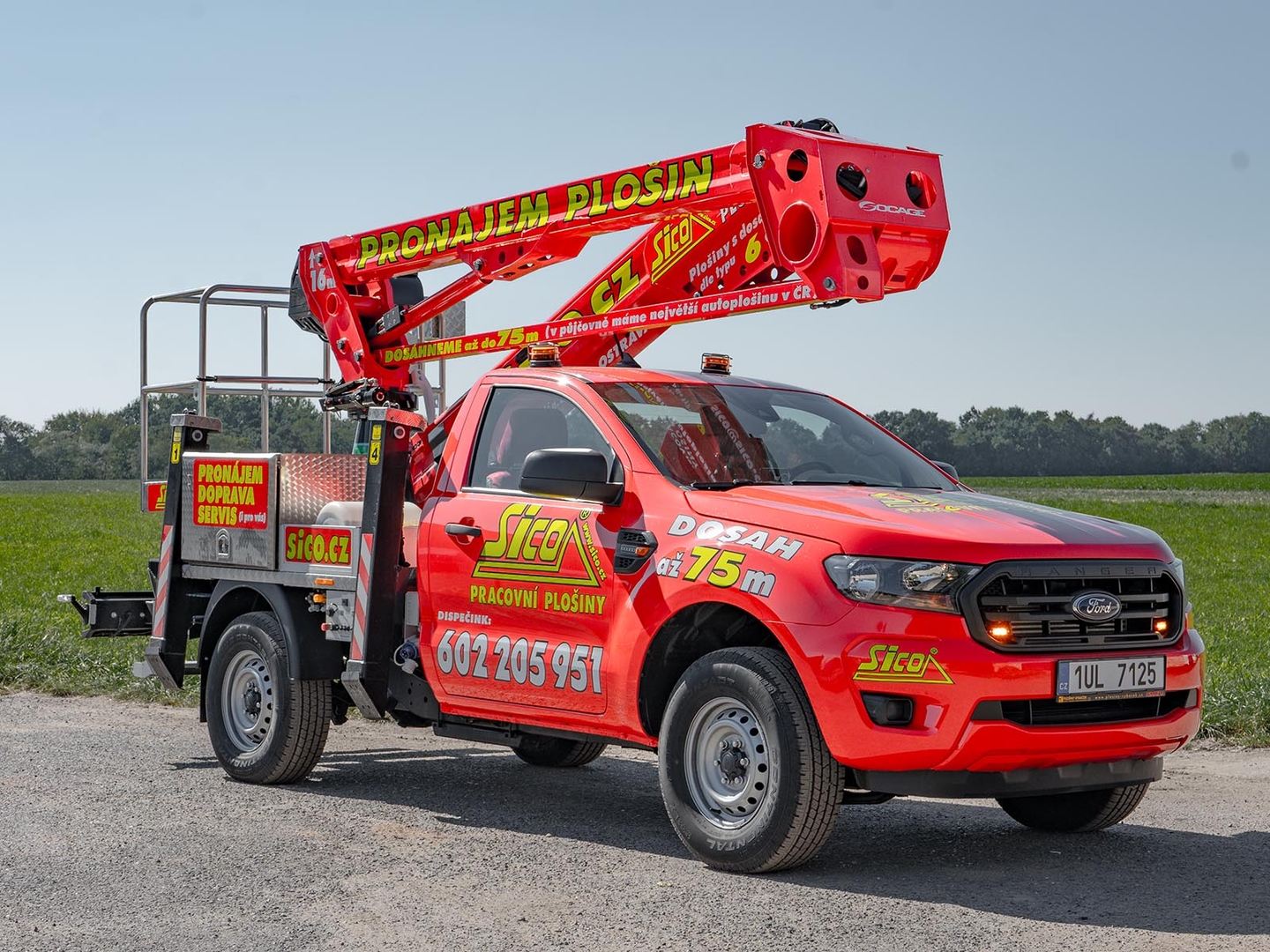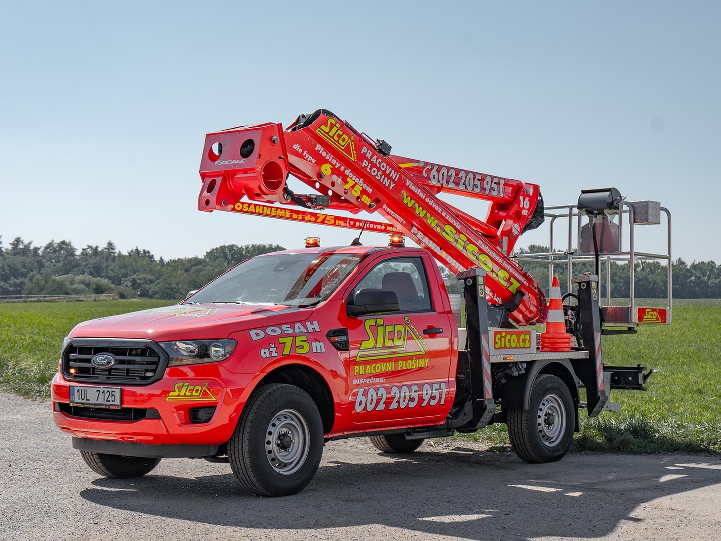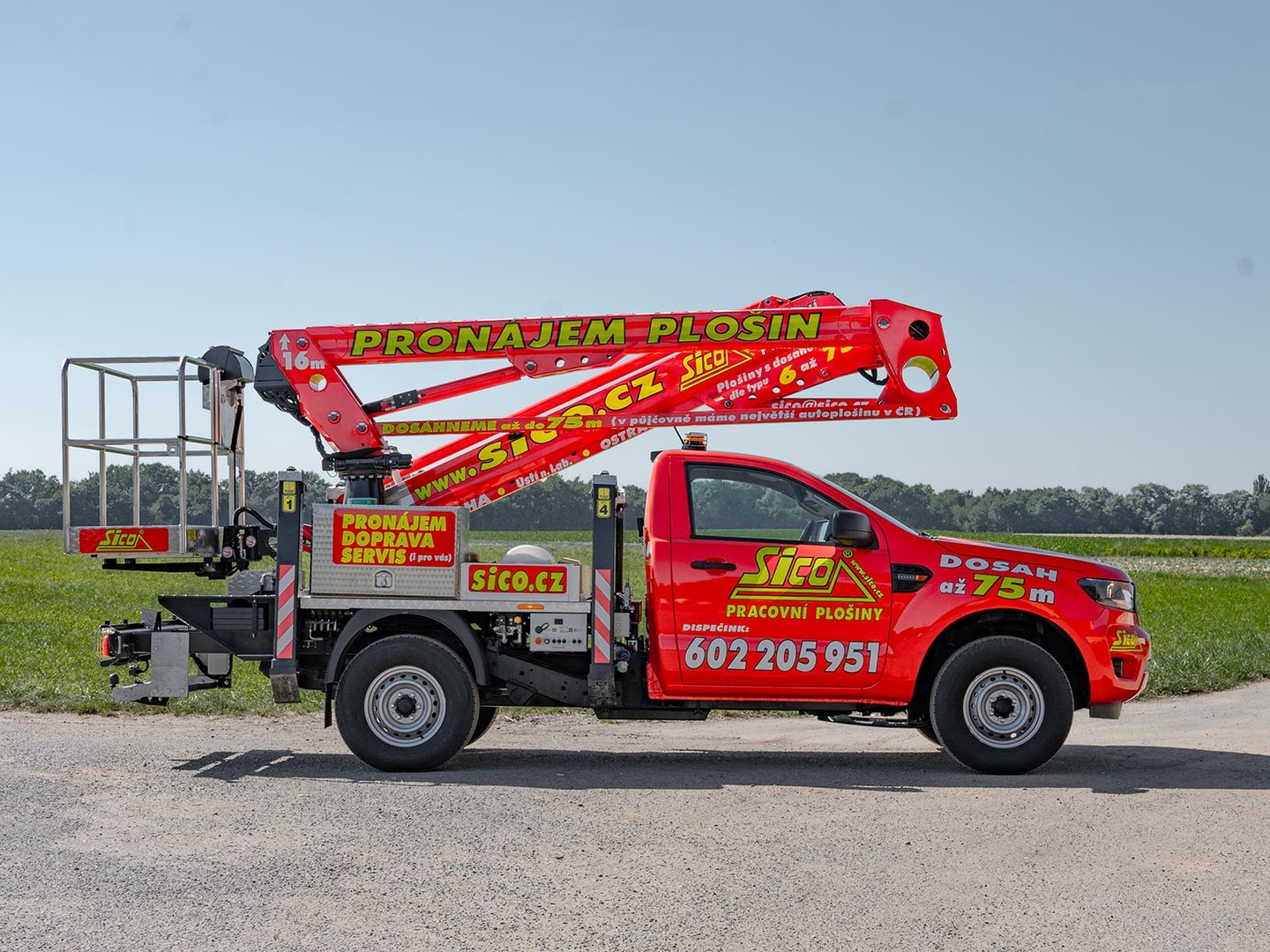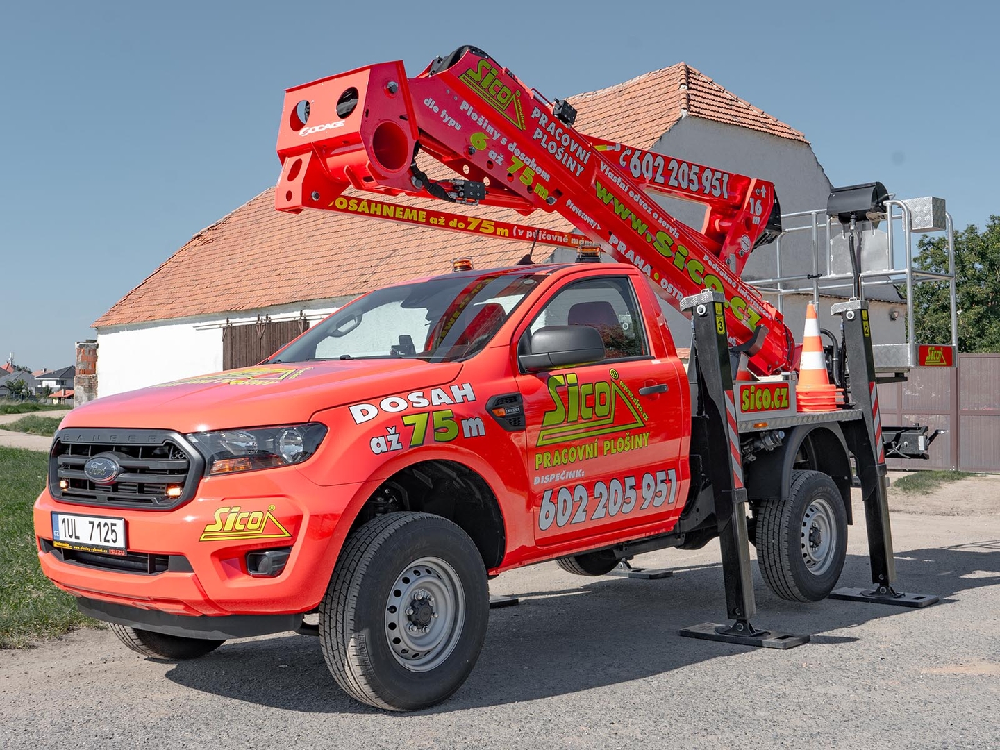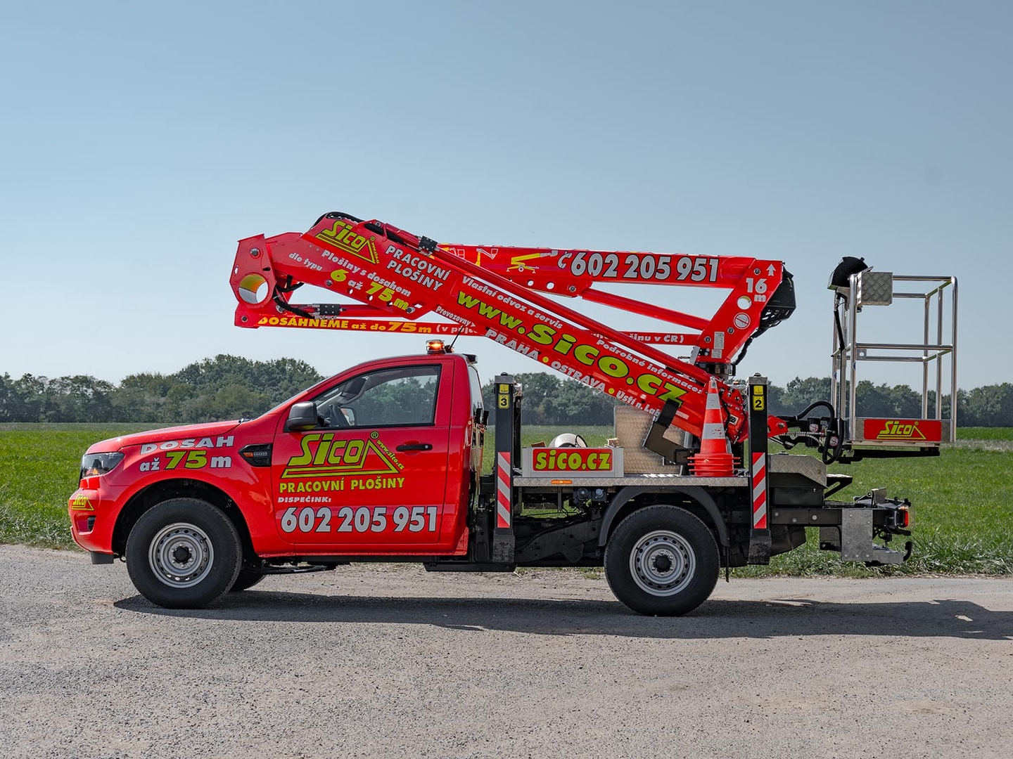 A truck mounted platform on a 4x4 car chassis with intuitive controls, good cross-country ability and a working height of up to 15,5 meters. The machine uses a two-arm articulated-telescopic construction allowing a lateral reach of up to 7,3 meters with a platform load of 80 kilograms. Control is fully proportional and very clear and intuitive. The machine is also equipped with an electric drive (230V). Maximum stability when working at height is ensured by 4 hydraulic supports, and the safety of workers is ensured by hydraulic cylinder locks that prevent loss of pressure. The weight of the machine does not exceed 3,5 tons and therefore it is possible to rent it with a driving license of group B.