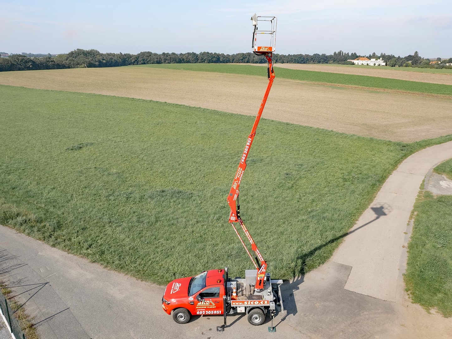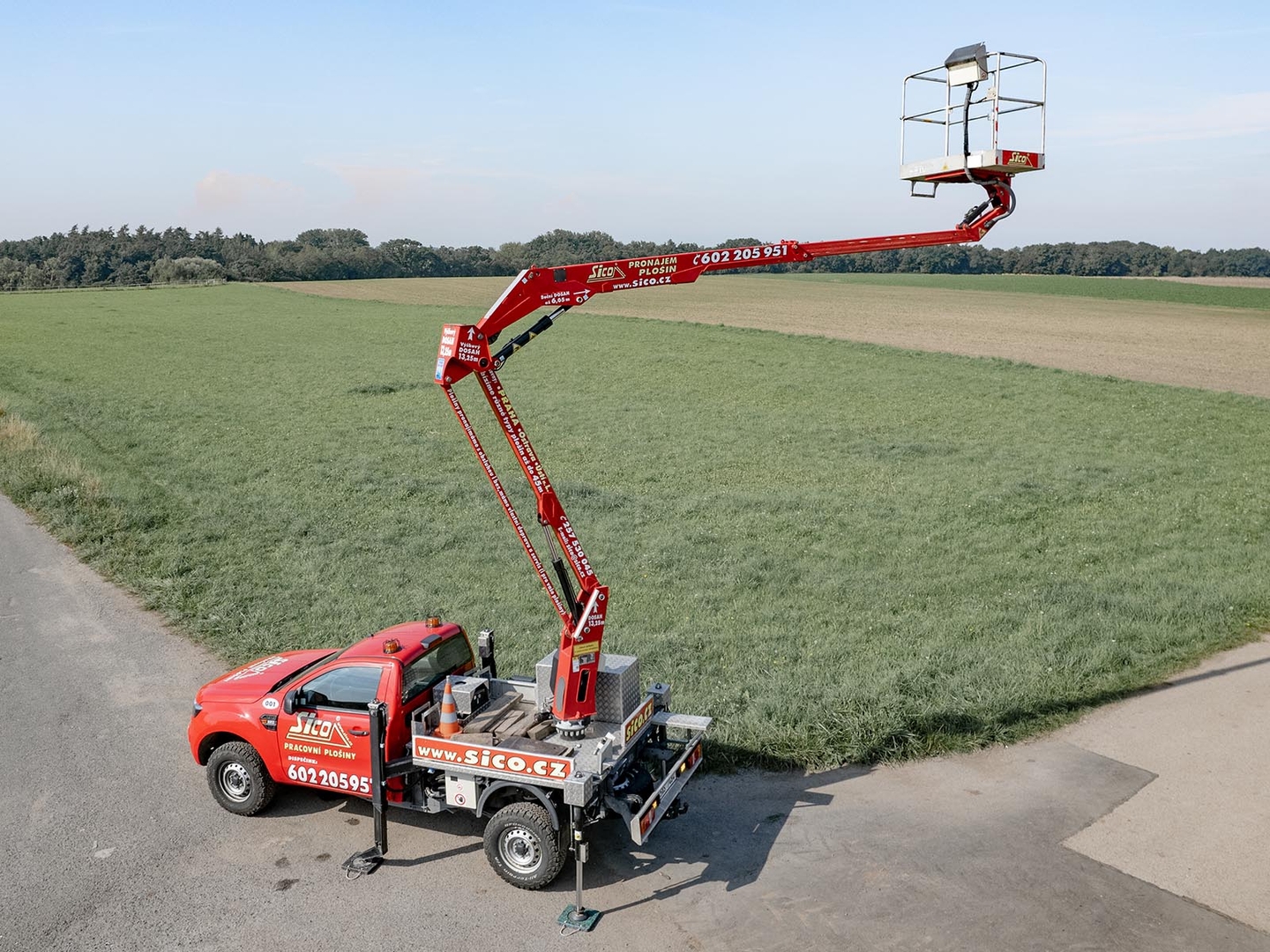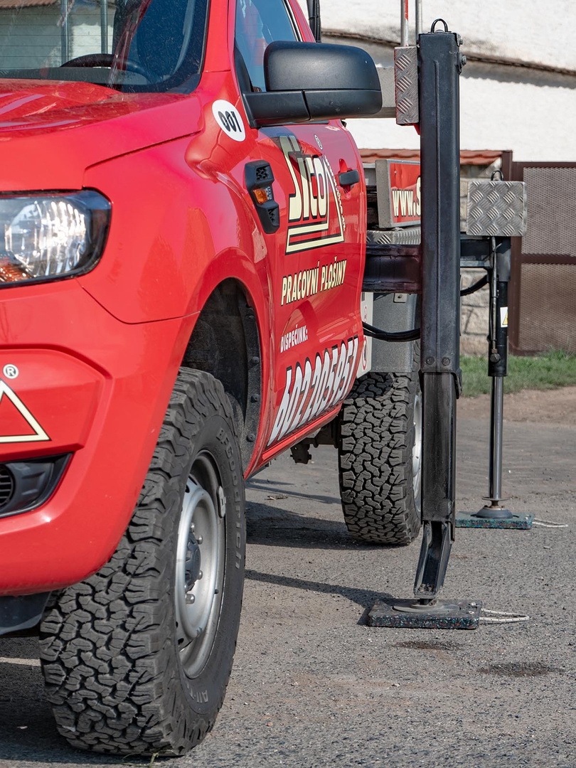 This is how we could describe the work platform of the Italian manufacturer GSR - model E140P on a Ford Ranger chassis. It is the smallest, but widely used representative of the category of truck platforms. The articulated-telescopic construction allows you to bridge an obstacle in 5 meters and get up to 6 meters behind it. The machine weighs less than 3,5 tons, the working height is 13,2 meters and the platform can carry 250 kilograms. Ranger is not afraid of lighter terrain. Stability when working at height is ensured by 4 extendable supports.