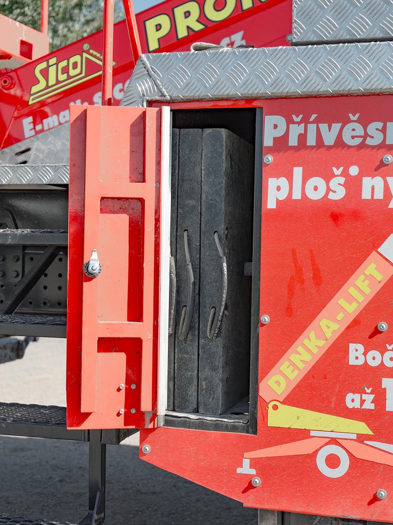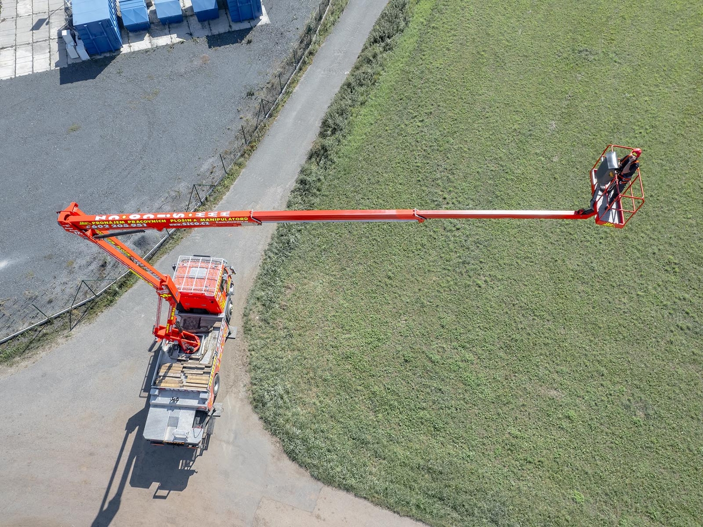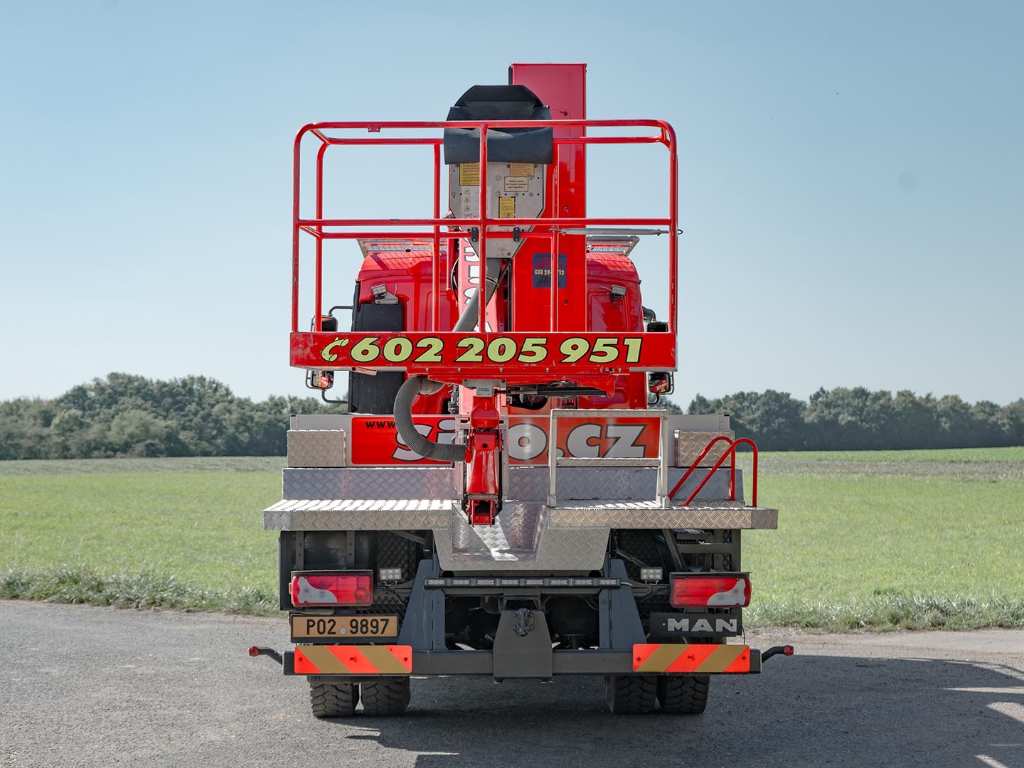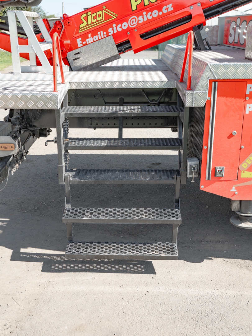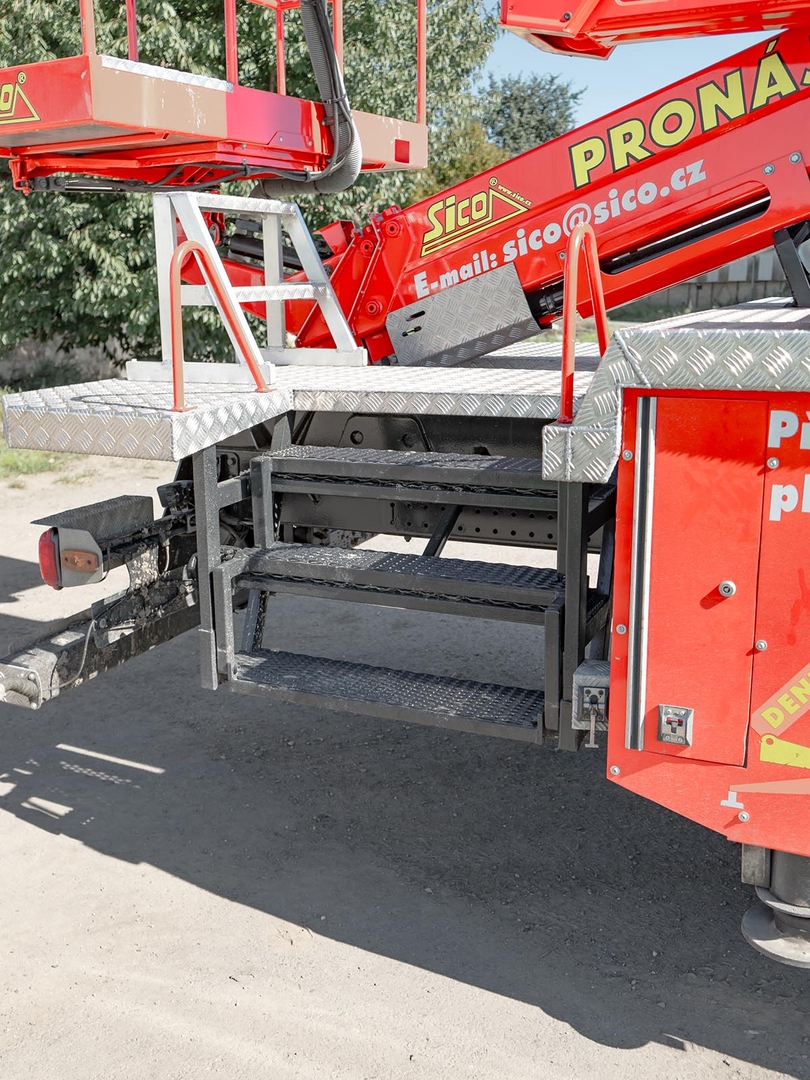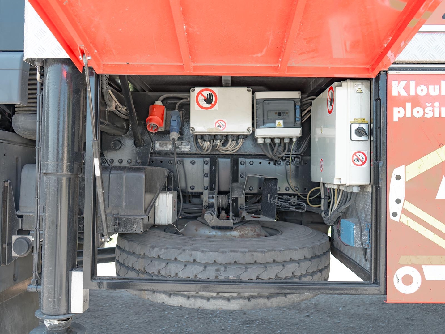 In the case of the E290PX, this means, for example, the possibility of overcoming an obstacle at a height of 10 meters and getting more than 15 meters to the side. The truck platform places minimal space requirements during installation. Thanks to the intuitive and fully proportional control and setting speed, the platform is suitable for multiple work at heights in a short interval. The movement of the boom is driven by the car's engine or 400 V current. The work platform with a load capacity of 250 kg can be lowered up to 2 meters below the level of the chassis. The truck platform meets strict safety regulations and international standards.