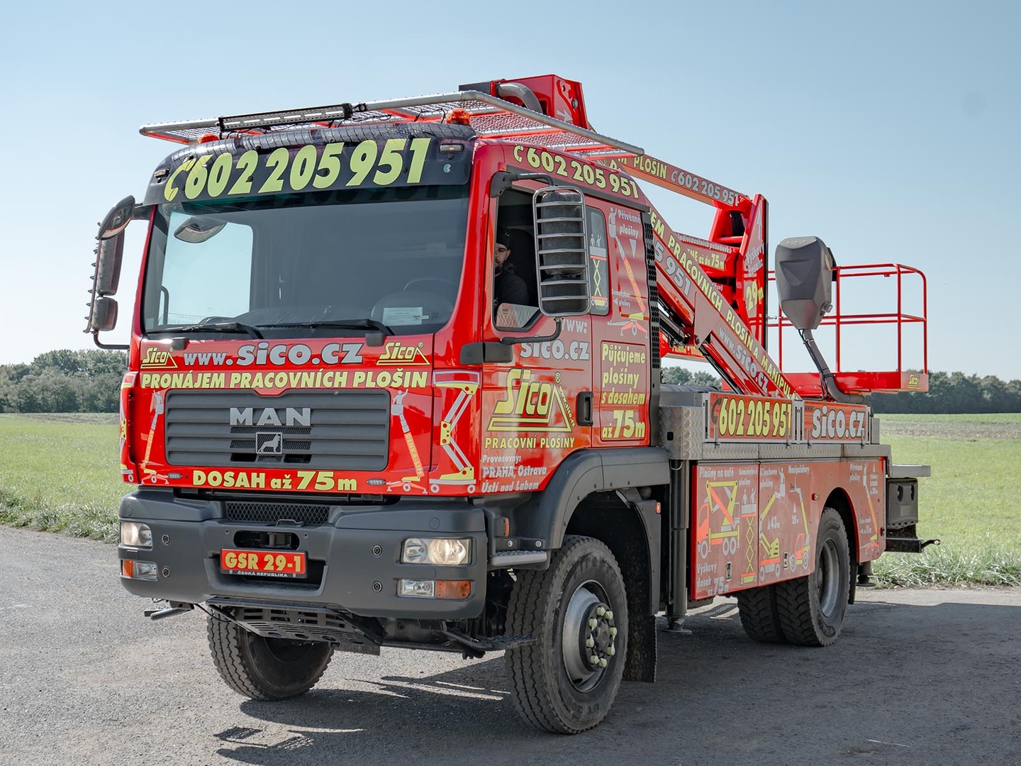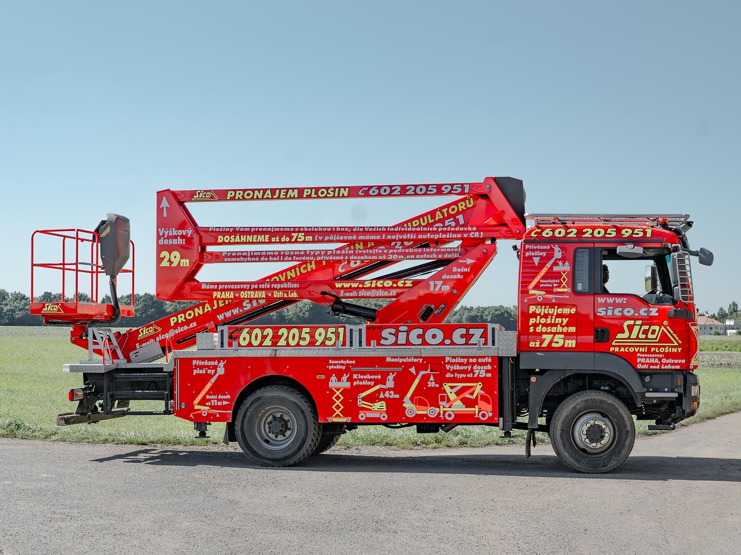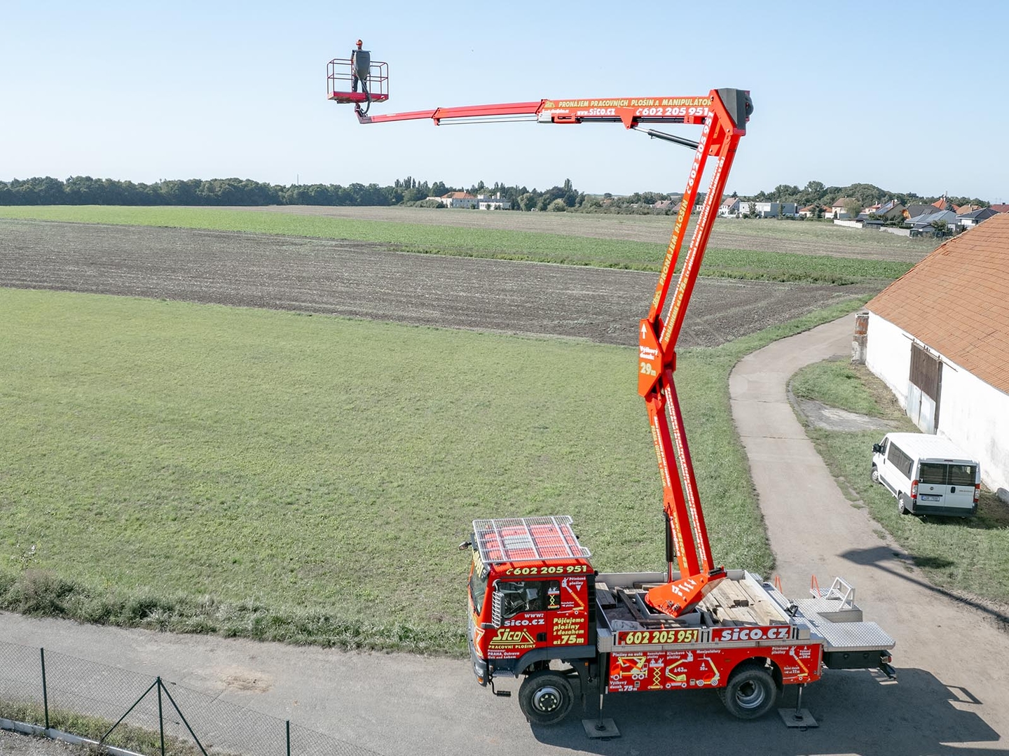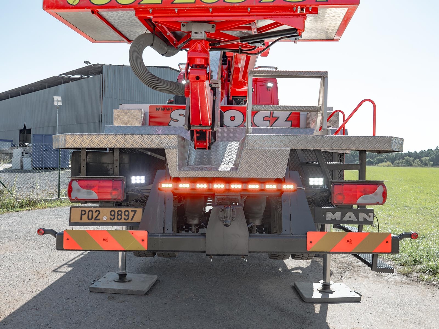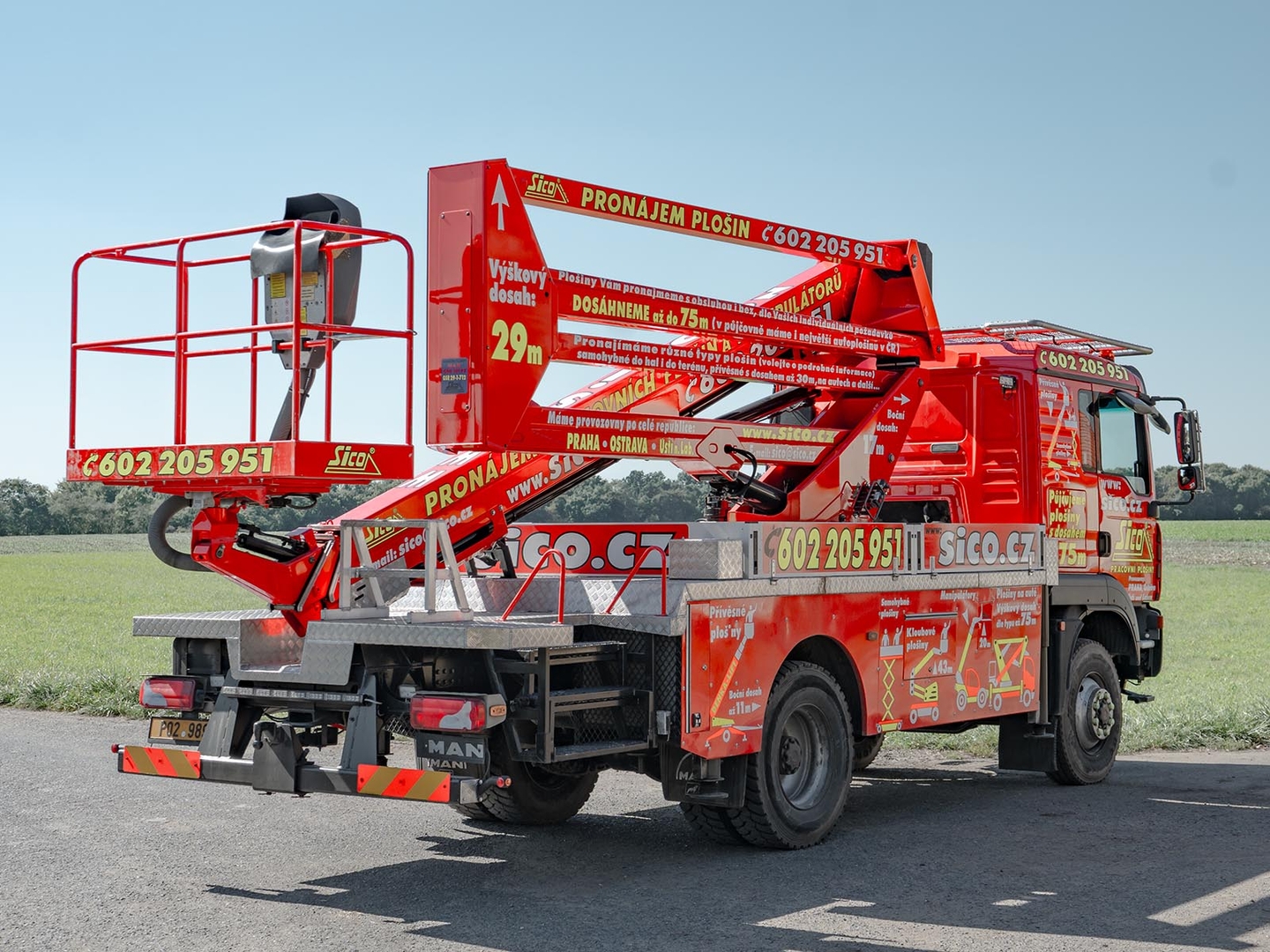 In the case of the E290PX, this means, for example, the possibility of overcoming an obstacle at a height of 10 meters and getting more than 15 meters to the side. The truck platform places minimal space requirements during installation. Thanks to the intuitive and fully proportional control and setting speed, the platform is suitable for multiple work at heights in a short interval. The movement of the boom is driven by the car's engine or 400 V current. The work platform with a load capacity of 250 kg can be lowered up to 2 meters below the level of the chassis. The truck platform meets strict safety regulations and international standards.