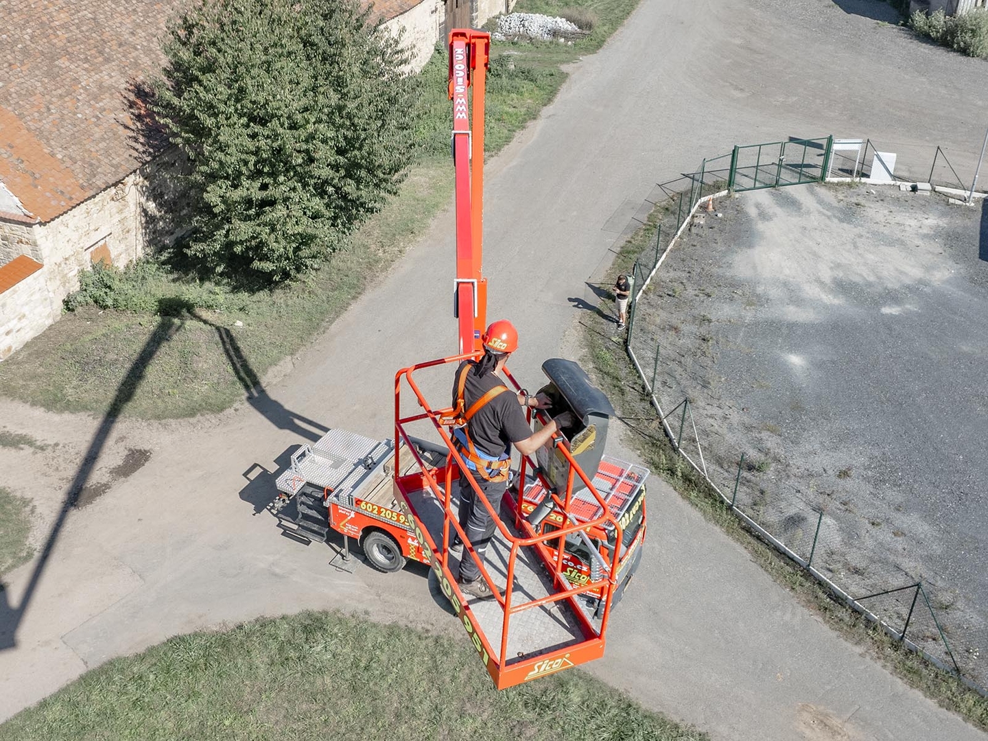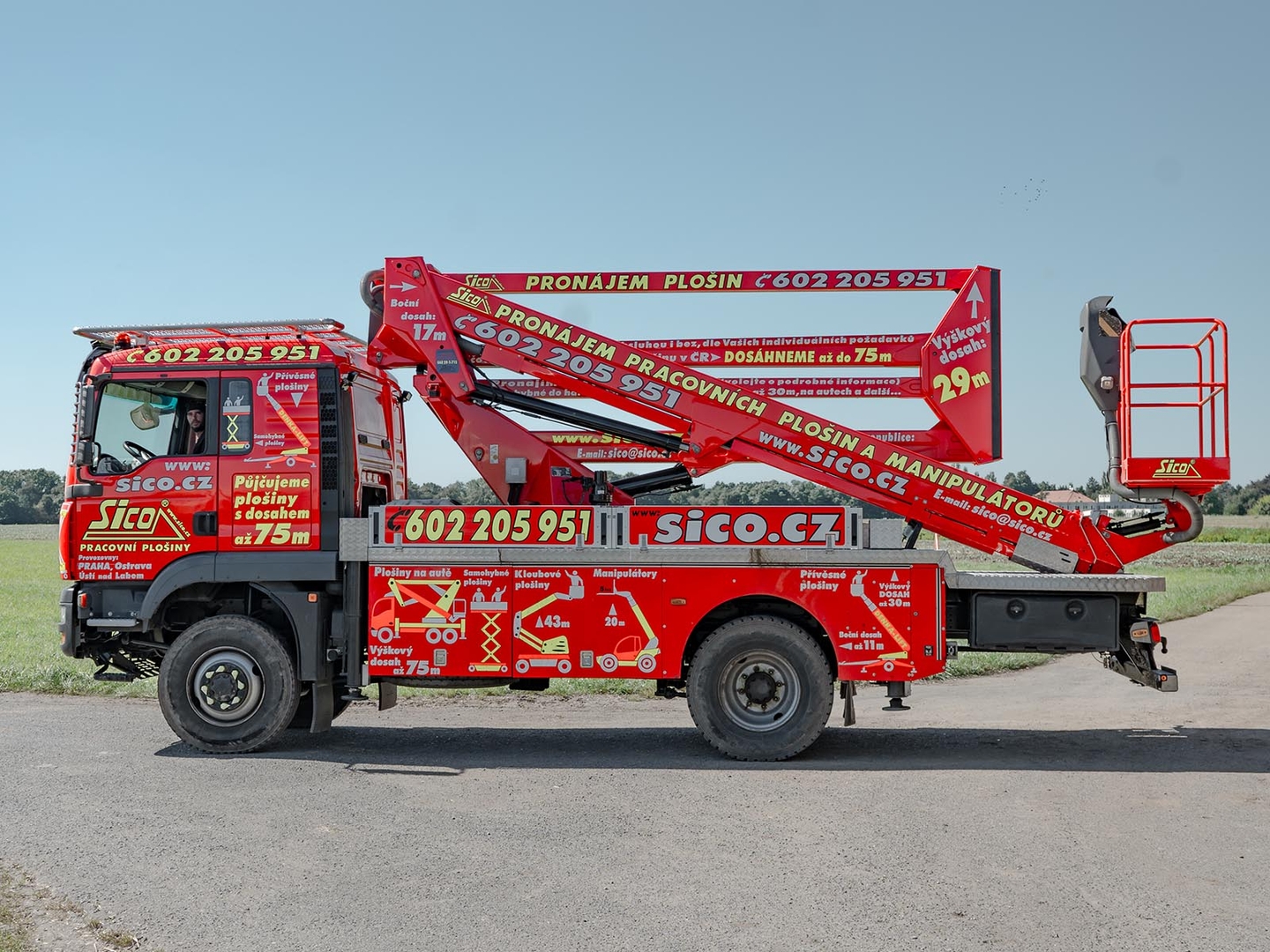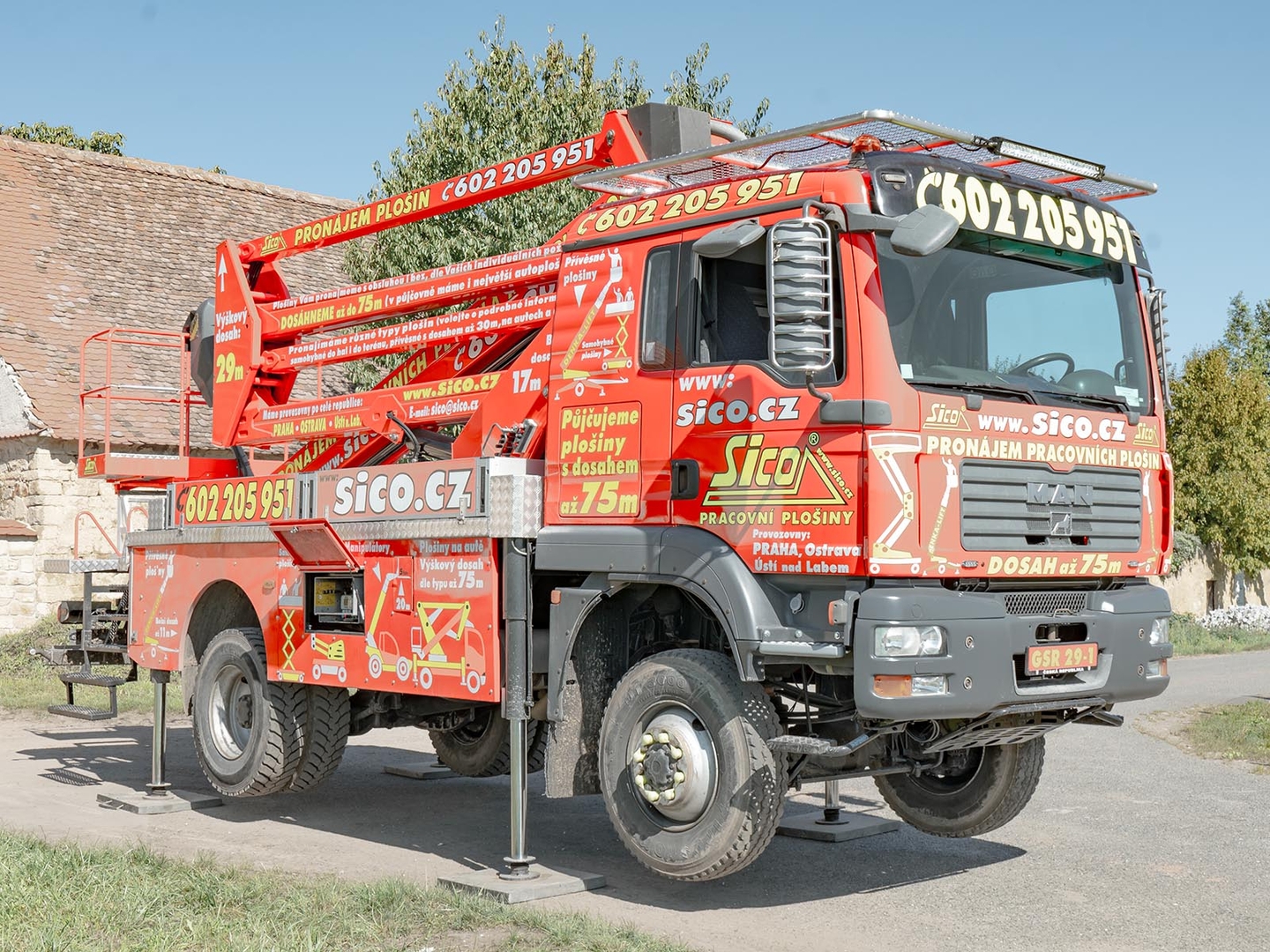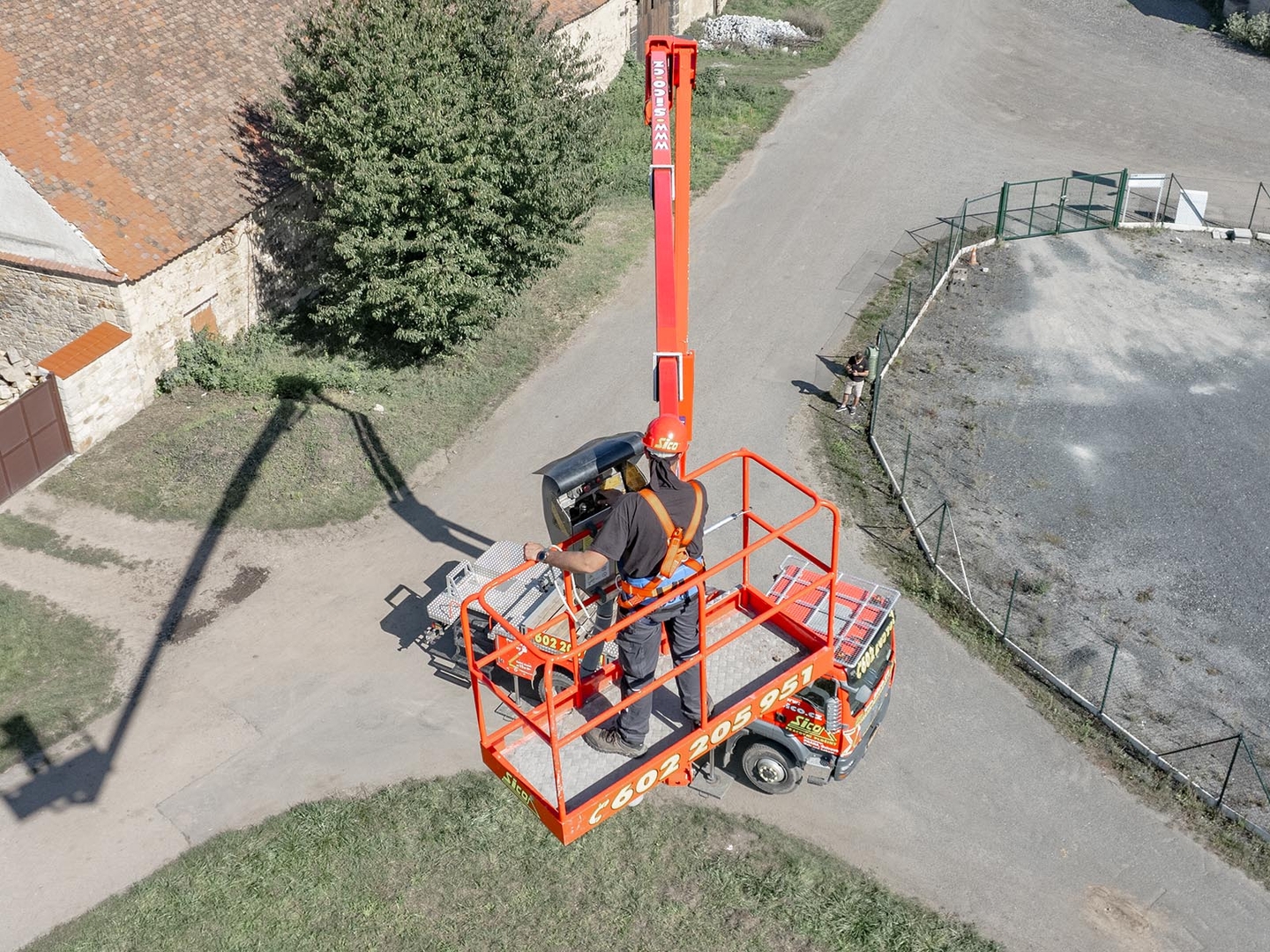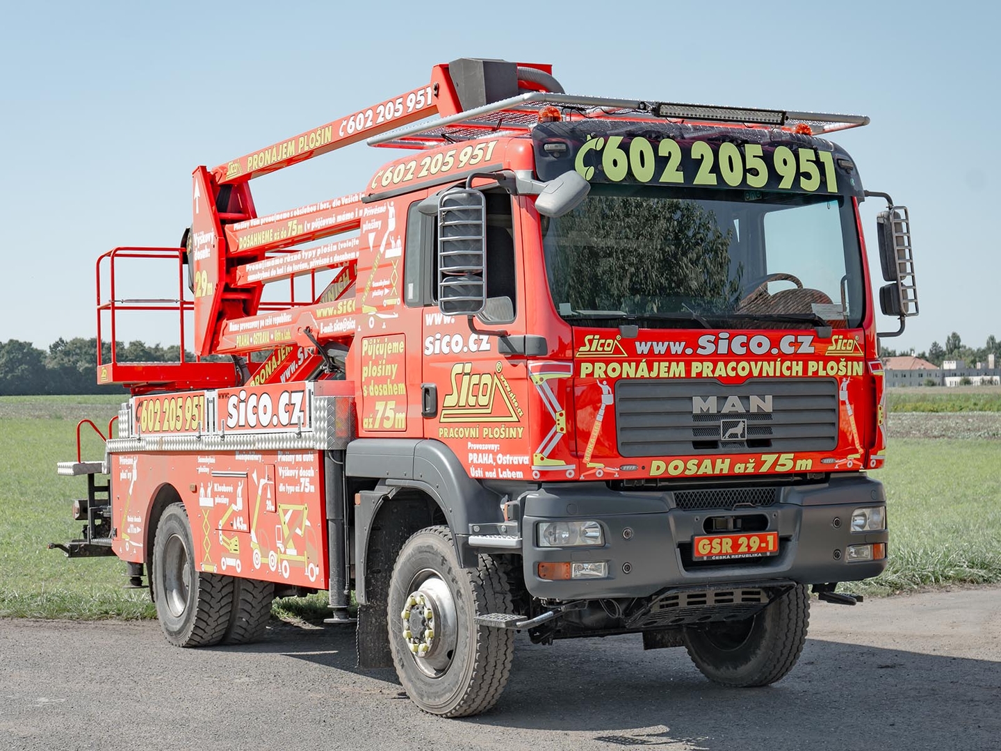 In the case of the E290PX, this means, for example, the possibility of overcoming an obstacle at a height of 10 meters and getting more than 15 meters to the side. The truck platform places minimal space requirements during installation. Thanks to the intuitive and fully proportional control and setting speed, the platform is suitable for multiple work at heights in a short interval. The movement of the boom is driven by the car's engine or 400 V current. The work platform with a load capacity of 250 kg can be lowered up to 2 meters below the level of the chassis. The truck platform meets strict safety regulations and international standards.