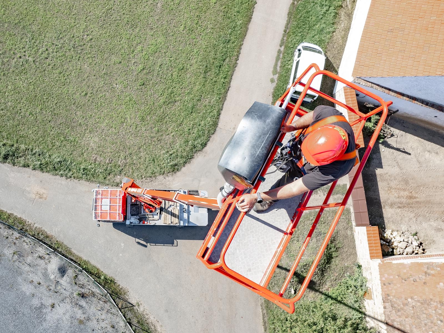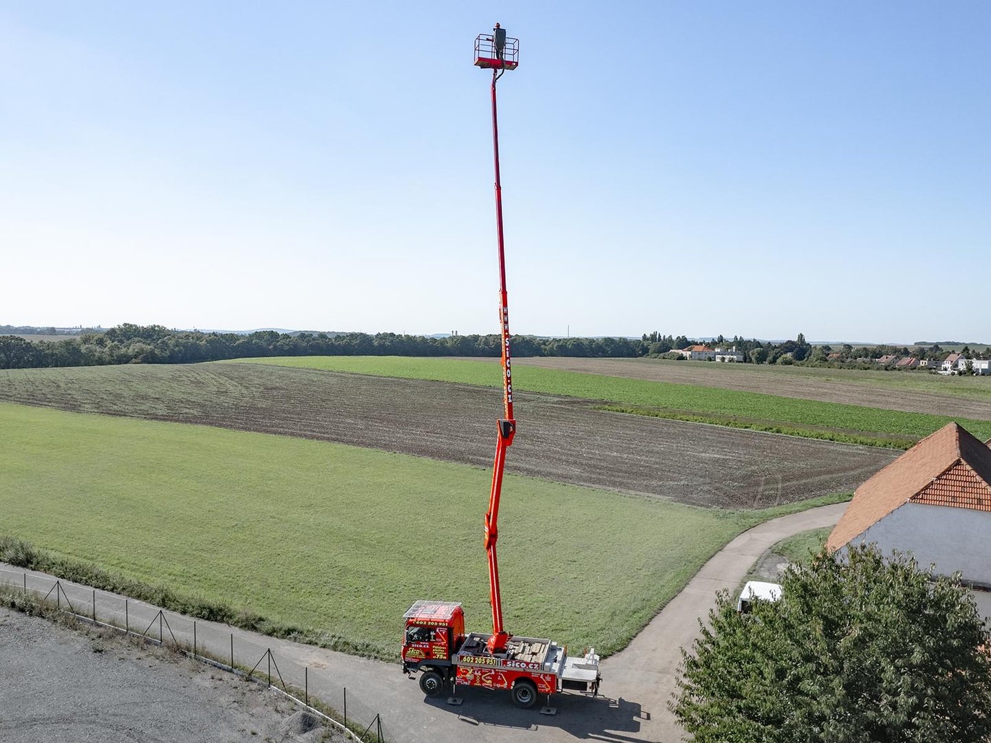 The superstructure combines the advantages of an articulated and telescopic construction and ensures a working height of 28,7 meters and a lateral reach of 15,6 meters.