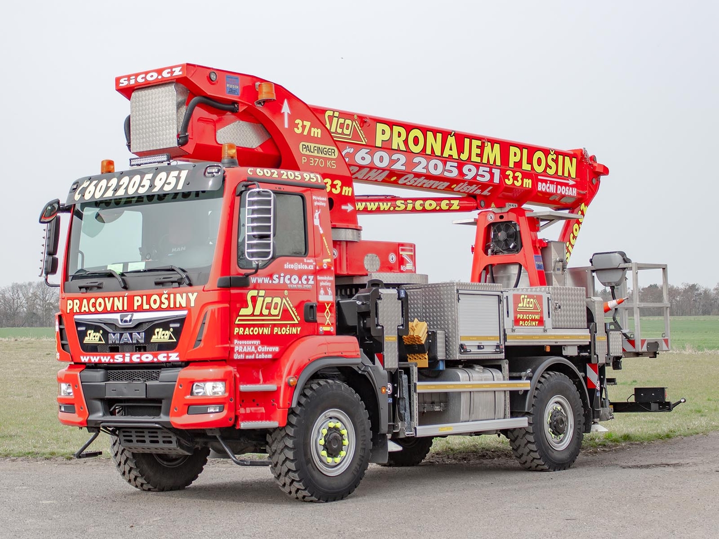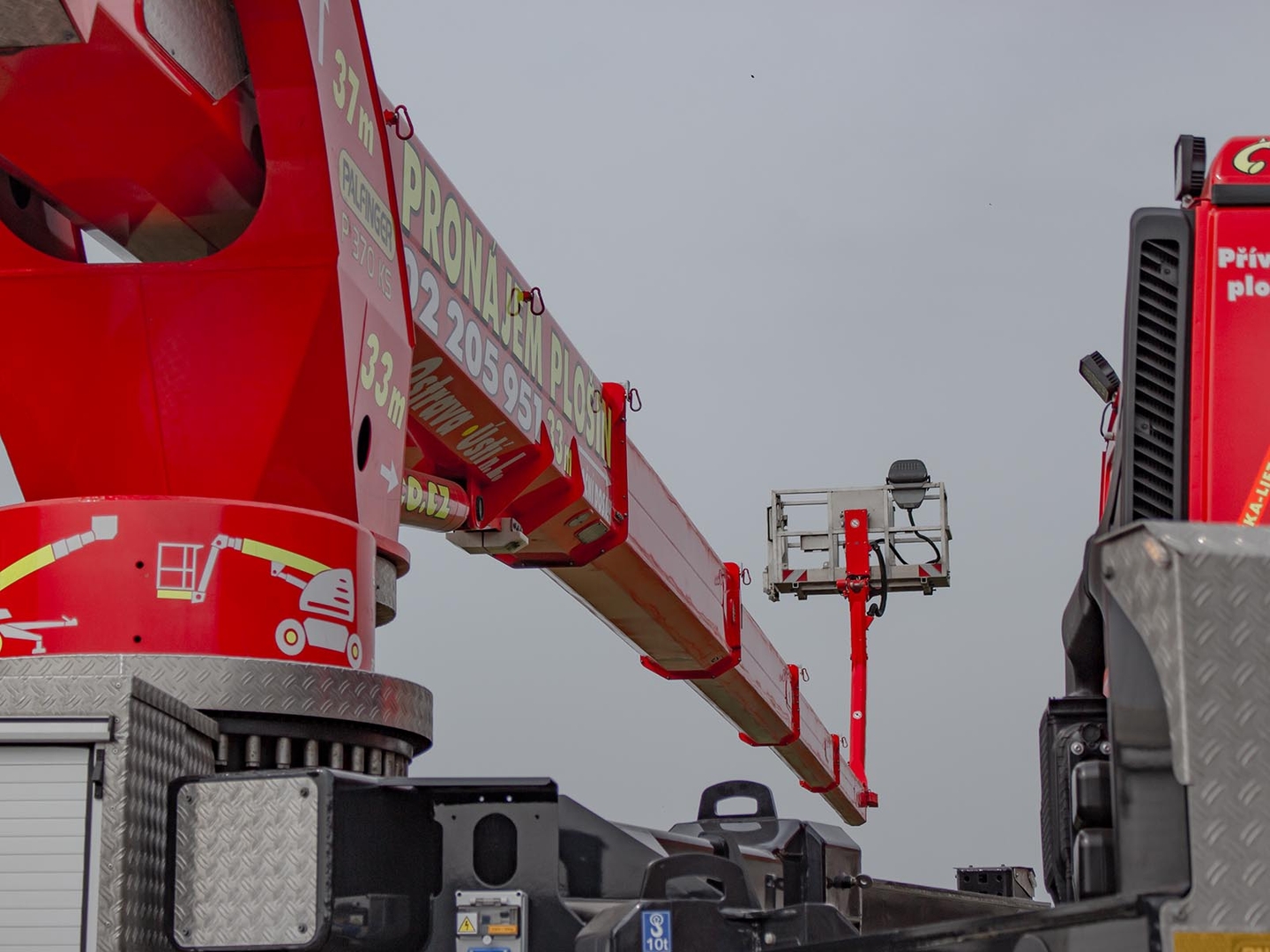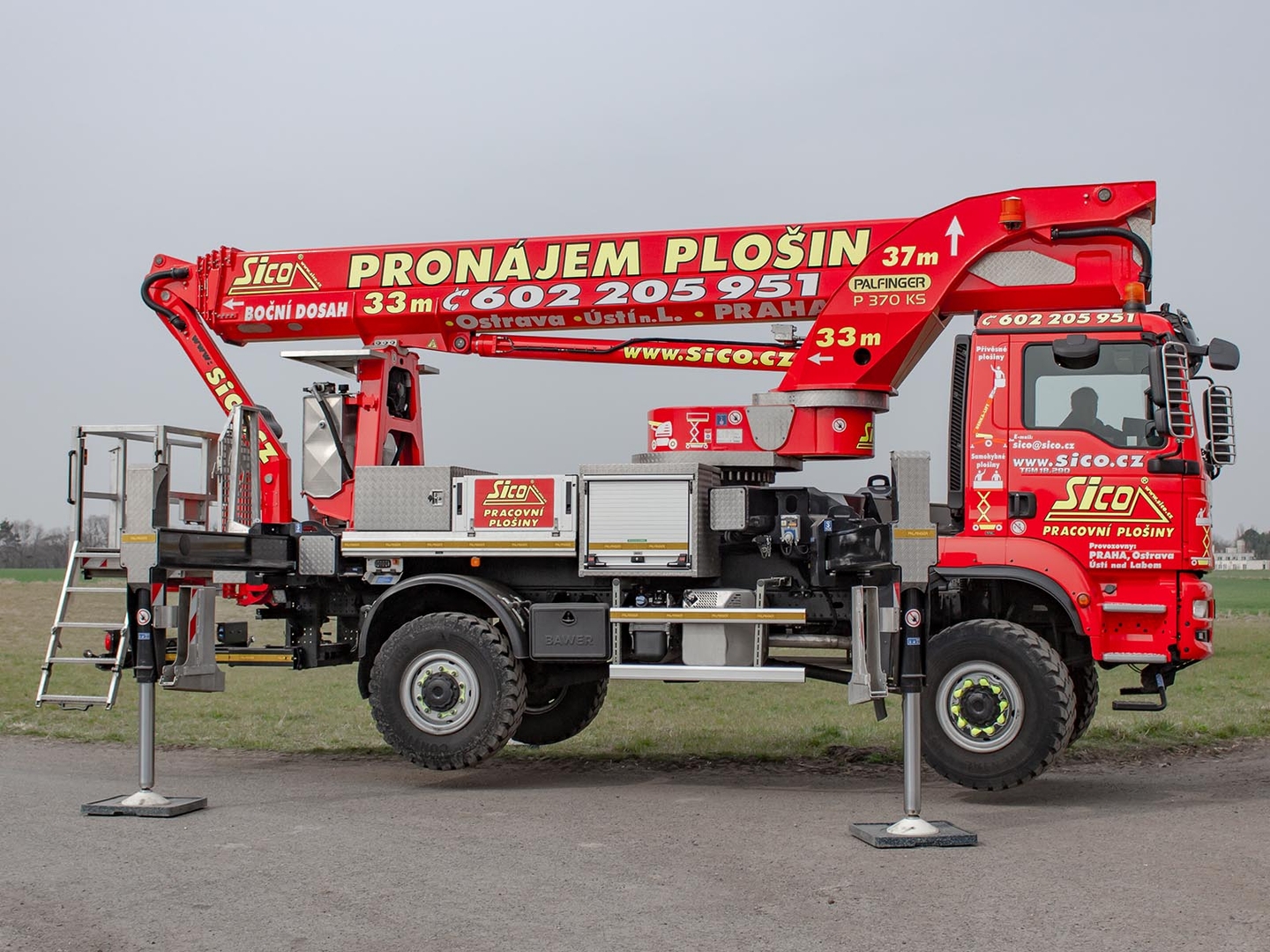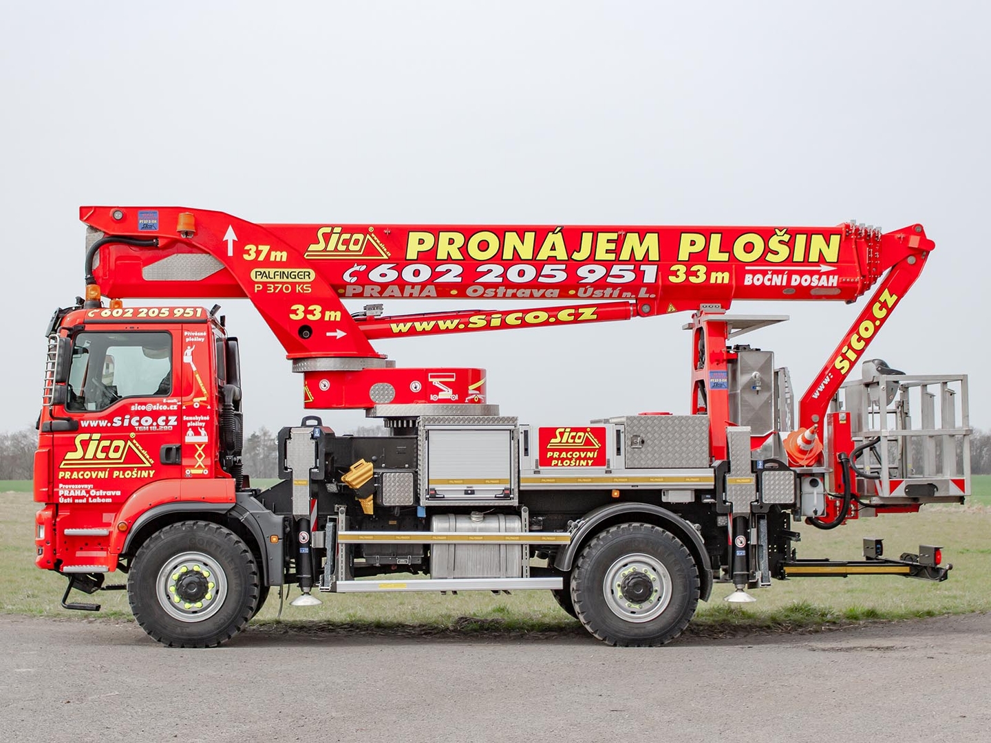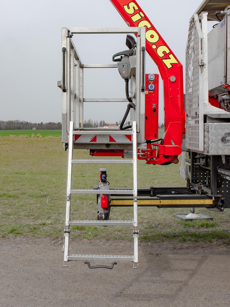 The Palfinger superstructure consists of a swivel on the chassis, a boom with an articulated telescope and a work platform on the so-called JIB arm, which allows the work platform to reach even hard-to-reach places. The maximum reach of the platform is 37 meters in height. The machine is equipped with an electric current generator and a large work platform with a load capacity of up to 500 kg is equipped with sockets with a voltage of 230V and 24V. The vehicle is equipped with off-road tires and thanks to the 4×4 drive, it can reach even more difficult-to-access places. The specialty of the machine is the equipment for cutting the green - ie the safety partition separating the operator from the worker performing the cutting and the holder of the chainsaw. The machine can be equipped with plate material holders. The truck platform meets strict safety regulations and international standards. The stability of the platform is ensured by the subframe of the vehicle with four retractable supports that absorb the load of the platform. This version of the P370 is on a chassis with a wheelbase of 4,5 meters and is equipped with a sleeping cabin.