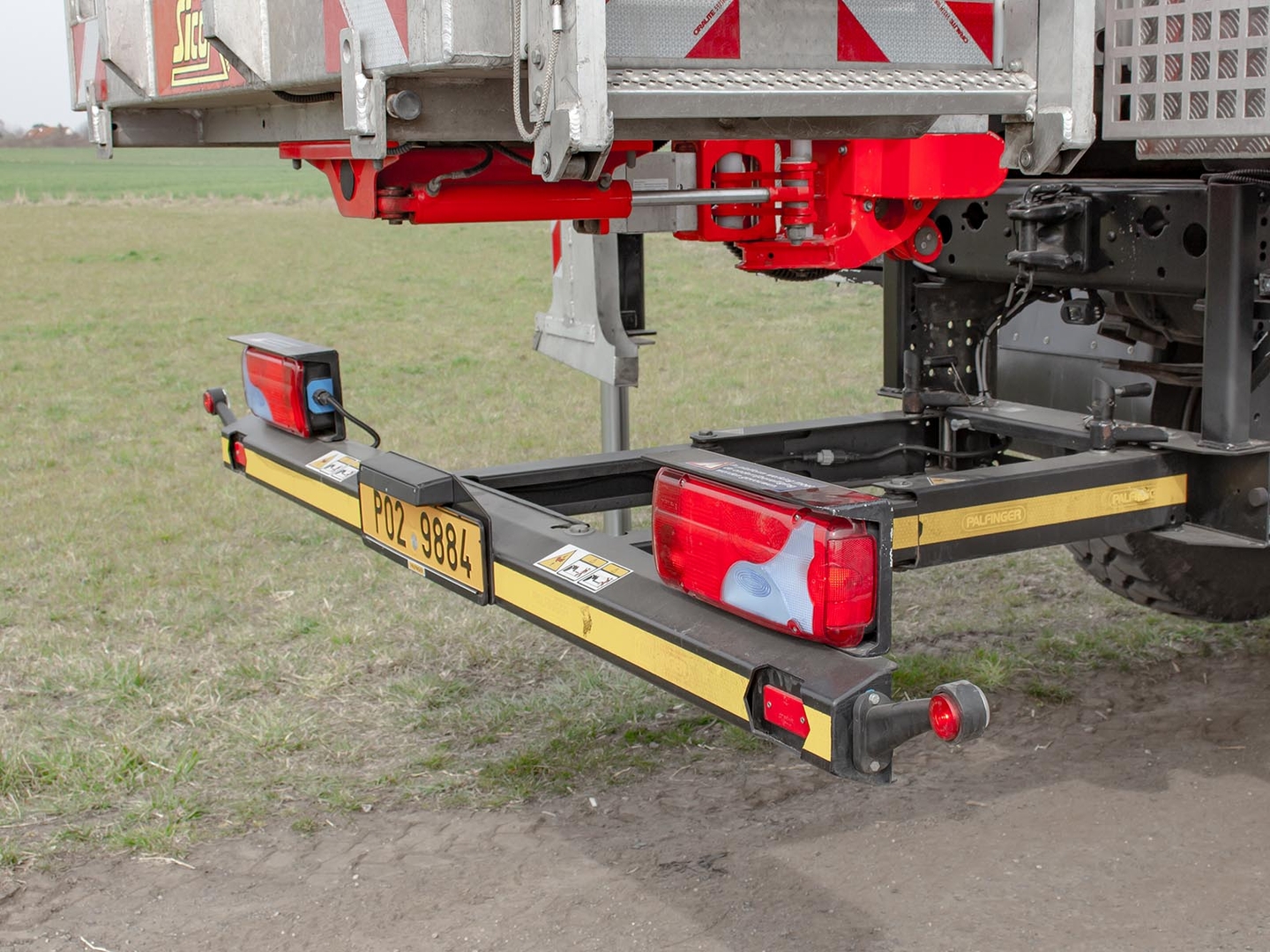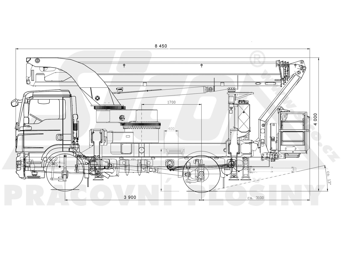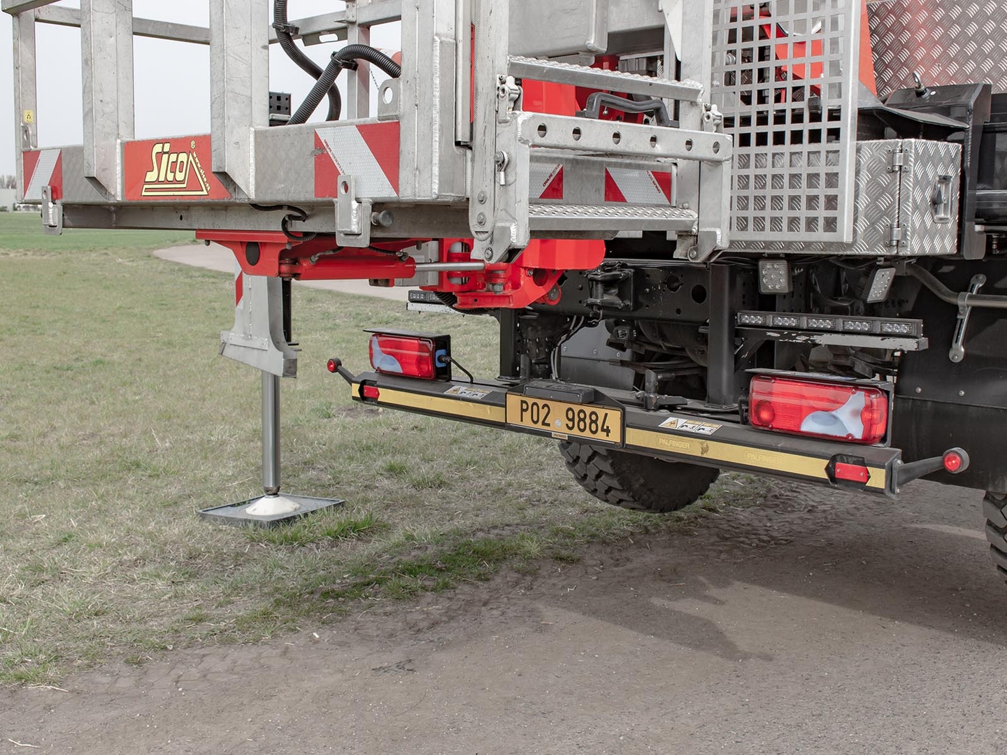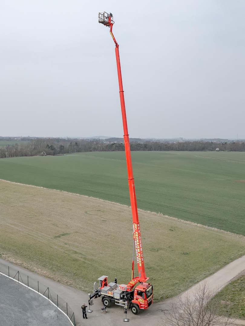 The Palfinger superstructure consists of a swivel on the chassis, a boom with an articulated telescope and a work platform on the so-called JIB arm, which allows the work platform to reach even hard-to-reach places. The maximum reach of the platform is 37 meters in height. The machine is equipped with an electric current generator and a large work platform with a load capacity of up to 500 kg is equipped with sockets with a voltage of 230V and 24V. The vehicle is equipped with off-road tires and thanks to the 4×4 drive, it can reach even more difficult-to-access places. The specialty of the machine is the equipment for cutting the green - ie the safety partition separating the operator from the worker performing the cutting and the holder of the chainsaw. The machine can be equipped with plate material holders. The truck platform meets strict safety regulations and international standards. The stability of the platform is ensured by the subframe of the vehicle with four retractable supports that absorb the load of the platform. This version of the P370 is on a chassis with a wheelbase of 4,5 meters and is equipped with a sleeping cabin.
