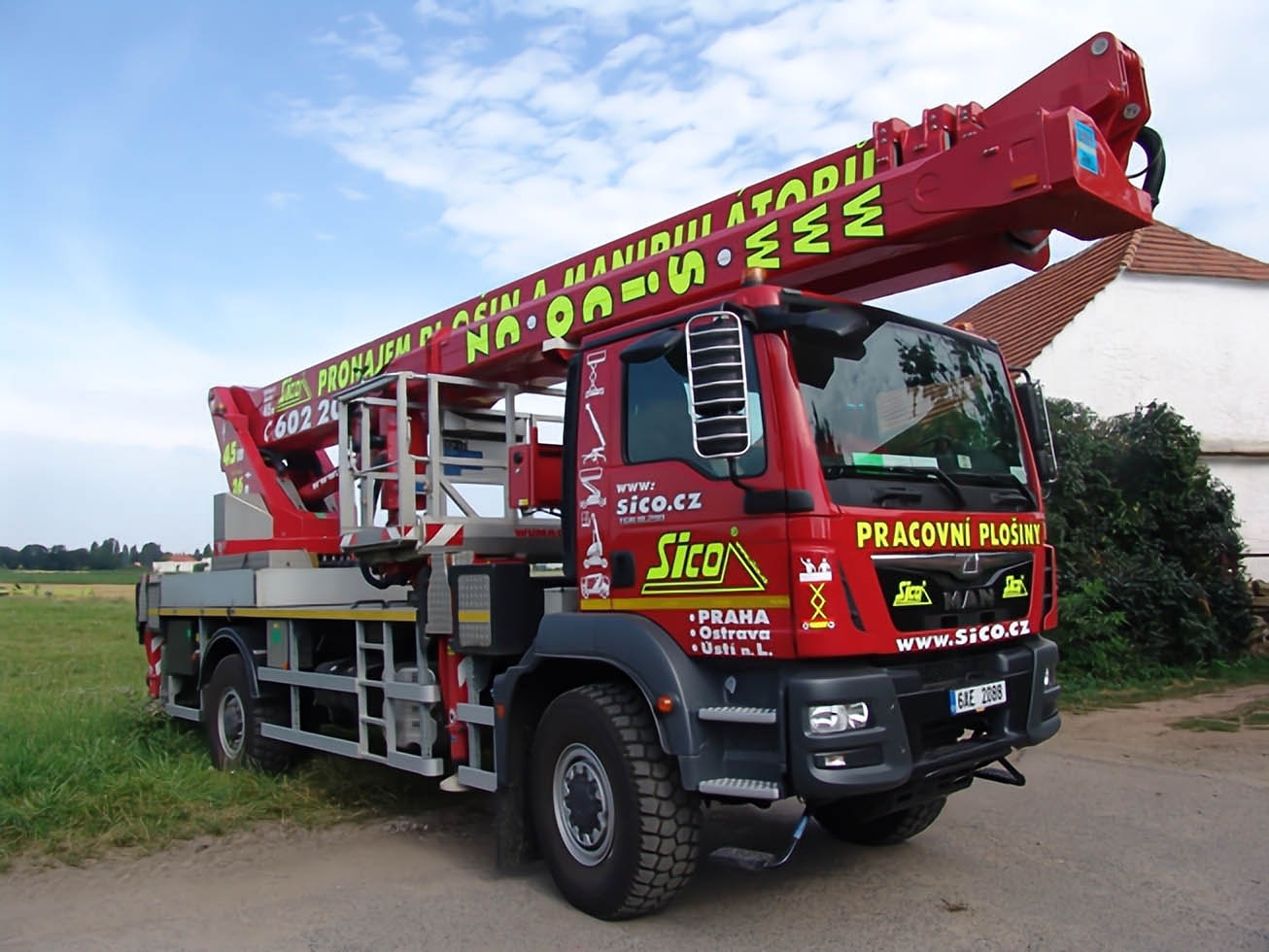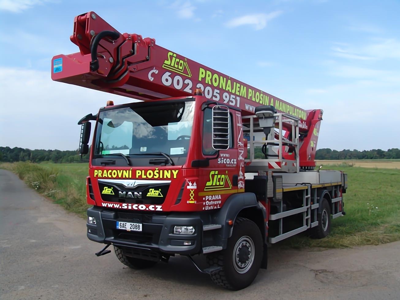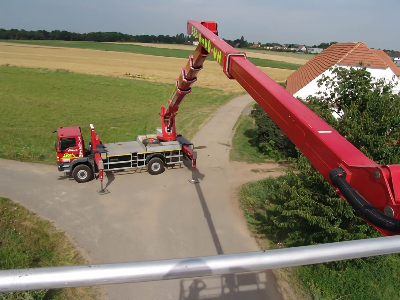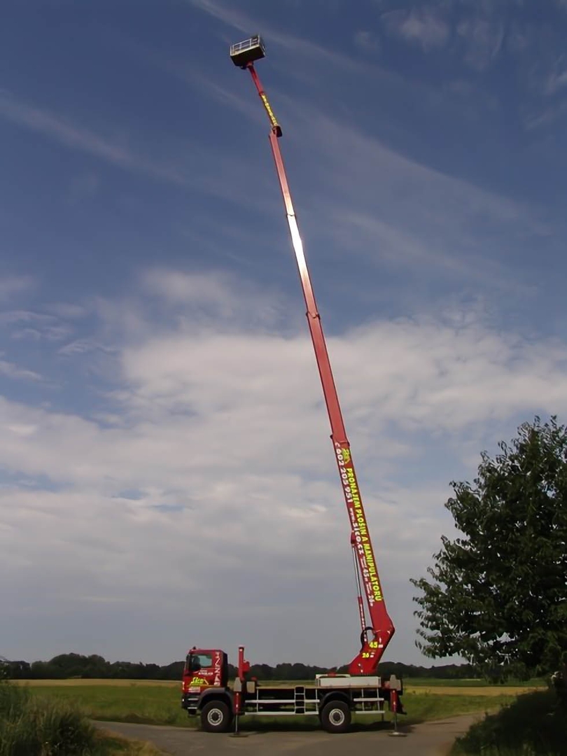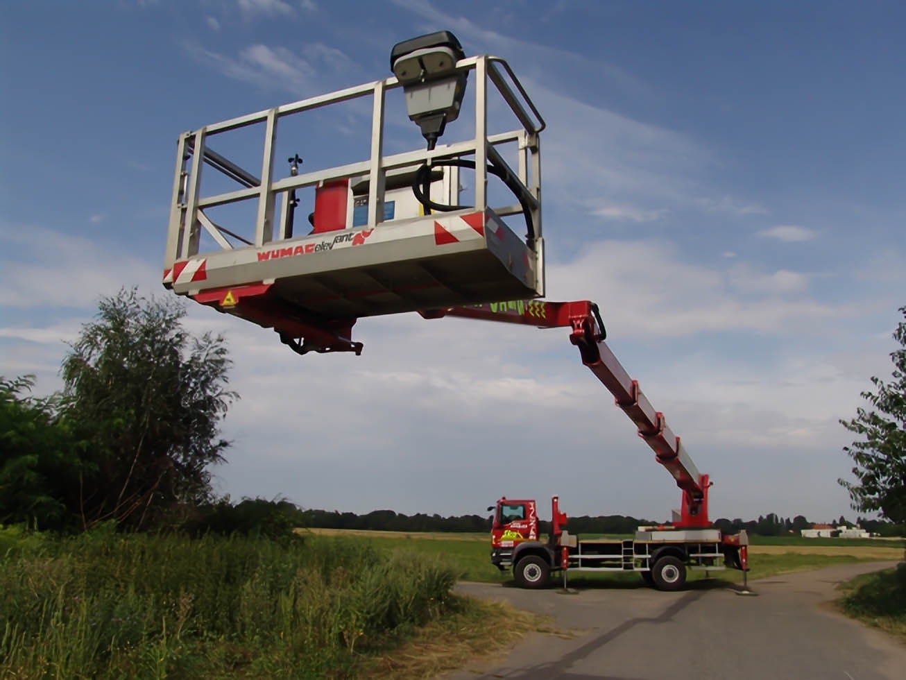 The construction of two telescopic arms - the first 4 section and the second 2 section, will allow a lateral reach of more than 20 meters at a height of up to 35 meters (with a platform load of 100 kg out of a total of 600 kg). The 4×4 drive and robust chassis with good approach angles allow the machine to move in the field and 4 supports ensure the necessary stability when working. The Wumag superstructure is designed to allow a range of 6 meters below the level of the chassis. The WT450 can therefore be used to inspect smaller bridge structures. When using the lateral reach to only one side, it is possible to place the platform on 2 extended and 2 retracted supports and thus reduce the space required for the set machine by approximately 2 meters. The work platform can be equipped with board material holders with a load capacity of 350 kg. The truck platform meets strict safety regulations and international standards.
