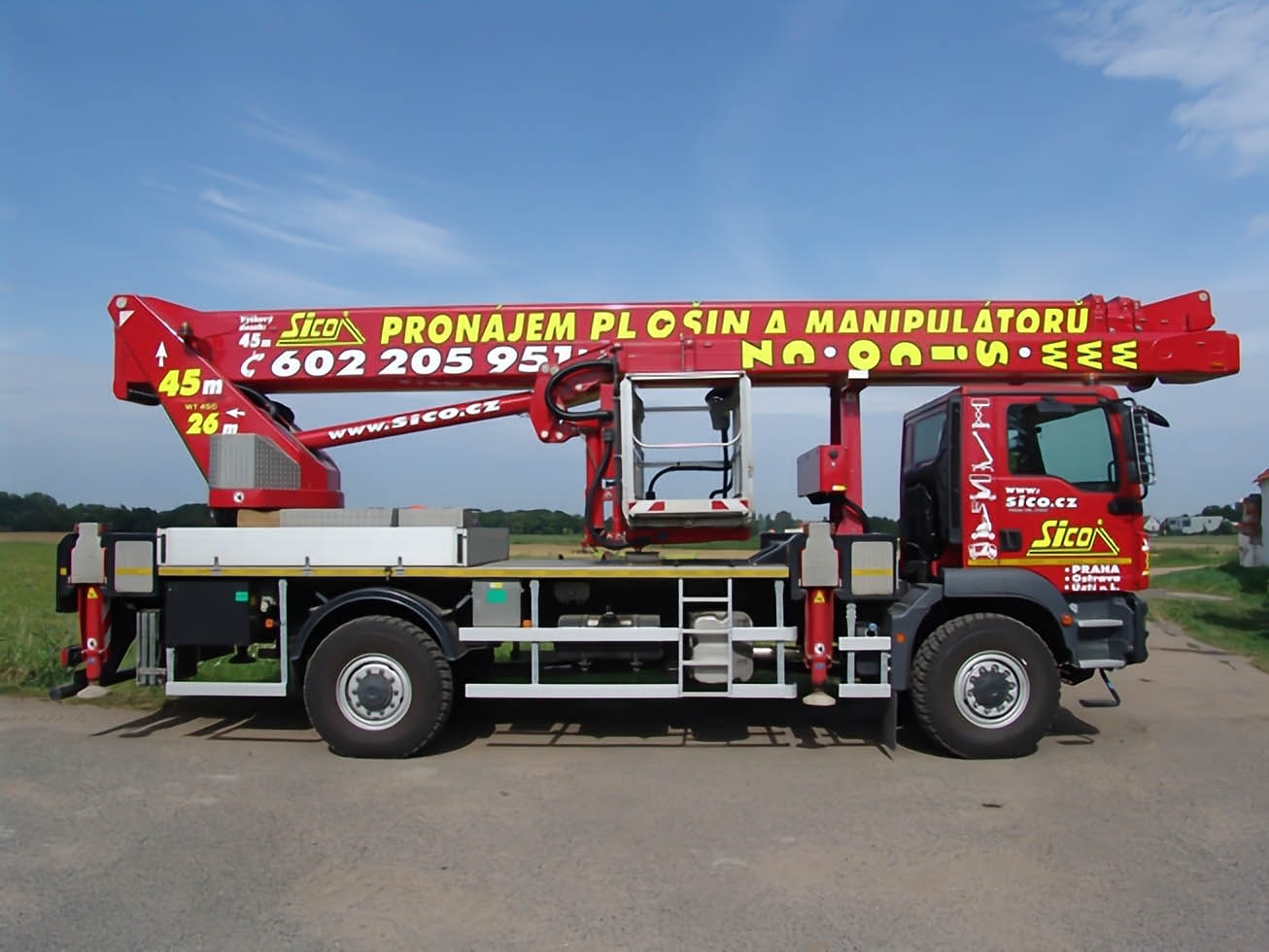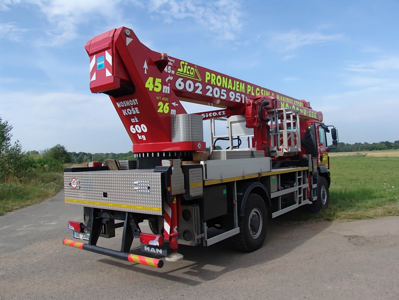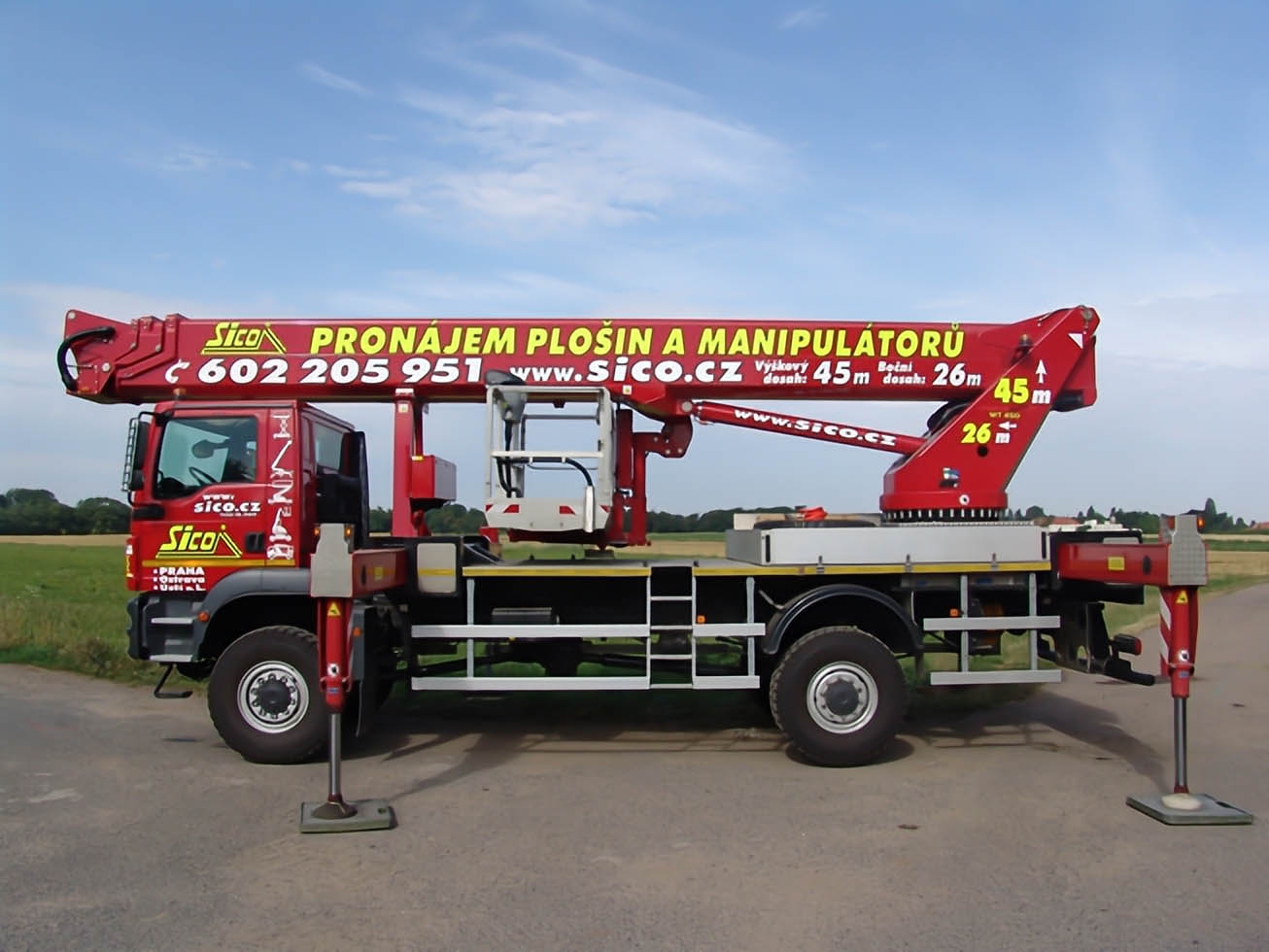 Working height 45 meters, lateral reach up to 26 meters, platform load capacity 600 kilograms and even a negative reach 6 meters below the level of the chassis, this is our WT450!