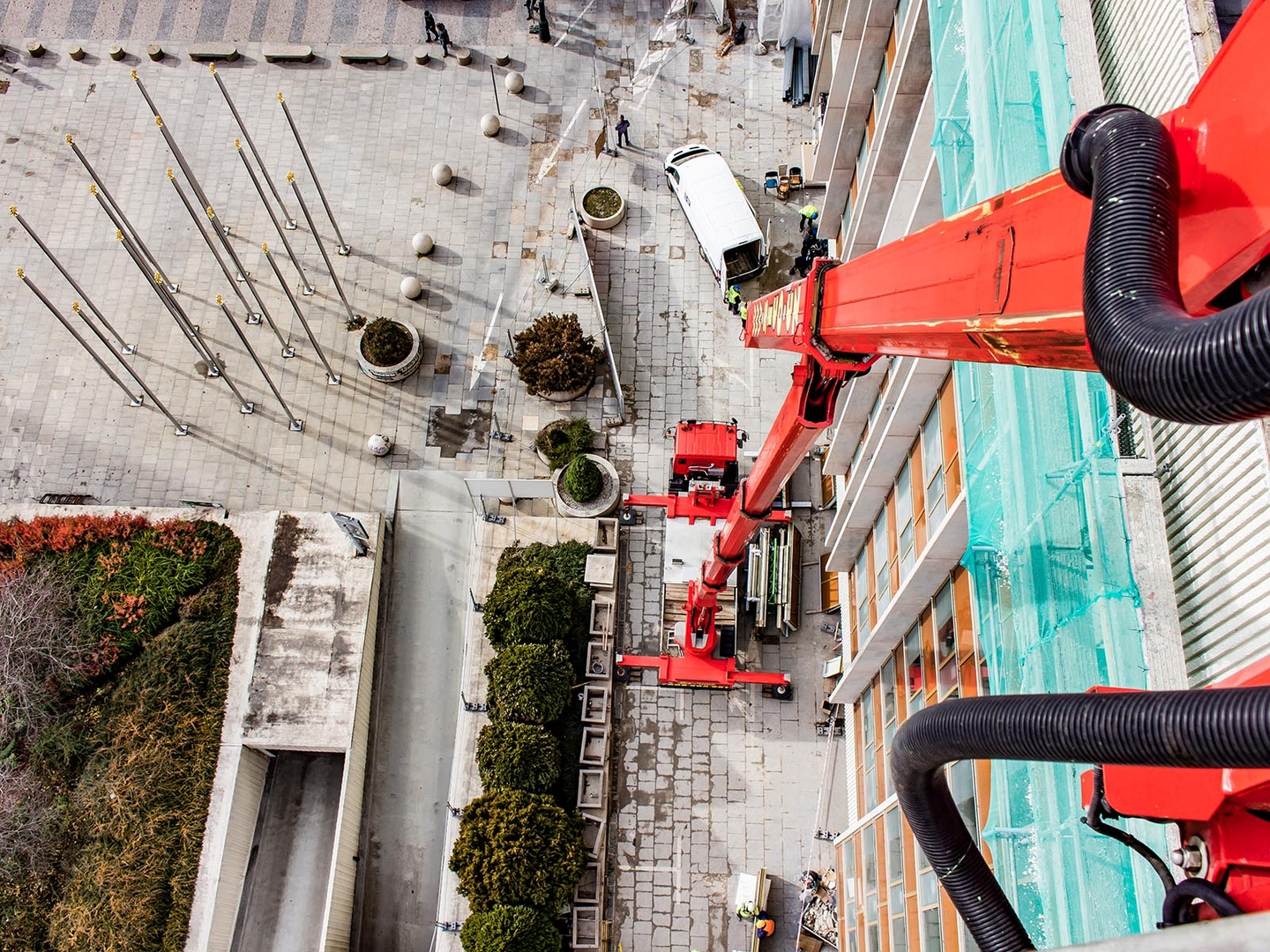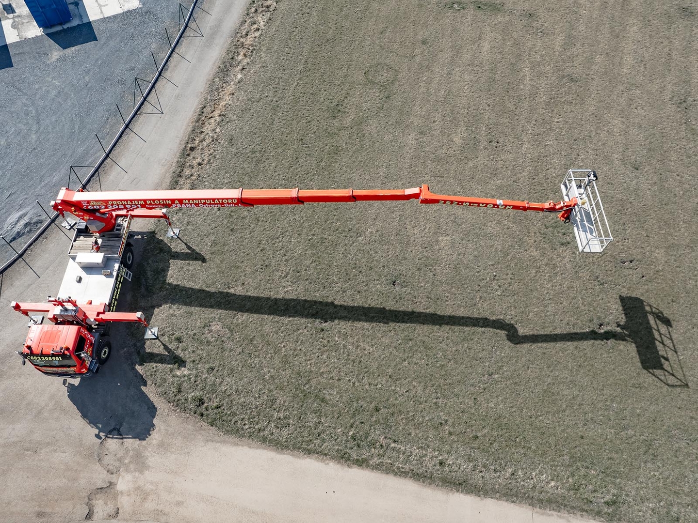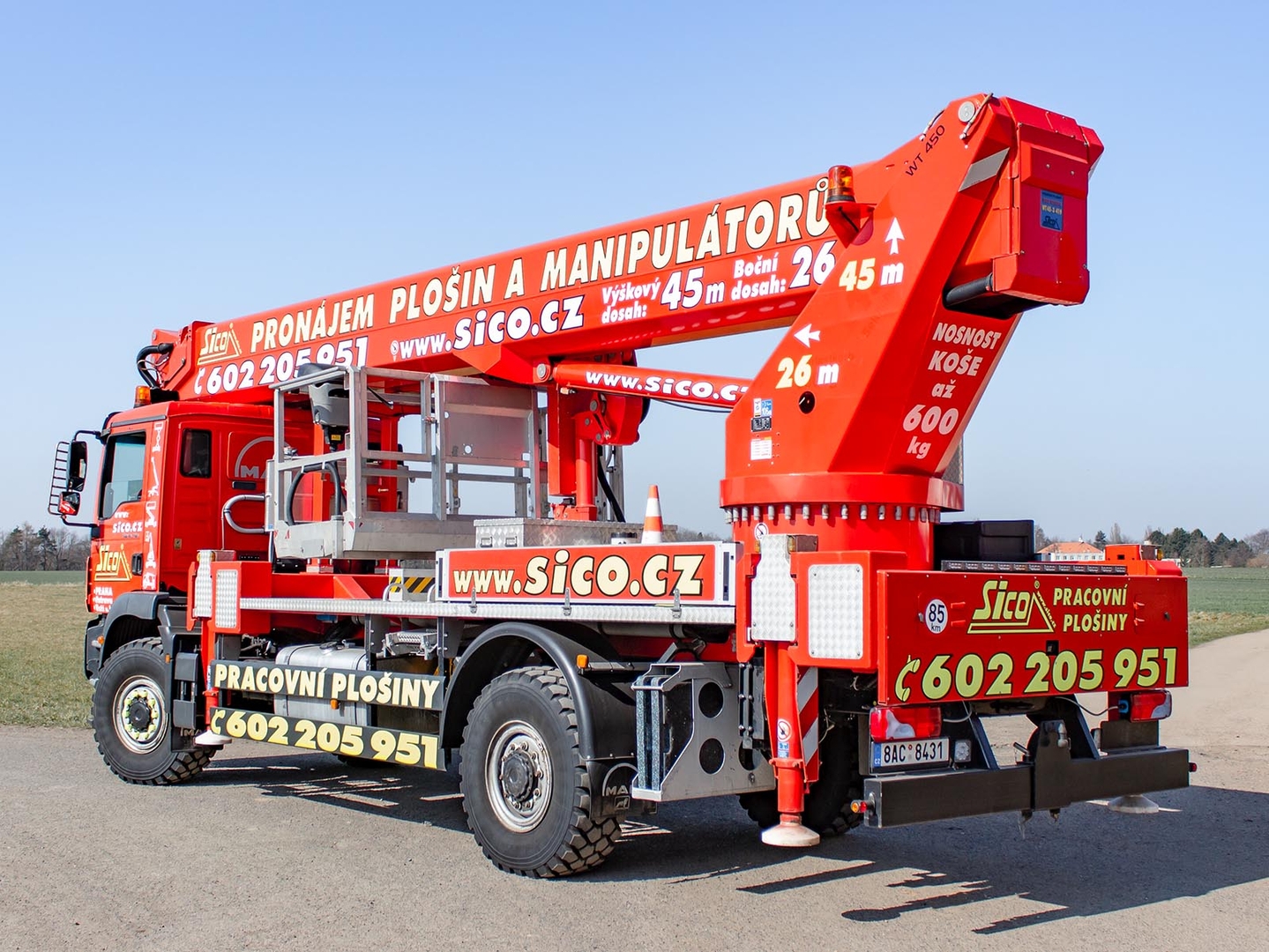 Working height 45 meters, lateral reach up to 26 meters, platform load capacity 600 kilograms and even a negative reach 6 meters below the level of the chassis, this is our WT450!