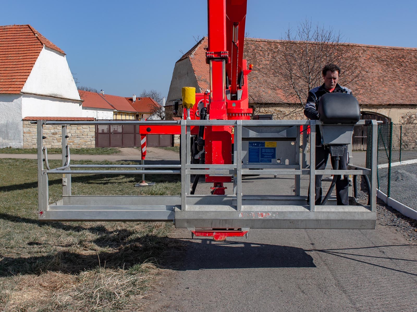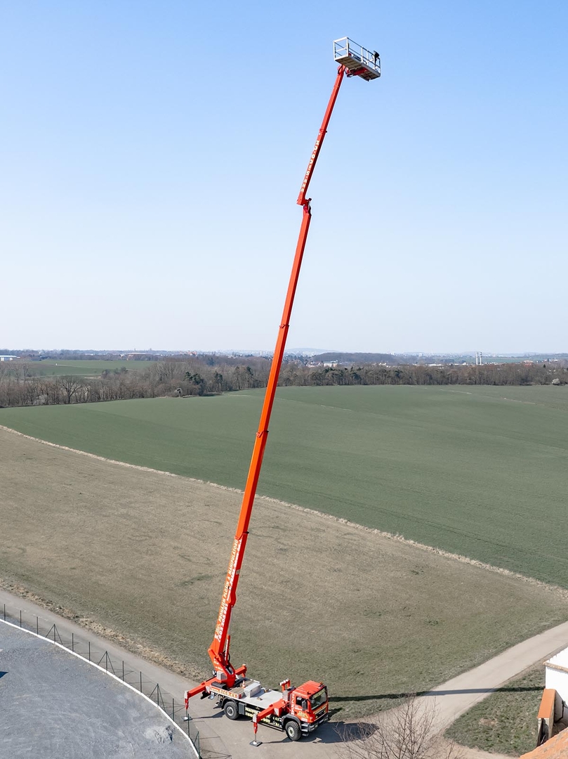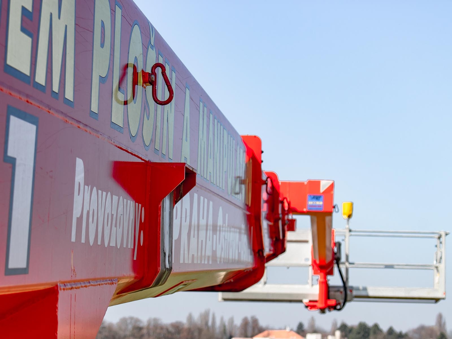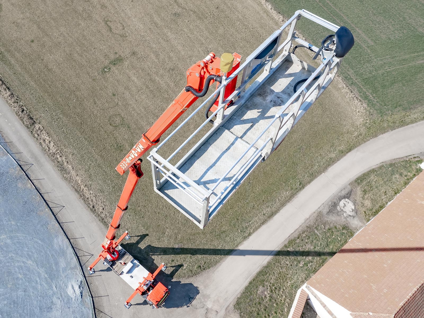 The construction of two telescopic arms - the first 4 section and the second 2 section, will allow a lateral reach of more than 20 meters at a height of up to 35 meters (with a platform load of 100 kg out of a total of 600 kg). The 4×4 drive and robust chassis with good approach angles allow the machine to move in the field and 4 supports ensure the necessary stability when working. The Wumag superstructure is designed to allow a range of 6 meters below the level of the chassis. The WT450 can therefore be used to inspect smaller bridge structures. When using the lateral reach to only one side, it is possible to place the platform on 2 extended and 2 retracted supports and thus reduce the space required for the set machine by approximately 2 meters. The work platform can be equipped with board material holders with a load capacity of 350 kg. The truck platform meets strict safety regulations and international standards.
