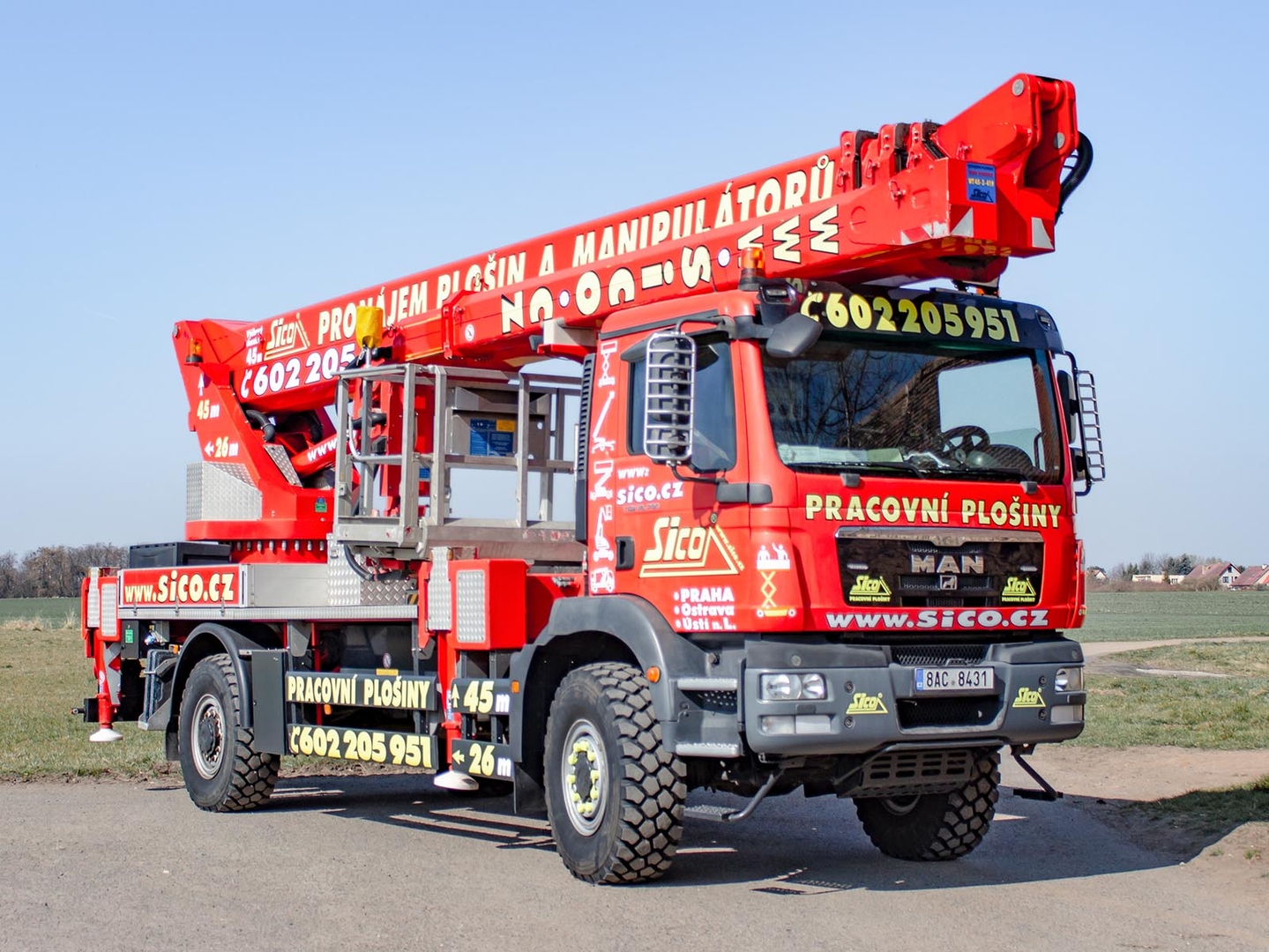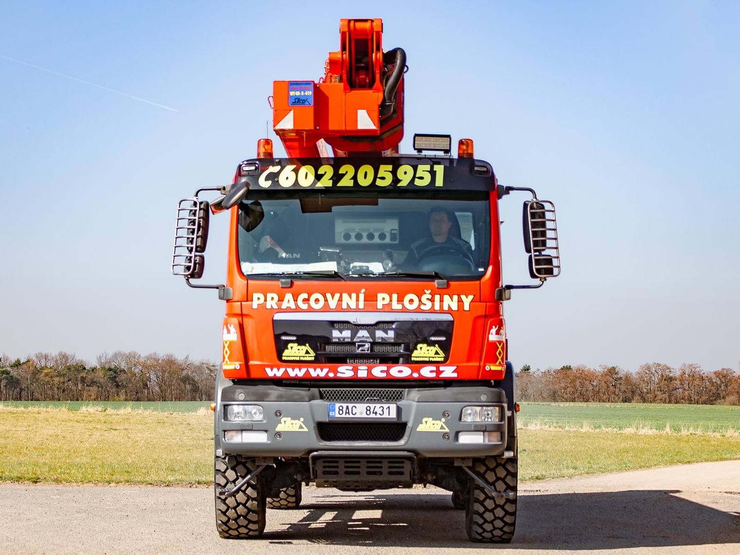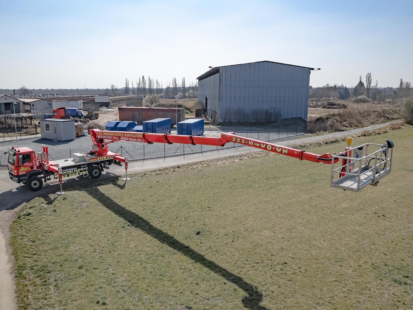 The construction of two telescopic arms - the first 4 section and the second 2 section, will allow a lateral reach of more than 20 meters at a height of up to 35 meters (with a platform load of 100 kg out of a total of 600 kg). The 4×4 drive and robust chassis with good approach angles allow the machine to move in the field and 4 supports ensure the necessary stability when working. The Wumag superstructure is designed to allow a range of 6 meters below the level of the chassis. The WT450 can therefore be used to inspect smaller bridge structures. When using the lateral reach to only one side, it is possible to place the platform on 2 extended and 2 retracted supports and thus reduce the space required for the set machine by approximately 2 meters. The work platform can be equipped with board material holders with a load capacity of 350 kg. The truck platform meets strict safety regulations and international standards.