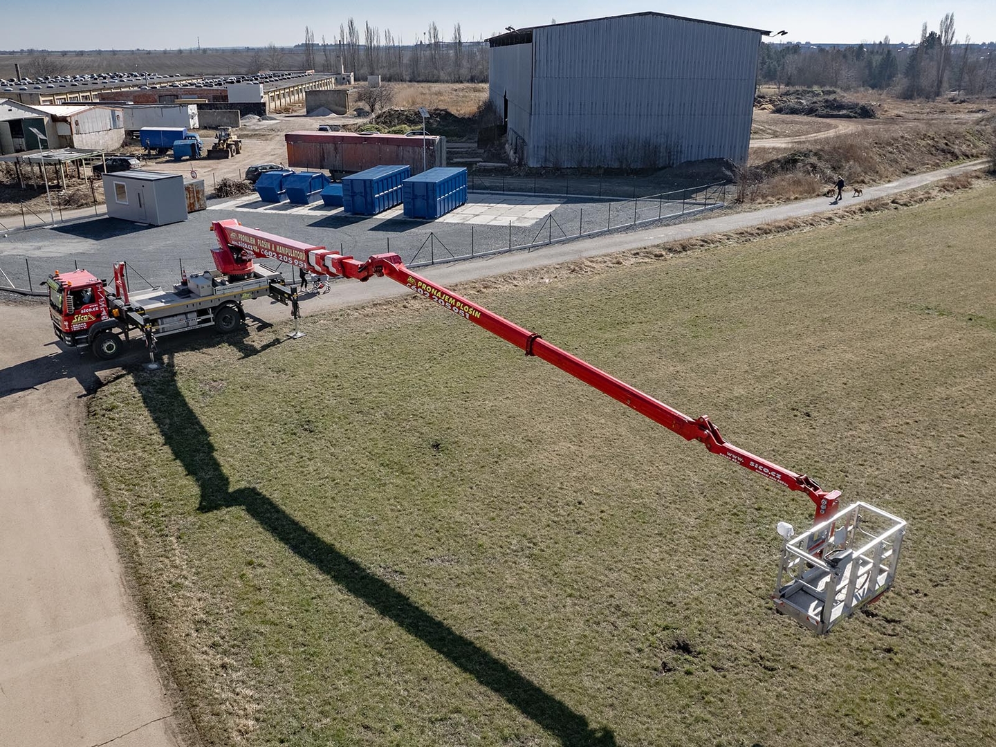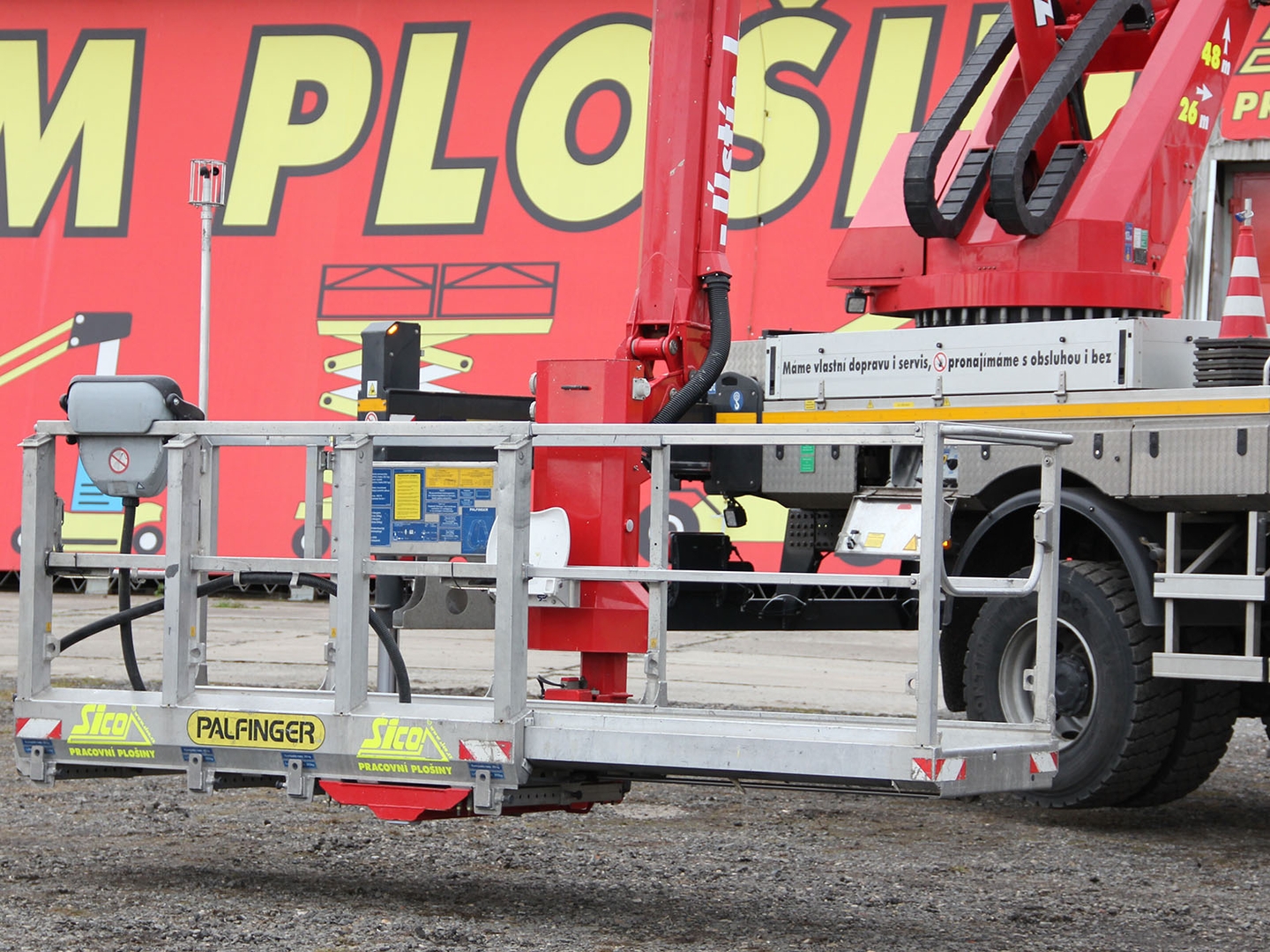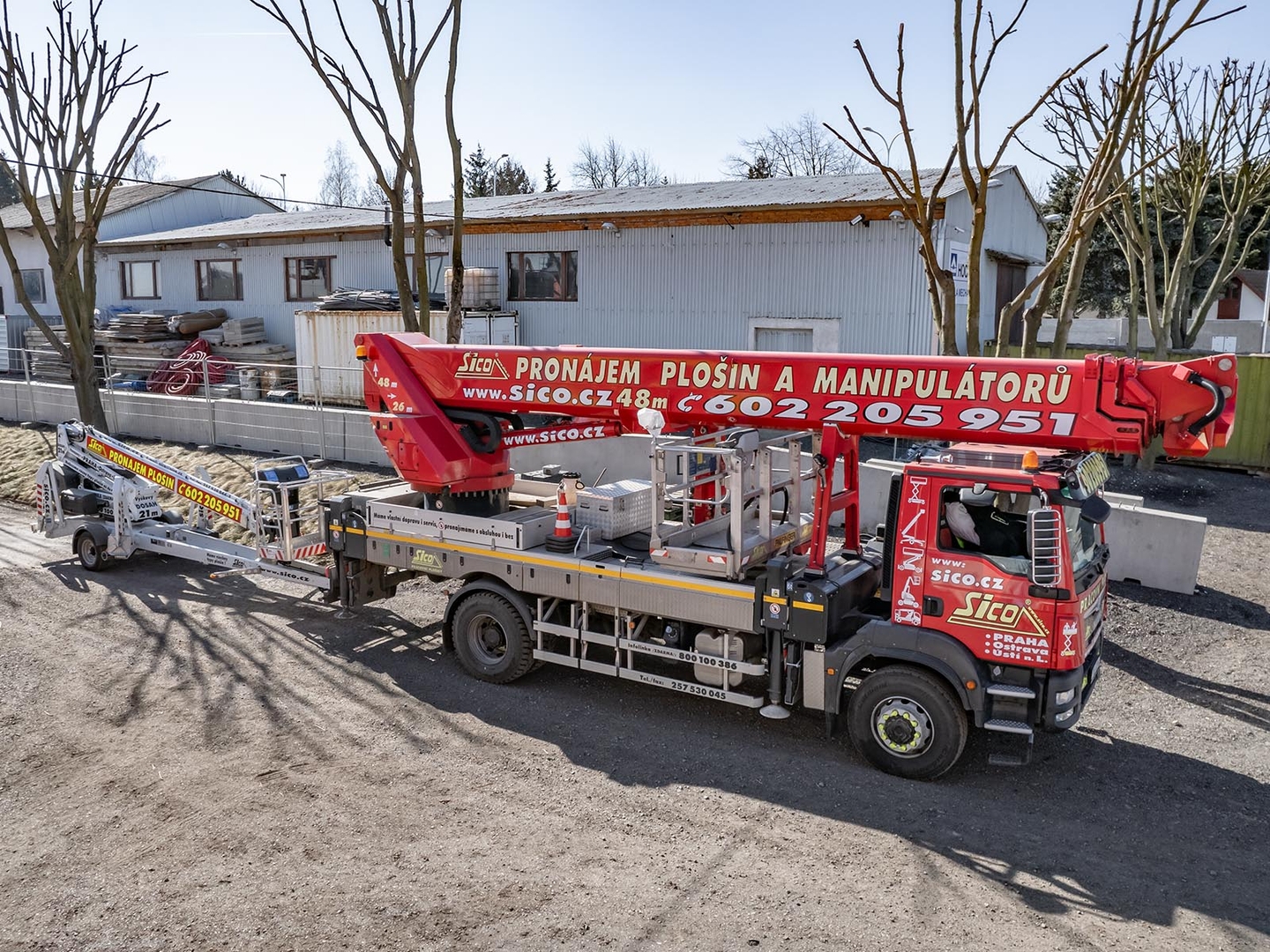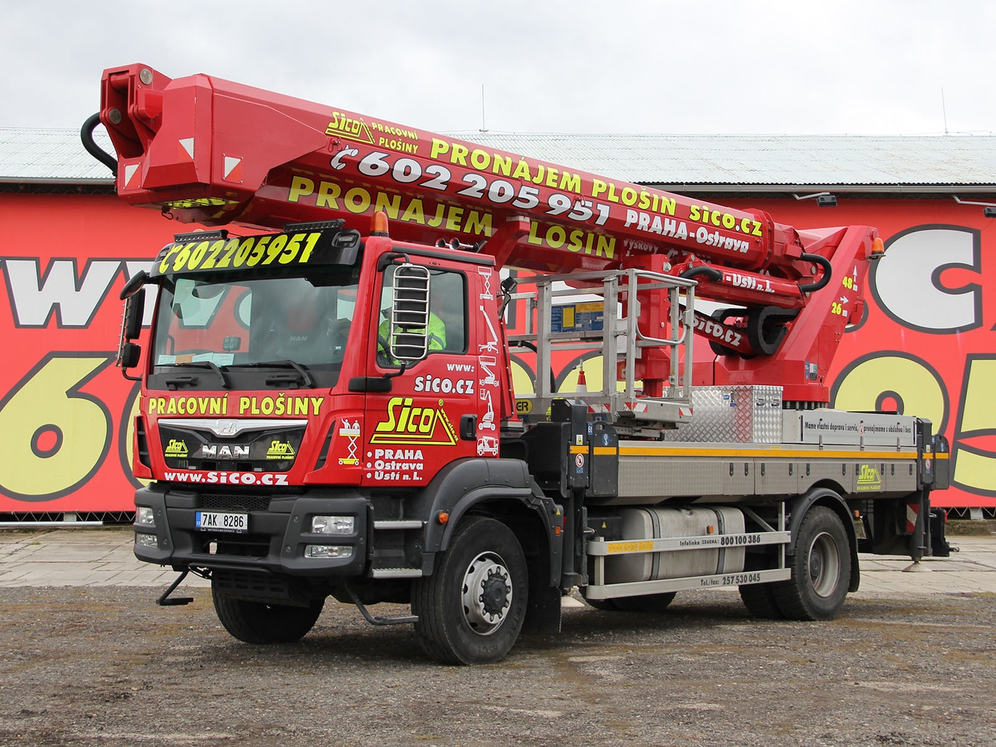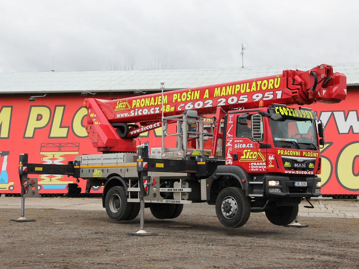 The platform has an electric current generator and a large work platform with a load capacity of up to 600 kg is equipped with sockets with a voltage of 230V and 380V. The machine can be equipped with plate material holders, which you can use, for example, when glazing buildings. The MAN TGM 18 chassis has all-wheel drive, so it can move in lighter terrain. The construction of the car allows for quick adjustment and the platform is thus suitable for work where frequent relocation is required. The platform consists of a turntable on the chassis, a boom with an articulated telescope and a work platform on the so-called JIB arm, which moves at an angle of 240°. This makes it possible to get the work platform even in hard-to-reach places. The machine has a negative working range. The maximum range is 48 meters in height and 28 meters to the side. The truck platform meets strict safety regulations and international standards. The stability of the platform is ensured by the subframe of the vehicle with four retractable supports that absorb the load of the platform.