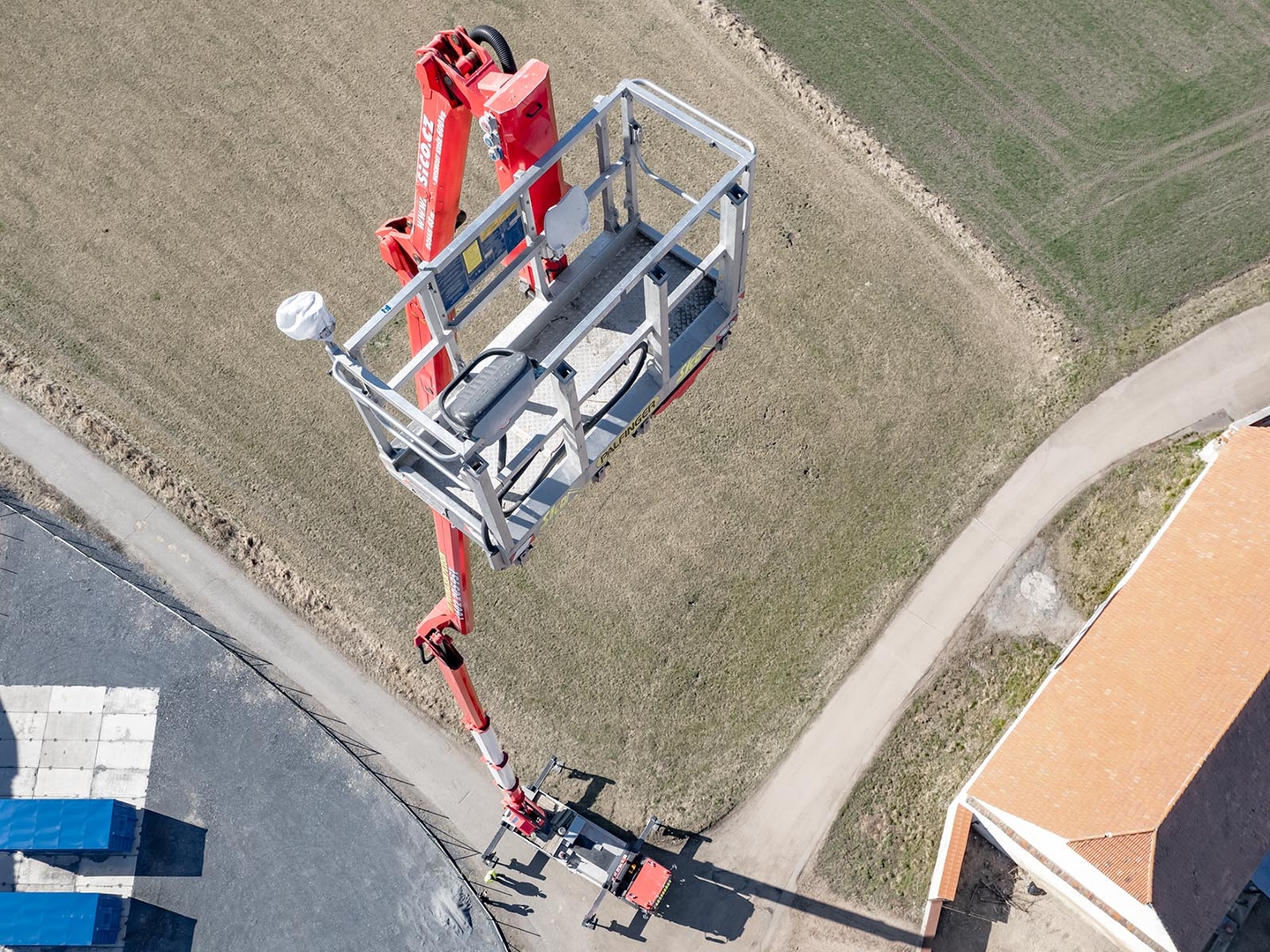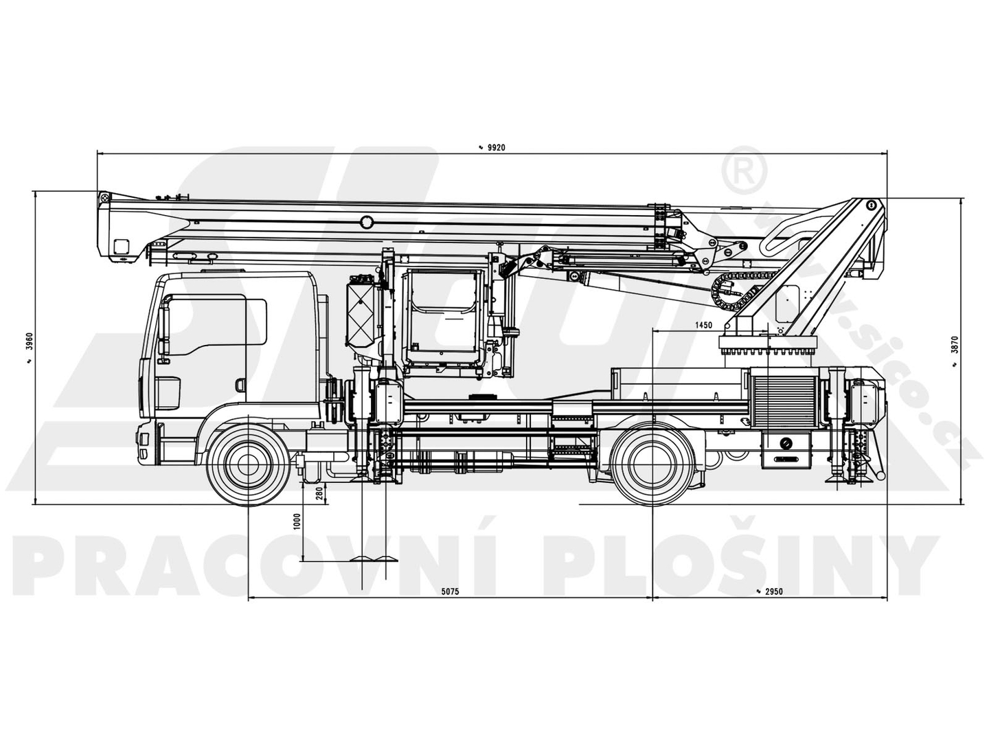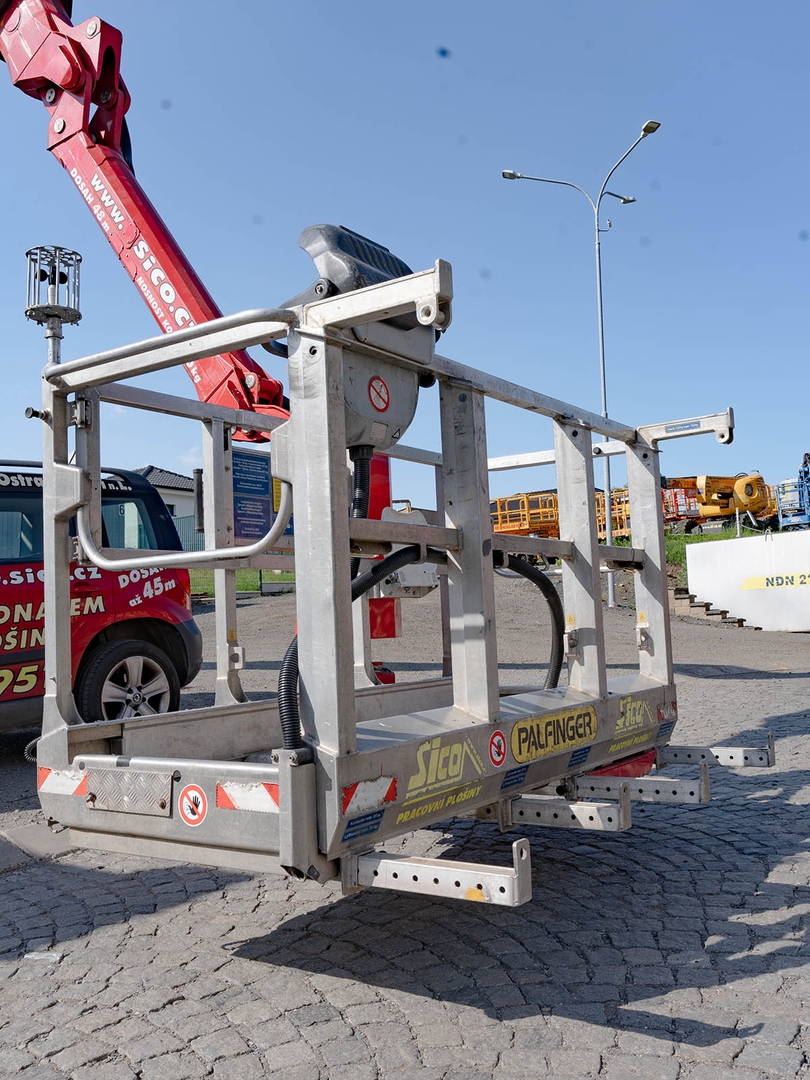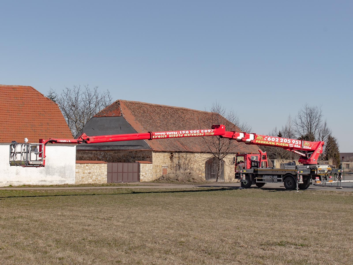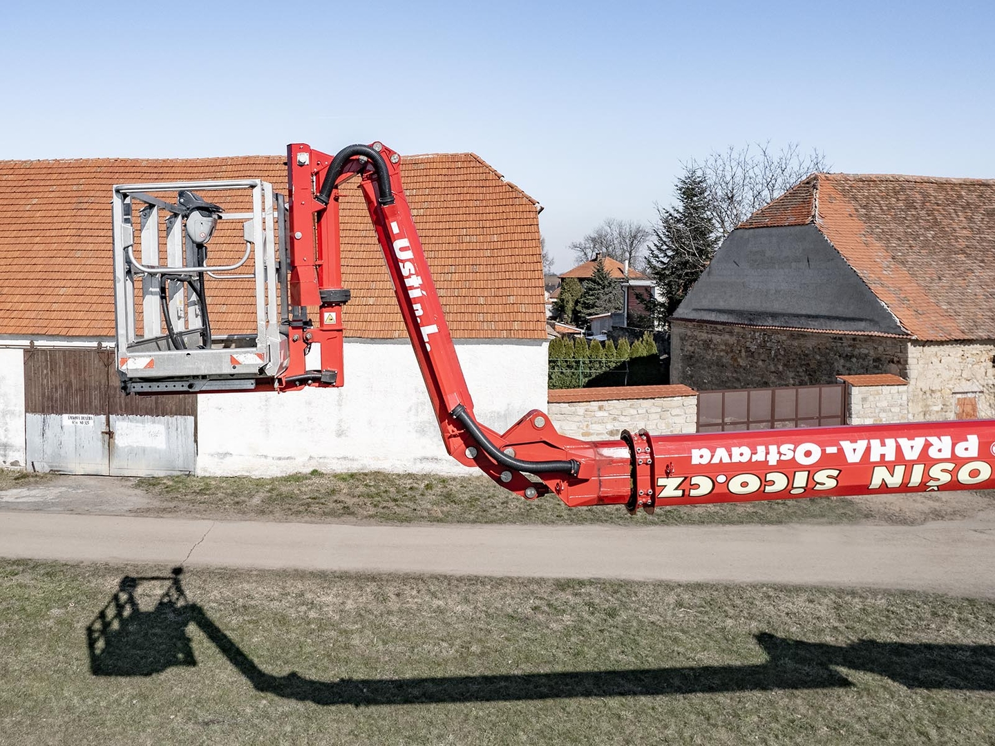 The platform has an electric current generator and a large work platform with a load capacity of up to 600 kg is equipped with sockets with a voltage of 230V and 380V. The machine can be equipped with plate material holders, which you can use, for example, when glazing buildings. The MAN TGM 18 chassis has all-wheel drive, so it can move in lighter terrain. The construction of the car allows for quick adjustment and the platform is thus suitable for work where frequent relocation is required. The platform consists of a turntable on the chassis, a boom with an articulated telescope and a work platform on the so-called JIB arm, which moves at an angle of 240°. This makes it possible to get the work platform even in hard-to-reach places. The machine has a negative working range. The maximum range is 48 meters in height and 28 meters to the side. The truck platform meets strict safety regulations and international standards. The stability of the platform is ensured by the subframe of the vehicle with four retractable supports that absorb the load of the platform.