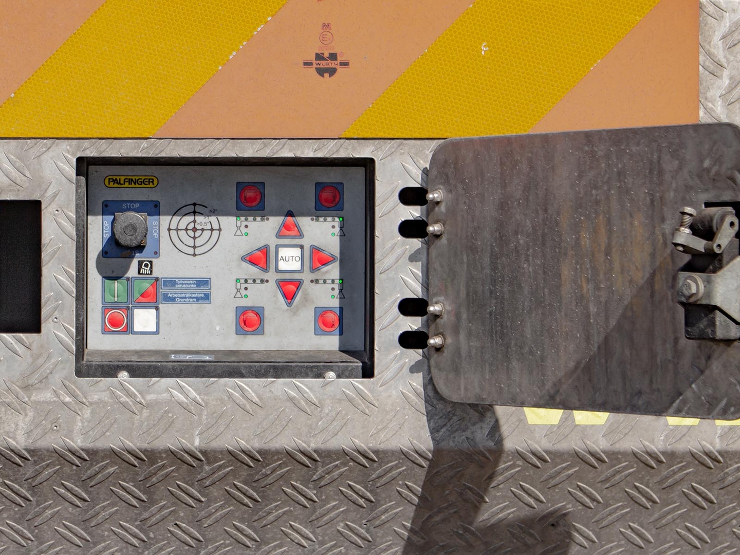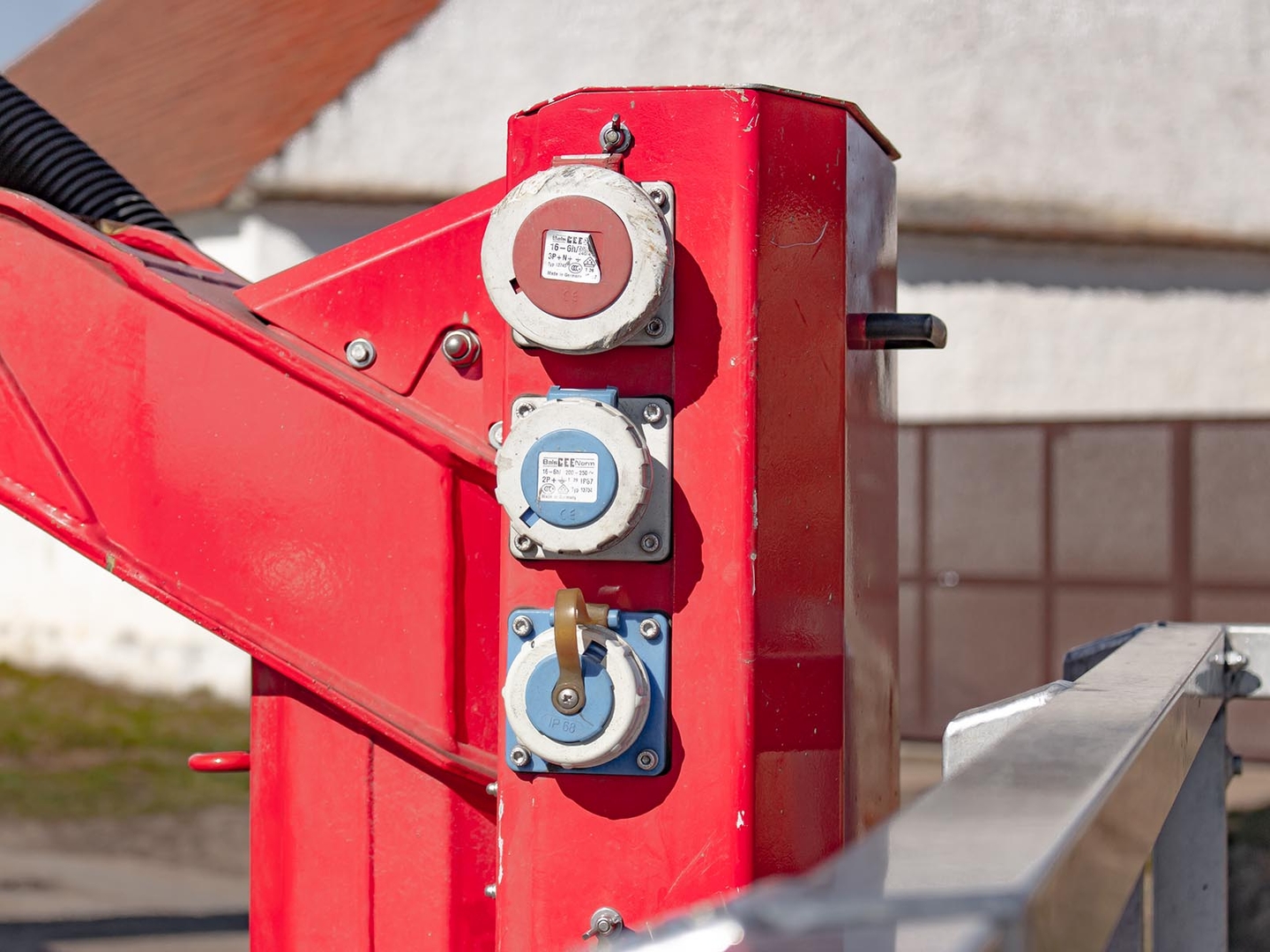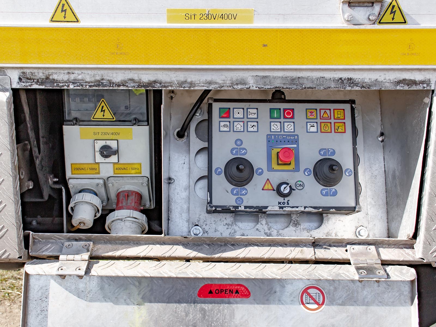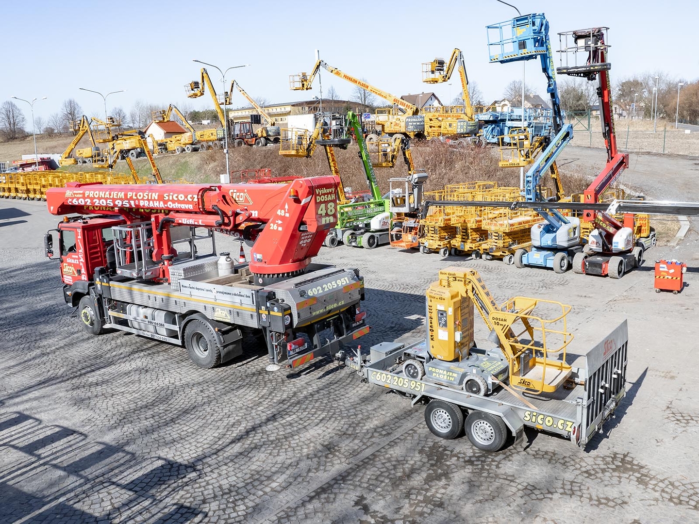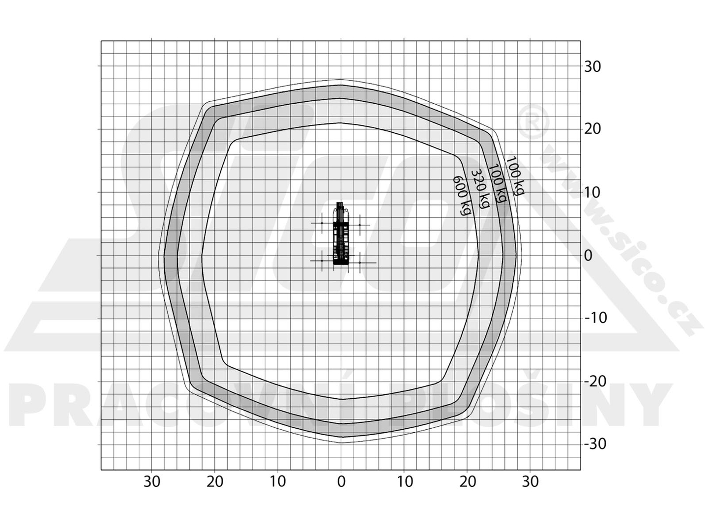 The platform has an electric current generator and a large work platform with a load capacity of up to 600 kg is equipped with sockets with a voltage of 230V and 380V. The machine can be equipped with plate material holders, which you can use, for example, when glazing buildings. The MAN TGM 18 chassis has all-wheel drive, so it can move in lighter terrain. The construction of the car allows for quick adjustment and the platform is thus suitable for work where frequent relocation is required. The platform consists of a turntable on the chassis, a boom with an articulated telescope and a work platform on the so-called JIB arm, which moves at an angle of 240°. This makes it possible to get the work platform even in hard-to-reach places. The machine has a negative working range. The maximum range is 48 meters in height and 28 meters to the side. The truck platform meets strict safety regulations and international standards. The stability of the platform is ensured by the subframe of the vehicle with four retractable supports that absorb the load of the platform.