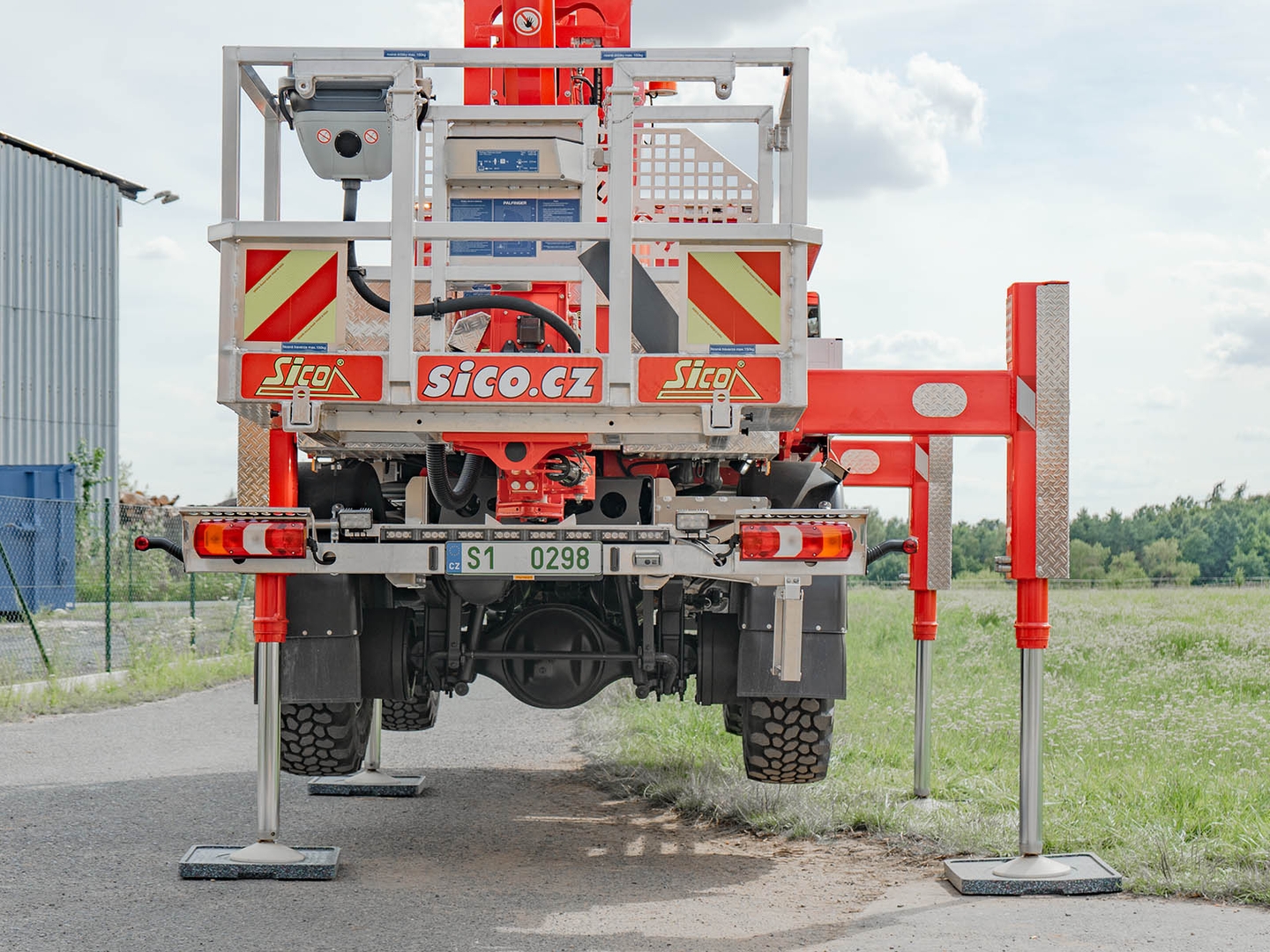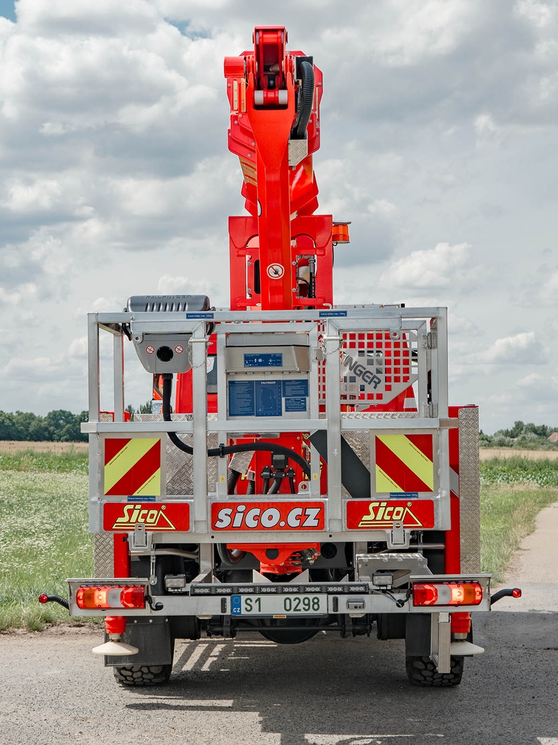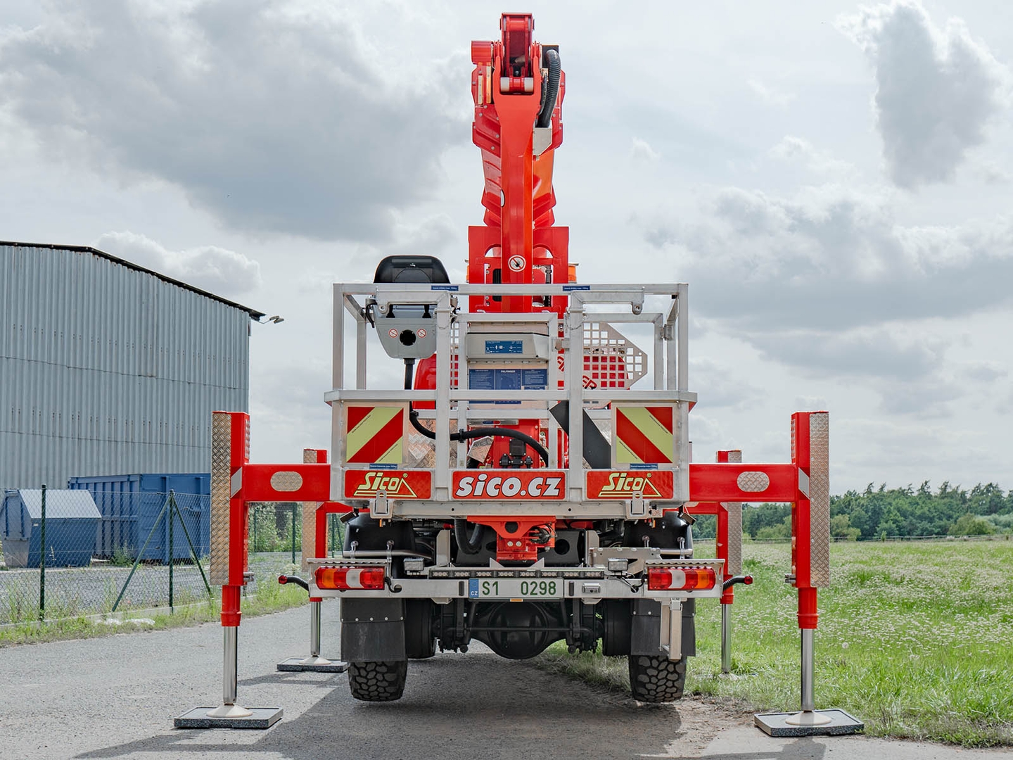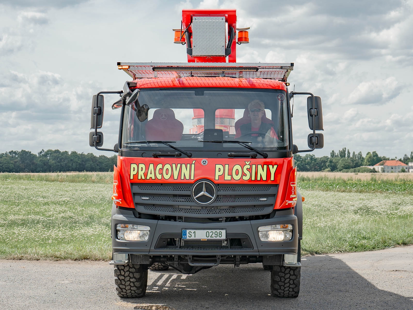 Palfinger P300KS je disponuje perfektními dosahy. Nástavba je montovaná na kompaktním podvozku M-B Atego 4x4. Do výšky 8 m je možný bez použití stabilizátorů - nabízí se využití při opravě veřejného osvětlení. Při použití ve svažitém terénu dovolí stabilizátory s výškou zdvihu 800 milimetrů vyrovnat sklon až 5°. Při využití opěr je k dispozici maximální pracovní výška až 30 metrů a stranový dosah až 20,5 metru (při 100 kilogramech v pracovním koši). JIB rameno je vertikálně pohyblivé v rozsahu 195° a výložník je schopný 540° rotace okolo své osy.