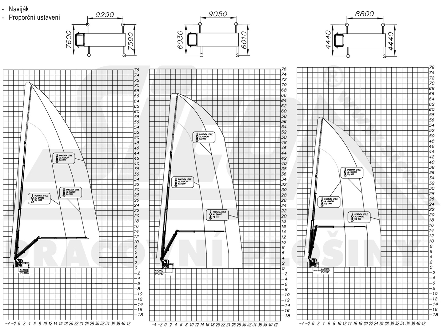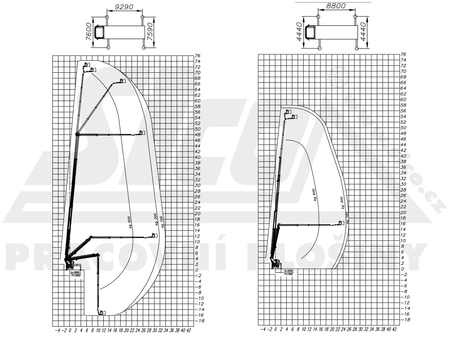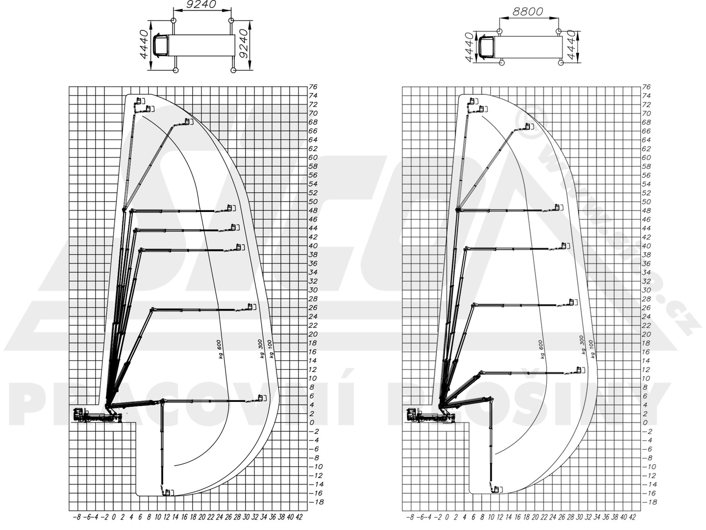 The data listed are using the maximum width of the machine. Refer to the working diagrams for specific reach, load capacity and support extension rates.