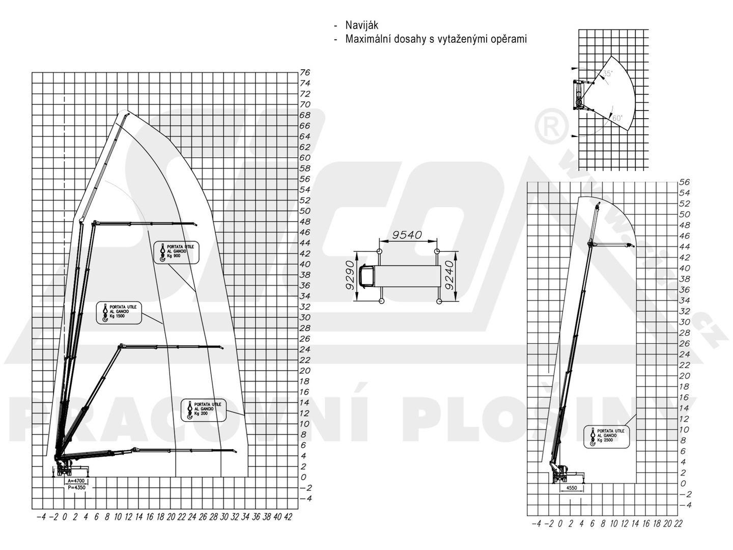 - range 14+ m, height 44 m (max. height 52 m, limited lateral range)