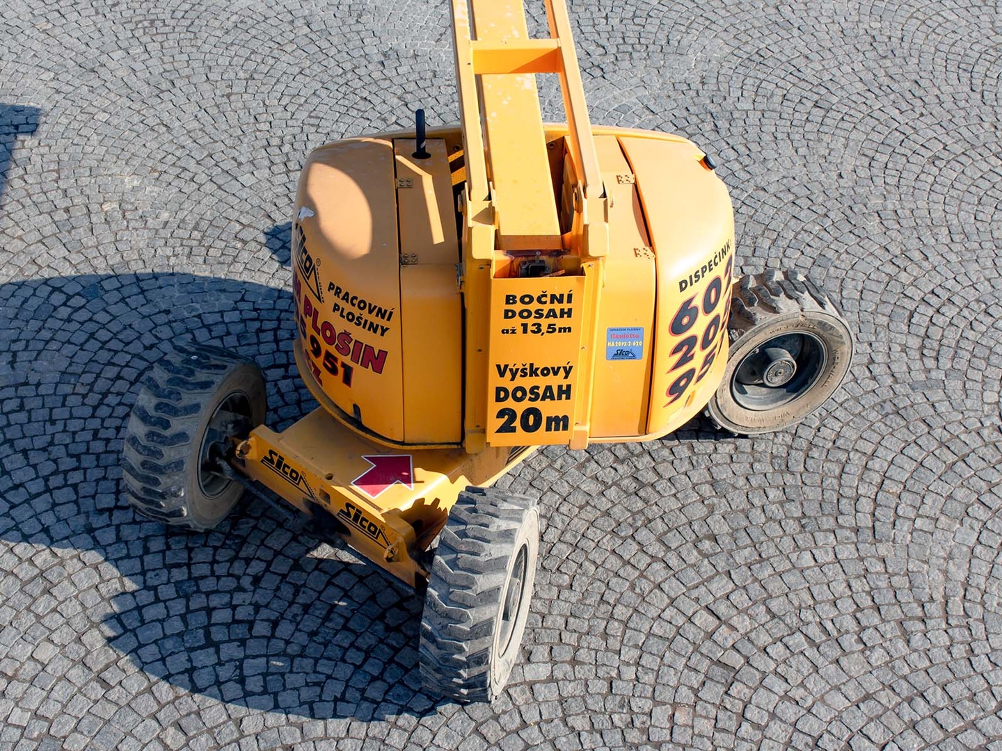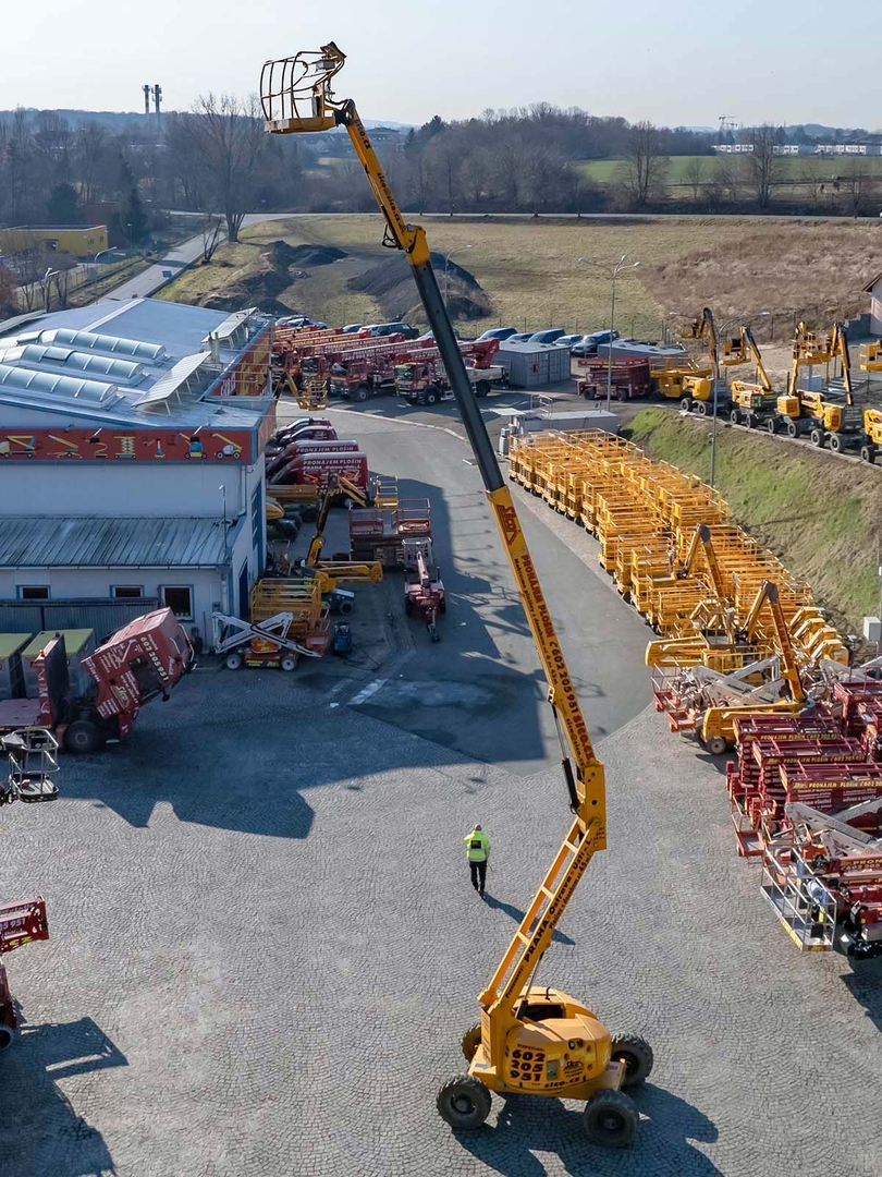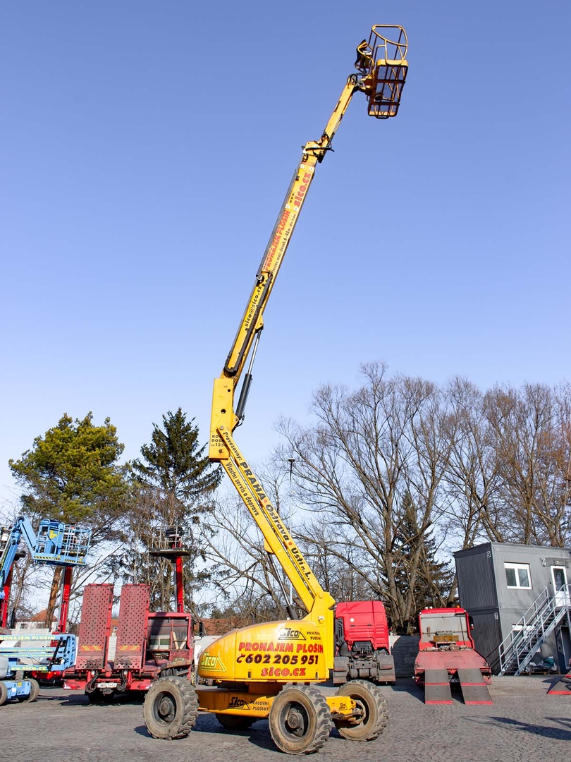 Together with a minimum outer turning radius of just 3,9 meters, it ensures maximum work efficiency. It has a fully proportional control and a rotating platform on a vertically movable JIB arm. And the advantage is also the zero overlap of the weight over the chassis part. The work platform can comfortably hold two workers even with tools, the load capacity is 230 kilograms. The machine is equipped with a hydraulic differential lock for moving in really difficult terrain. The machine meets all strict safety standards and regulations.