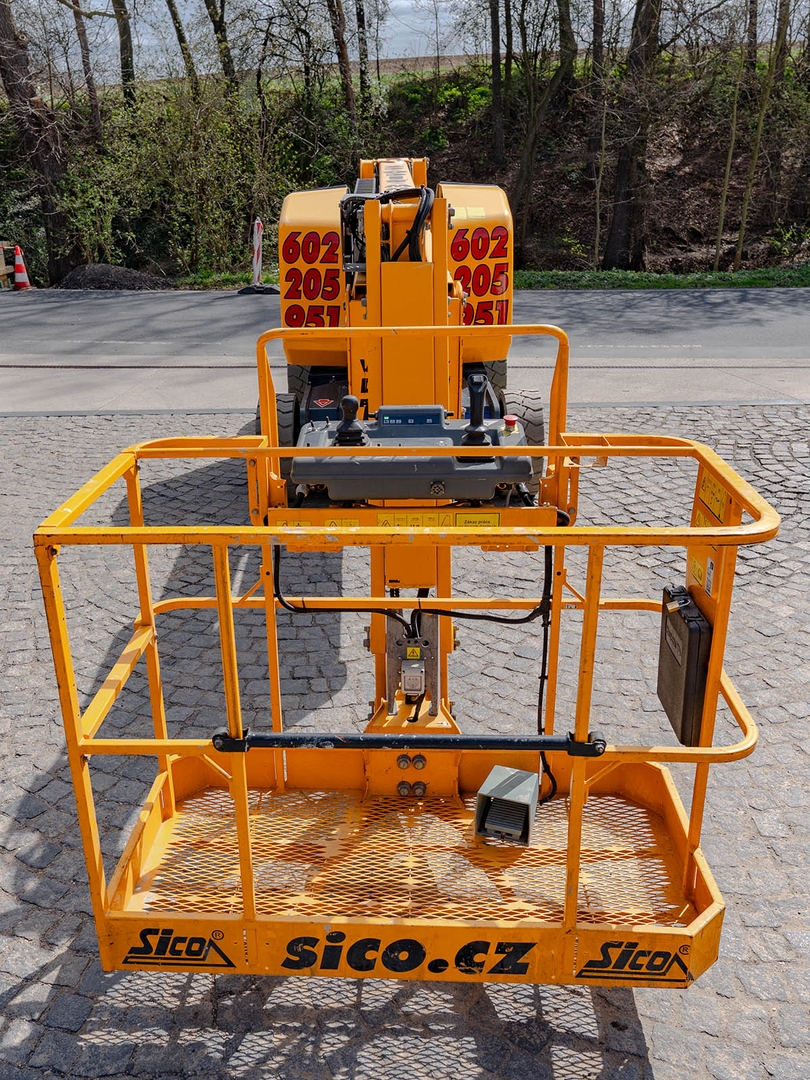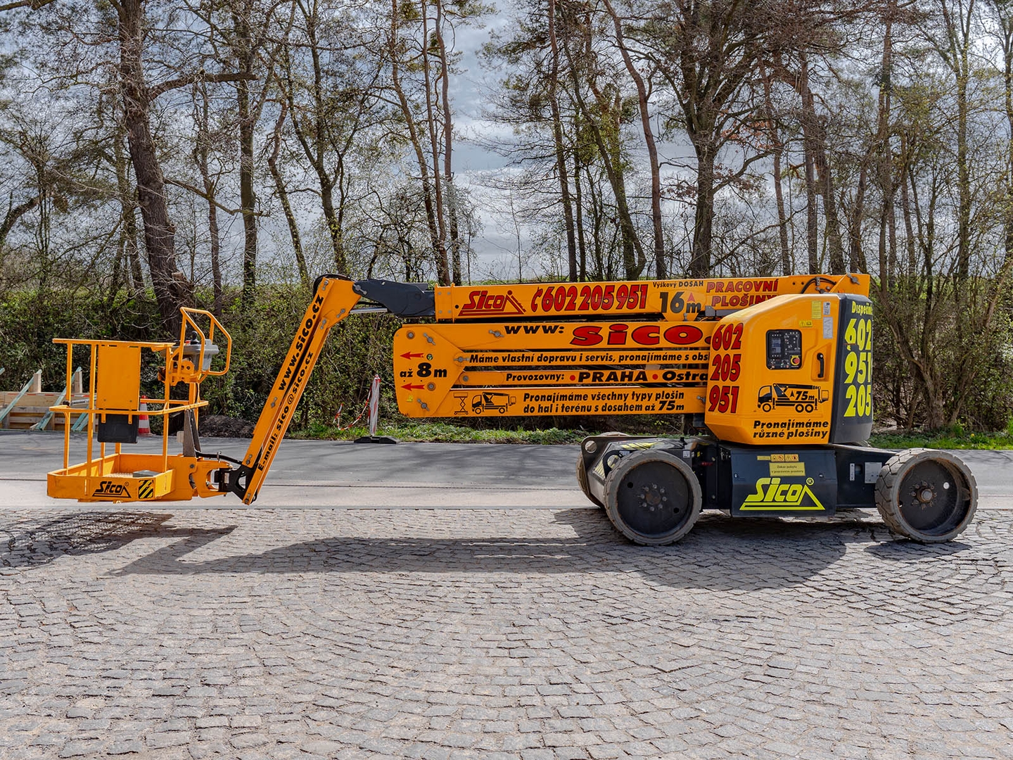 Battery-powered articulated work platform with a working height of up to 16 meters, a basket capacity of 230 kg, equipped with a vertically and horizontally moving JIB arm.