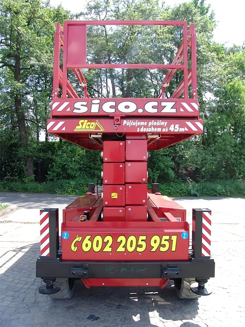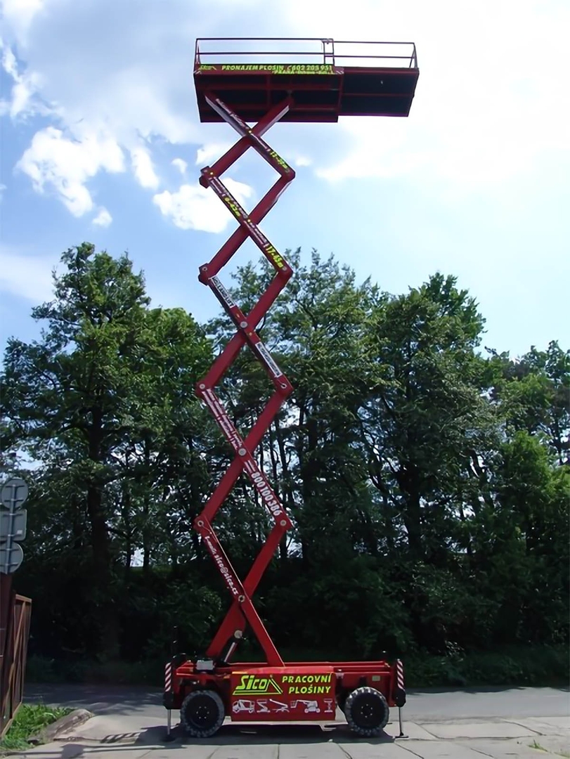 . It is therefore suitable for interiors, where you will appreciate zero emissions and quiet operation, but also for exteriors, even in lighter terrain. The machine has 4 hydraulic supports. The large work platform, measuring up to 6,07 meters by 1,85 meters, can hold tools and a bunch of workers who are not afraid of height. The platform is equipped with a 230 V socket with a maximum consumption of 2000 W. This is sufficient to drive hand tools. In addition, the platform can generate electricity with a diesel generator. The work platform meets all strict safety criteria.