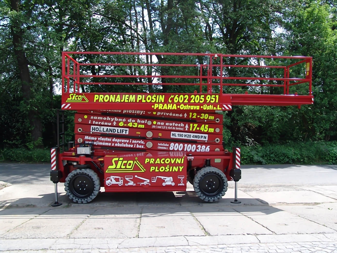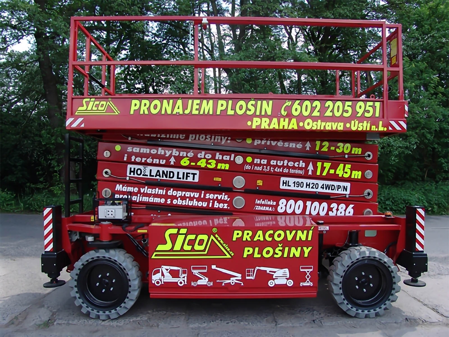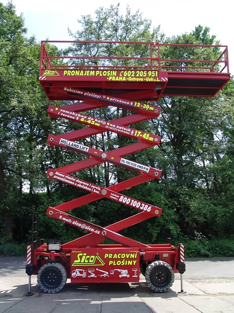The working height of 18,8 meters, the load capacity of the platform is 550 kilograms and the option to choose to run on batteries or via a diesel engine is the Holland-Lift HL-190 H20