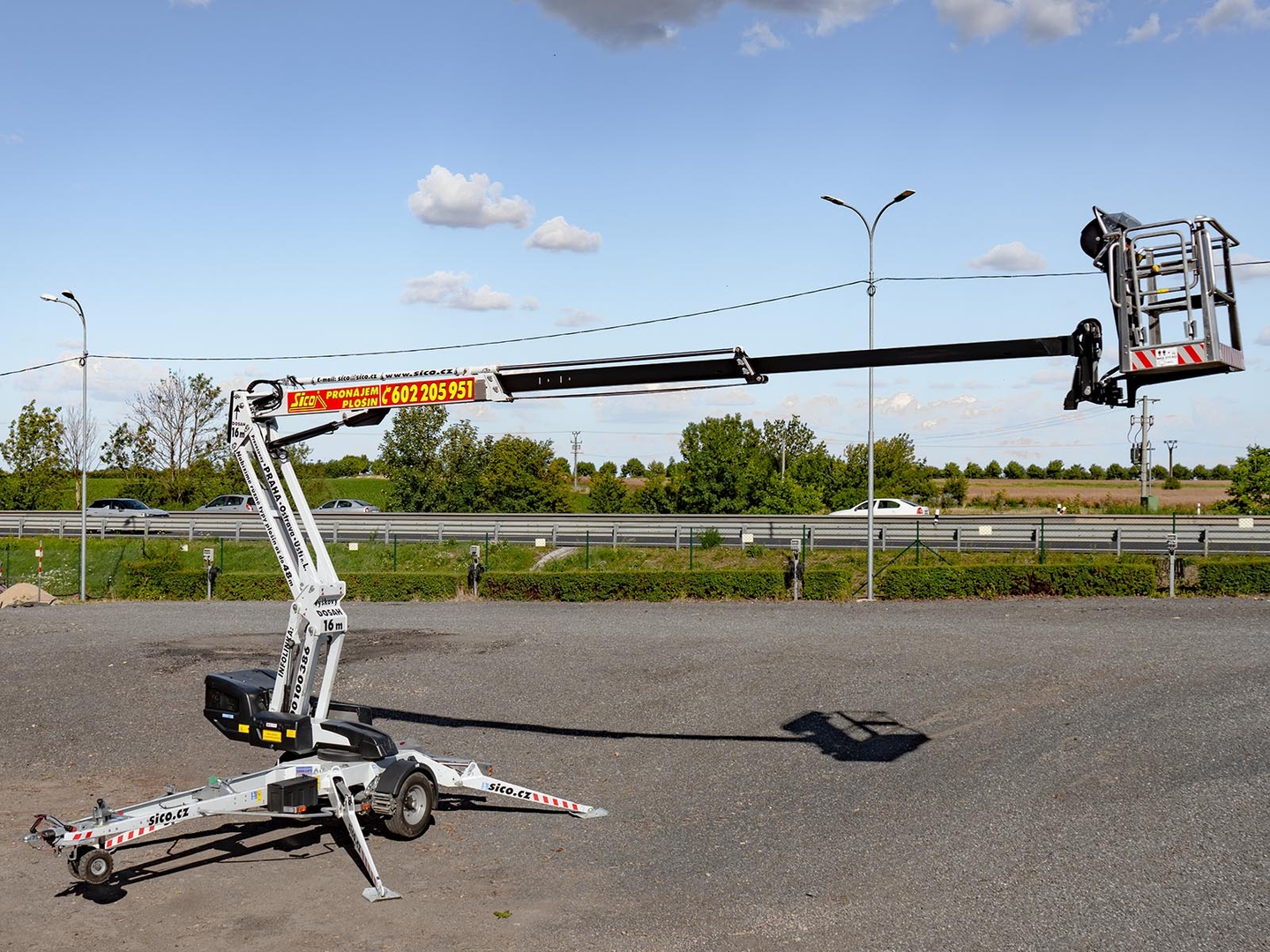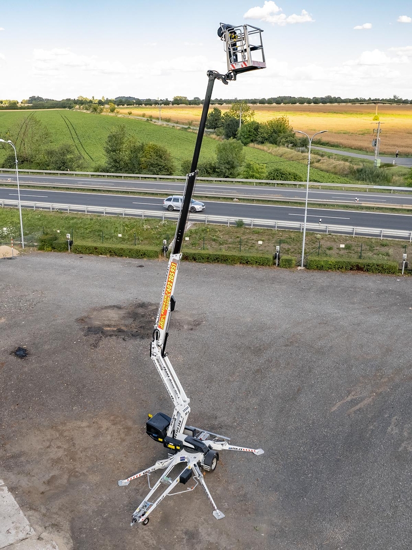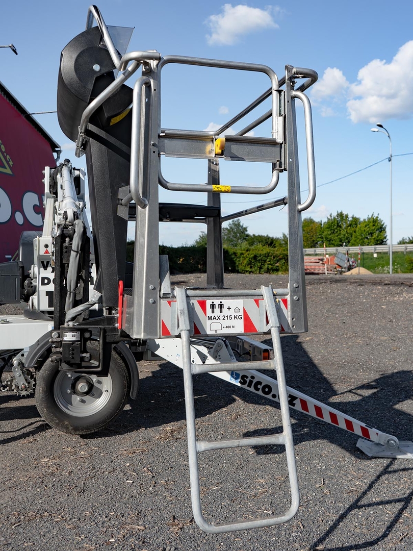 Emission-free operation is ensured by a set of batteries that drive the boom and the carriage. The machine is also equipped with a petrol unit, which can be used for longer crossings or for emergency recharging of the machine in order to store energy in the batteries. Thanks to the articulated-telescopic construction, endless rotation and a platform with the possibility of 90 ° rotation, the machine covers a large working area. Fixed positioning even on sloping terrain and the necessary stability is ensured by 4 independently controlled supports. The platform has comfortable control via a removable controller. Thanks to the mentioned low weight, the trailer platforms are suitable for quick and easy transport. The safety of the worker is ensured by a sophisticated system of double locking, hydraulic locks and overflow valves.