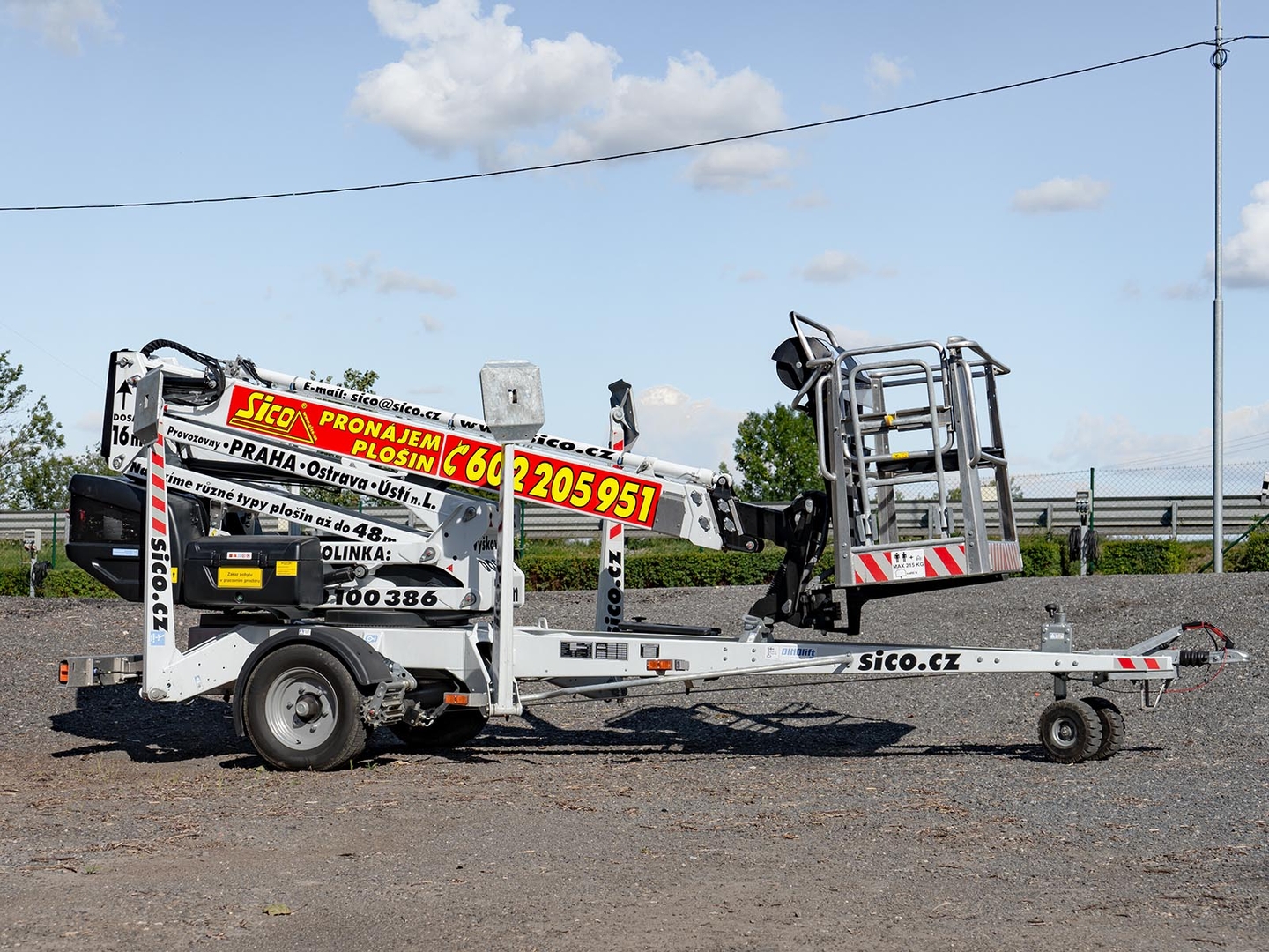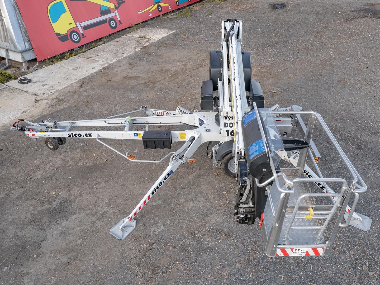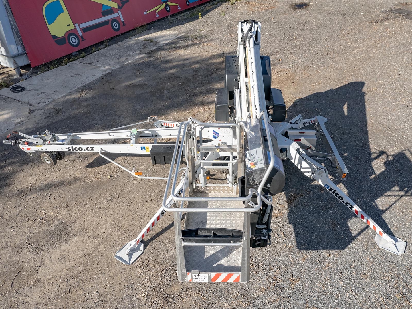Emission-free operation is ensured by a set of batteries that drive the boom and the carriage. The machine is also equipped with a petrol unit, which can be used for longer crossings or for emergency recharging of the machine in order to store energy in the batteries. Thanks to the articulated-telescopic construction, endless rotation and a platform with the possibility of 90 ° rotation, the machine covers a large working area. Fixed positioning even on sloping terrain and the necessary stability is ensured by 4 independently controlled supports. The platform has comfortable control via a removable controller. Thanks to the mentioned low weight, the trailer platforms are suitable for quick and easy transport. The safety of the worker is ensured by a sophisticated system of double locking, hydraulic locks and overflow valves.