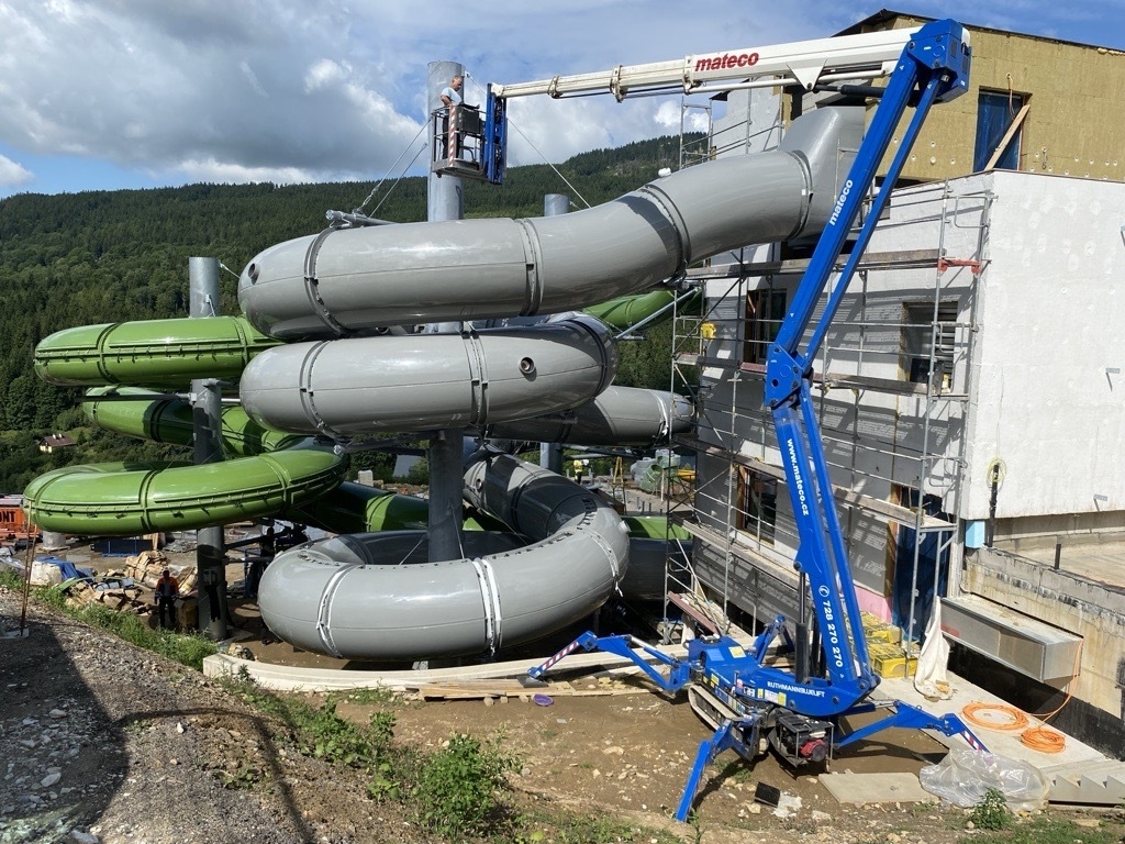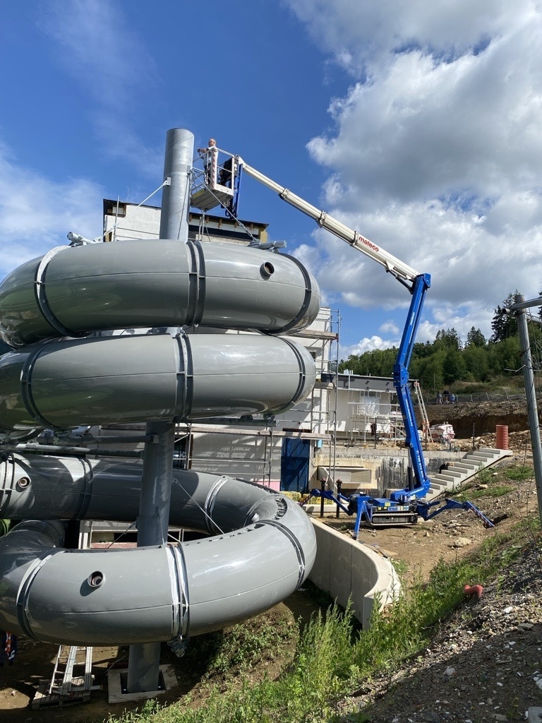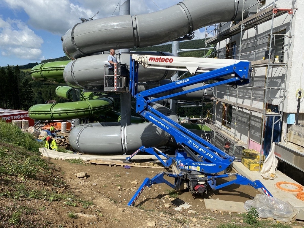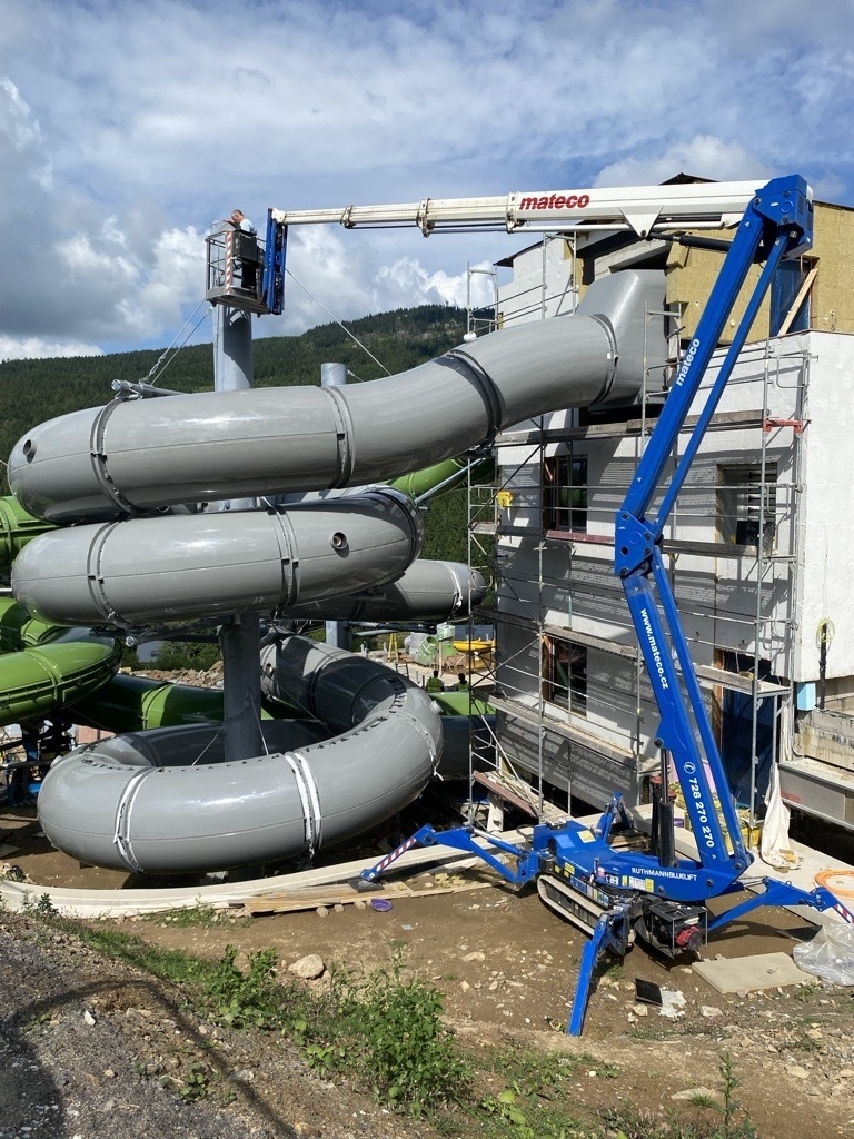 Při montáži tobogánu u Hotelu Vista na Dolní Moravě jsme zajistili technickou podporu formou pronájmu pracovních plošin.