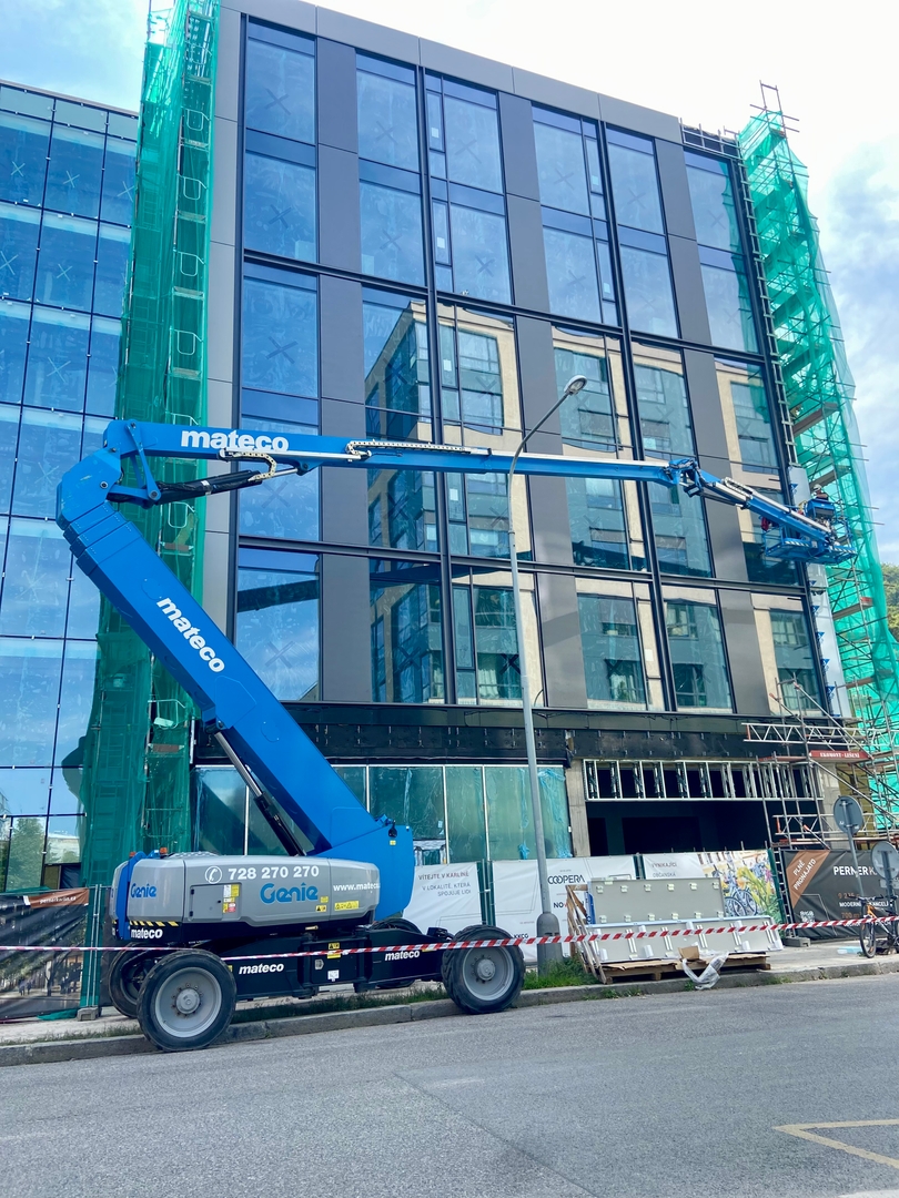 Na tomto projektu byla využita kloubová pracovní plošinaGenie ZX-135/70, která se díky svému výjimečnému dosahu a přesnému ovládání ukázala jako ideální řešení pro práci ve výškách kolem nově vznikajících konstrukcí a fasád.