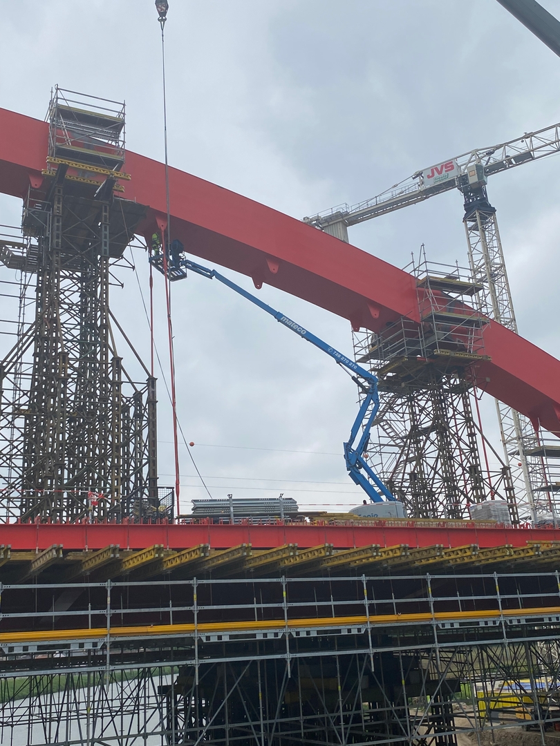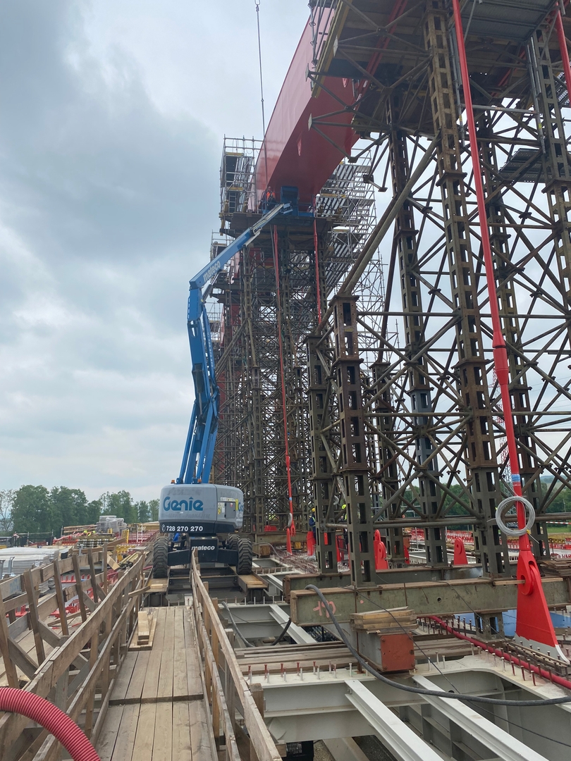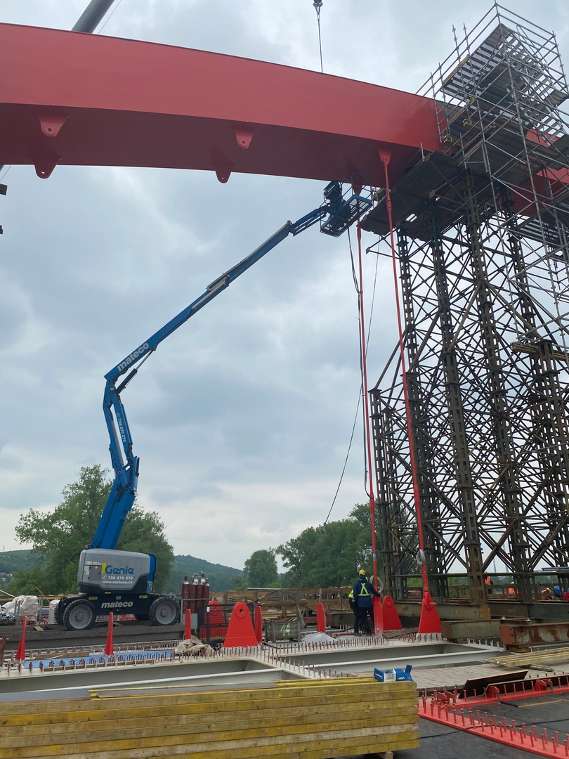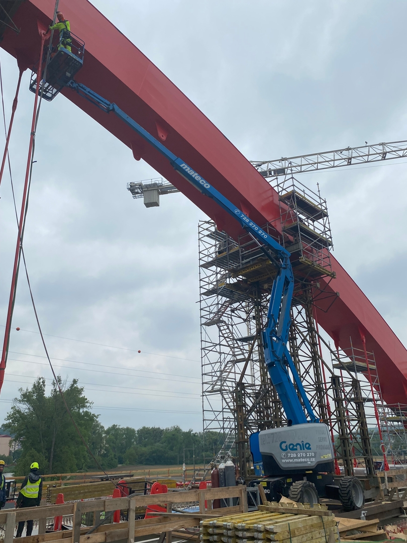 Při montáži a osazování konstrukčních táhel na mostě přes řeku Moravu ve městě Napajedla jsme zajišťovali pronájem pracovních plošin z kategorie Kloubové pracovní plošiny. Klíčovou roli při realizaci sehrála kloubová pracovní plošina Genie Z 62/40, která umožnila přesný přístup do těžko dostupných míst mostní konstrukce.