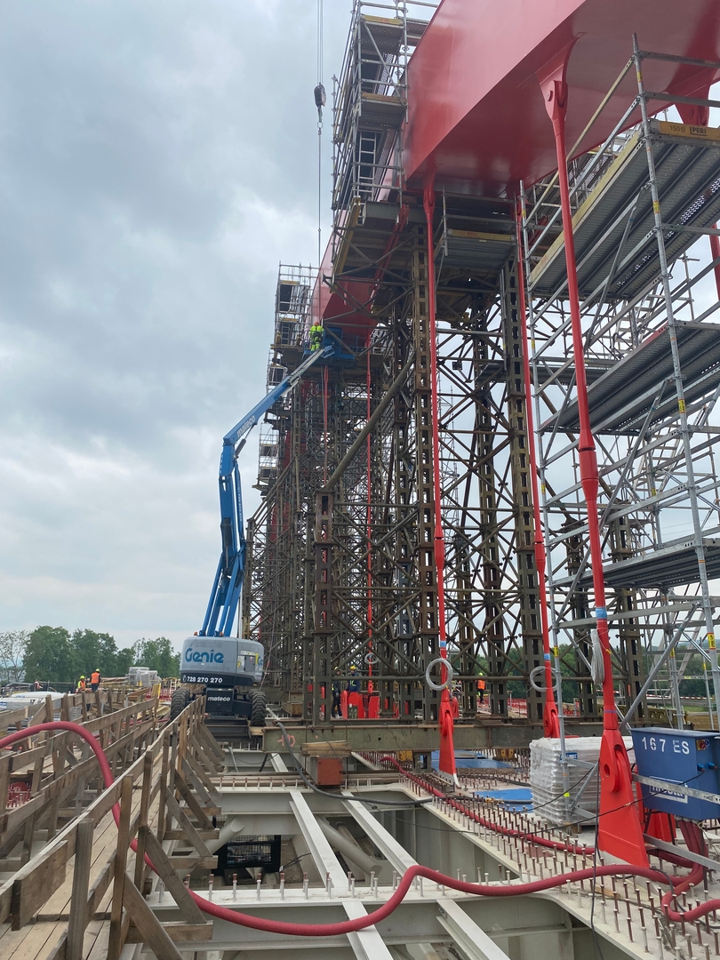 Osazování táhel mostu přes řeku Moravu – Napajedla