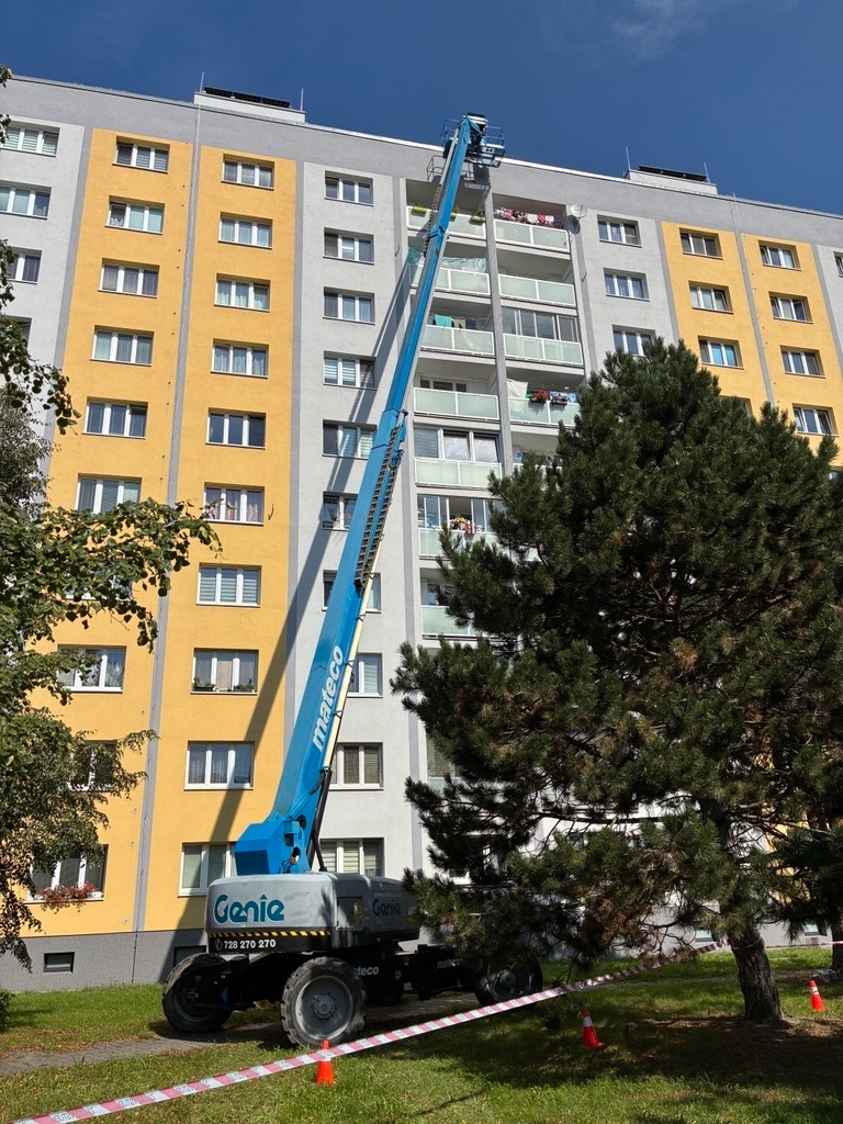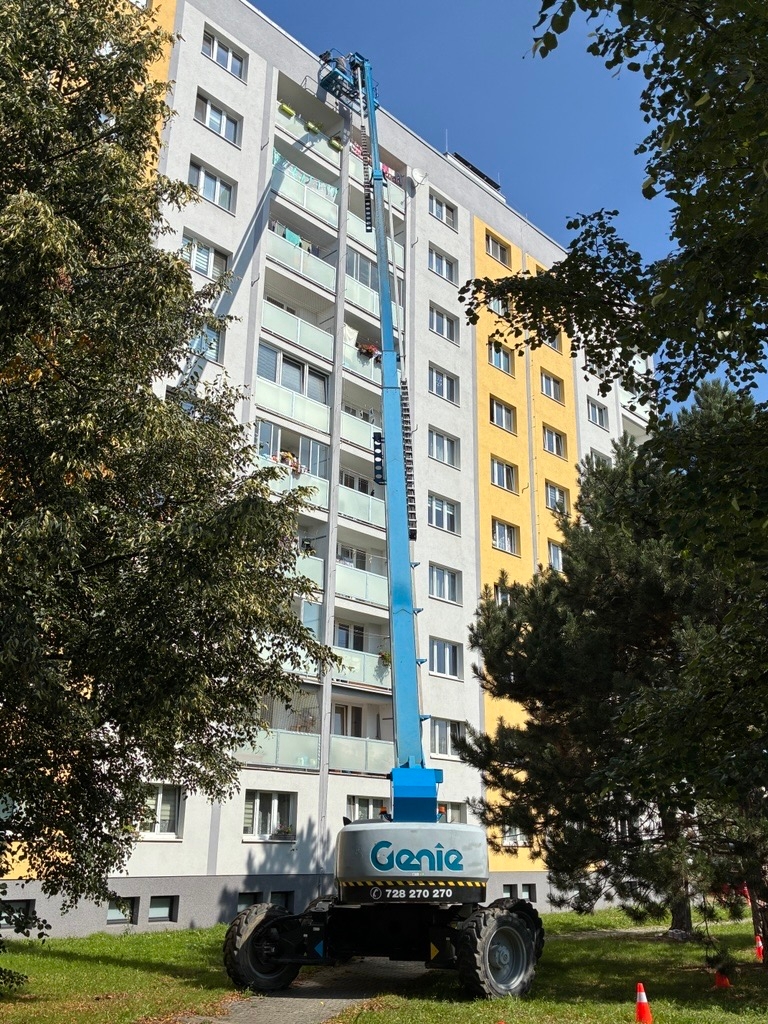 Na projektu v Plzni – Slovanech jsme poskytli technickou podporu formou pronájmu pracovních plošin. Pro práce ve výškách byla nasazena teleskopická pracovní plošina, konkrétně výkonný model Genie SX-125 XC.