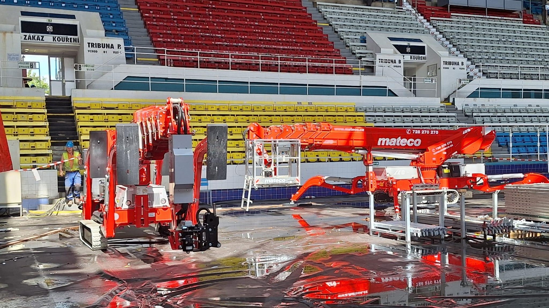 Na stavbu byly dovezeny dvě pásové pracovní plošinyLEO 35 T, které se vyznačují výbornou průchodností i v omezených prostorech, jaké bývají typické pro sportovní haly a uzavřené objekty.