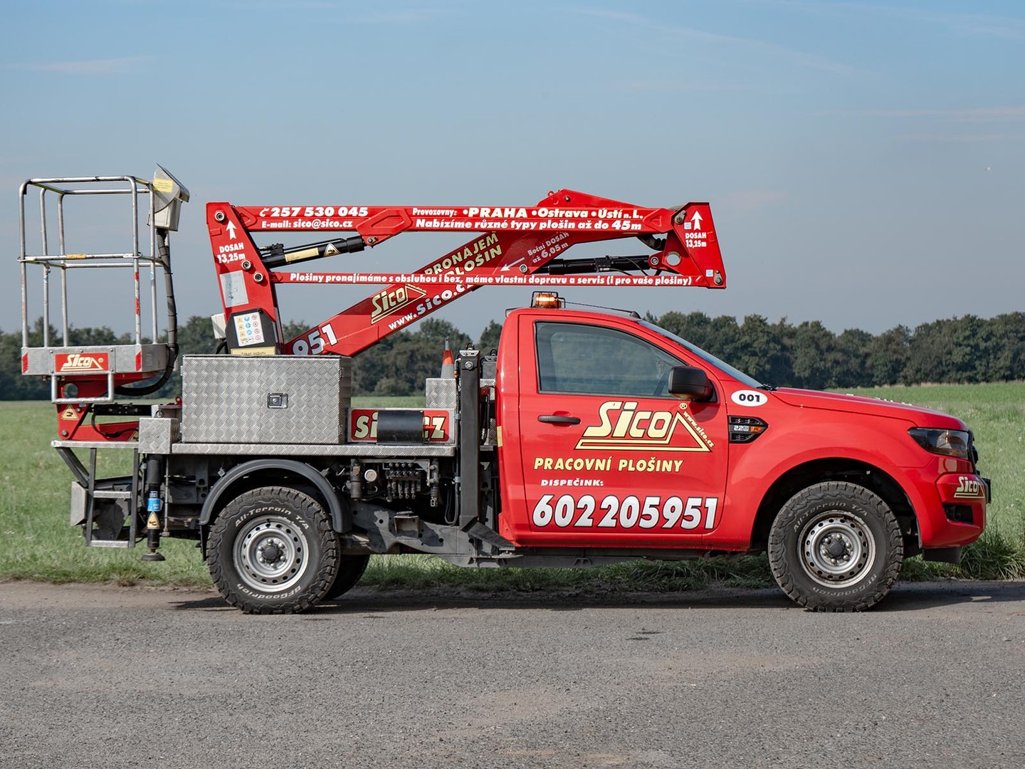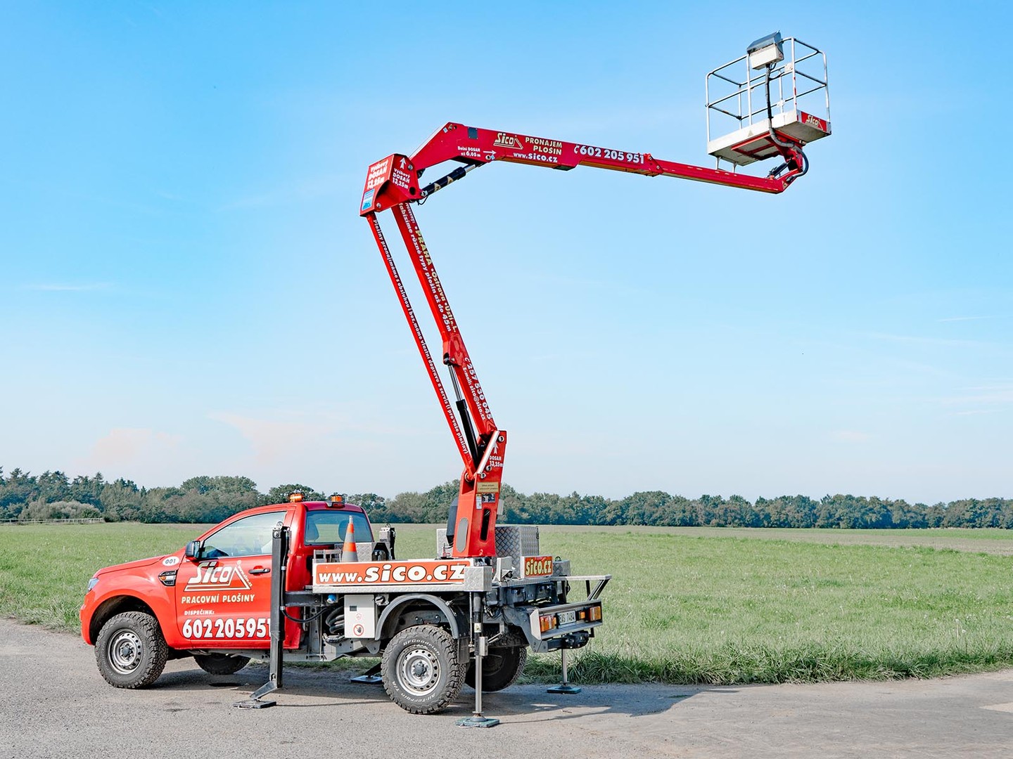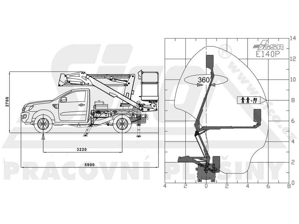 Tak bychom mohli popsat pracovní plošinu italského výrobce GSR - model E140P na podvozku Ford Ranger. Jedná se o nejmenšího, ale hojně využívaného zástupce z kategorie autoplošin. Kloubovo-teleskopická konstrukce umožňuje překlenout v 5 metrech překážku a dostat se až 6 metrů za ní. Celý stroj vážní necelé 3,5 tuny, pracovní výška je 13,2 metrů a koš unese 250 kilogramů. V koši je zásuvka (230 V) pro napájení ručního nářadí. Ranger se nebojí terénu, je vybavený pohonem 4x4 a redukční převodovkou. Stabilitu při práci ve výšce zajišťují 4 výsuvné podpěry. VYZVEDNU A VRÁTÍM - obecné podmínky a vysvětlenízde.Podmínky pronájmu, doporučení k používání, informace ke školení a výpis zakázané manipulace najdete zde.