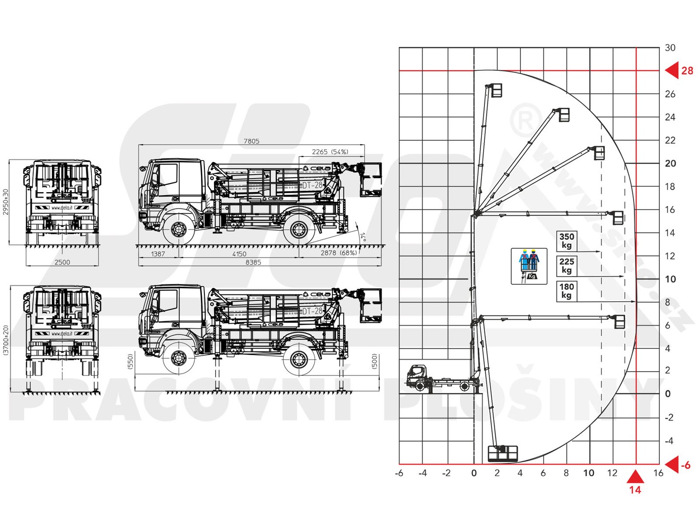 V 16 výškových metrech vás dostane až 14 metrů do strany. Koš jde snadno nahradit jeřábovým hákem o nosnosti 390 kg. Podvozek IVECO EUROCARGO je osazen terénními pneumatikami a všechna kola jsou poháněná. Ustavení stroje je rychlé a při práci na více místech vás téměř nezdrží, intuitivní proporcionální ovládání vám umožní plynulý přístup do stísněných prostor a dosah 6 metrů pod úroveň podvozku z DT28 činí dostupný univerzální pracovní stroj. Nástavba Cela DT28 umožní překlenout překážku ve výšce 5 až 15,5 metru s maximálním bočním dosahem. Autoplošina splňuje přísné bezpečností předpisy a mezinárodní normy. Stabilita plošiny je zajištěna pomocným rámem vozidla se čtyřmi výsuvnými podpěrami, které zachycují zatížení plošiny. Podmínky pronájmu, doporučení k používání, informace ke školení a výpis zakázané manipulace najdete zde.