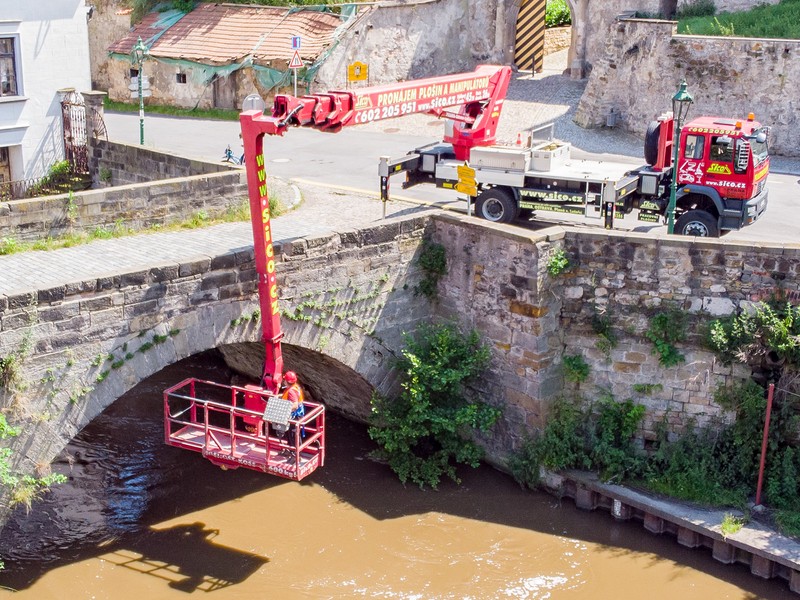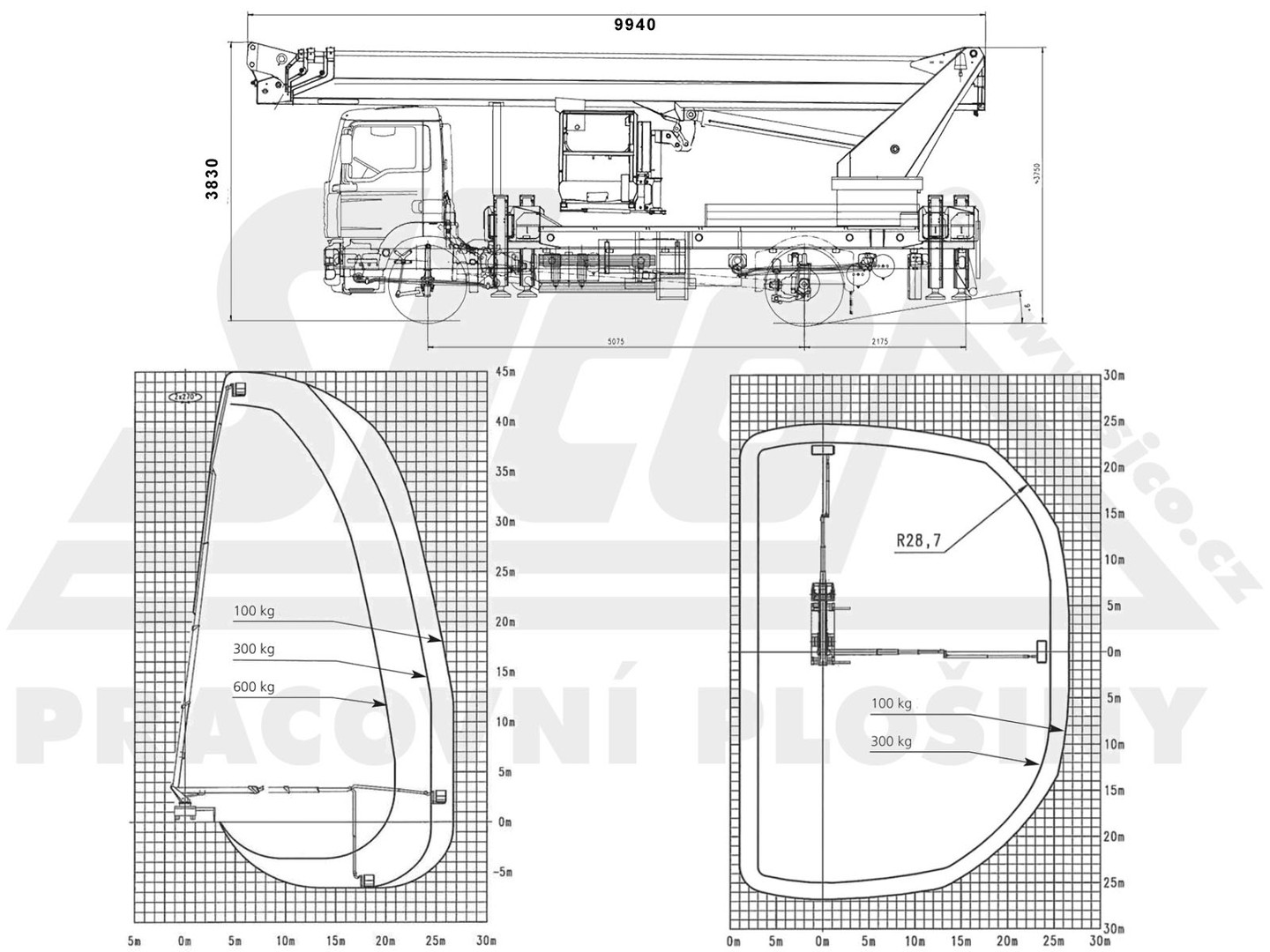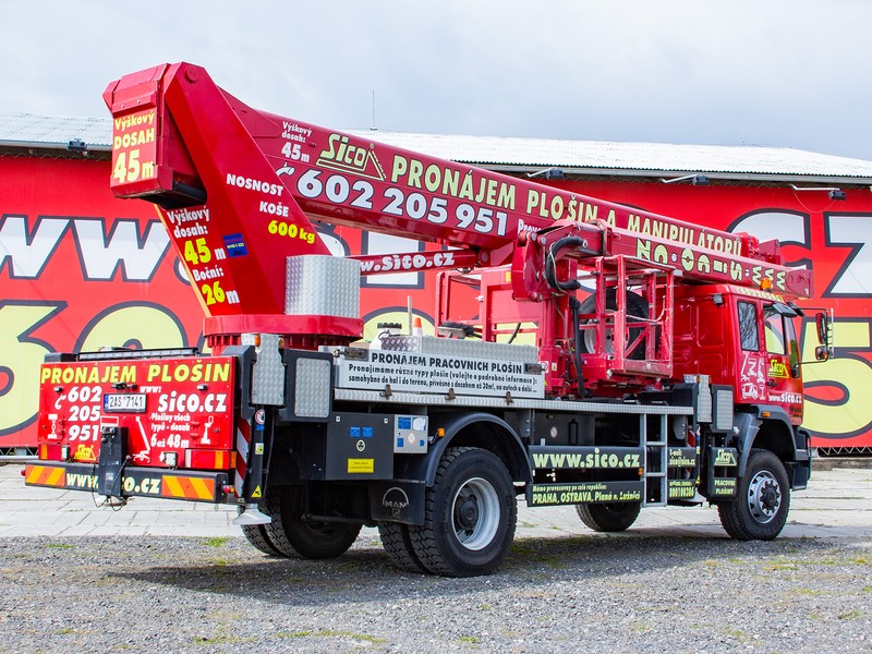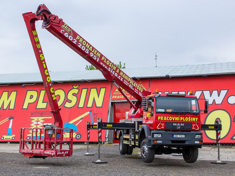 Maximální efektivita a bezpečnost ve výšce až 45 metrů! To je náš MAN LE 18 s nástavbou Wumag WT450. Konstrukce dvou teleskopických ramen - první 4 sekční a druhé 2 sekční, umožní ve výšce až 35 metrů stranový dosah více než 20 metrů (při zatížení koše 100kg z celkových možných 600kg). Negativní dosah 6 metrů zpřístupní například boky mostních konstrukcí. Pracovní koš WT450 můžeme na přání doplnit držáky deskového materiálu - vhodné pro zasklívání budov. Při využití bočního dosahu pouze do jedné strany je možné vysunout opěry pouze na téže straně a snížit tak nároky na prostor pro ustavení stroje téměř na 4,52 metrů na šířku. Podmínky pronájmu, doporučení k používání, informace ke školení a výpis zakázané manipulace najdete zde.