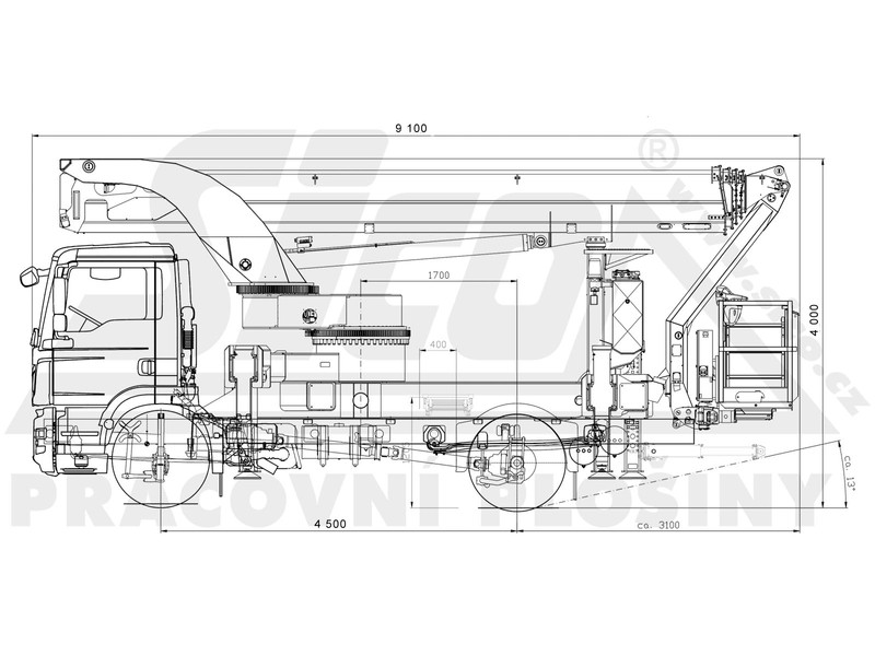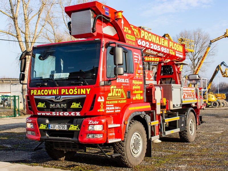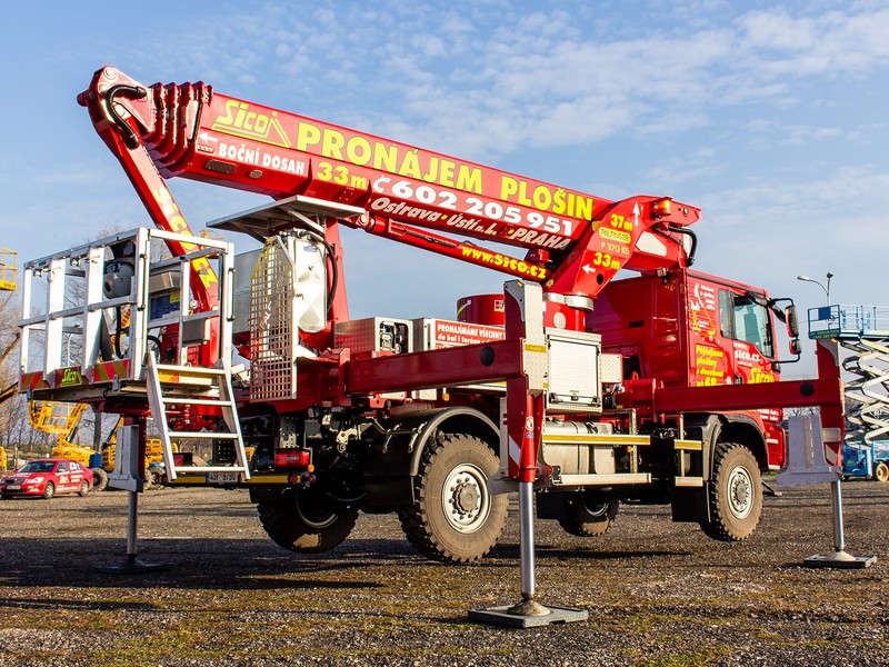 Nástavba Palfinger P370 je sestavena z otoče na podvozku, výložníku s kloubovým teleskopem a pracovního koše na tzv. JIB ramenu, které umožňuje dostat pracovní koš i do špatně přístupných míst. Maximální pracovní výška je 37 metrů. Stroj je vybavený generátorem elektrického proudu a velký pracovní koš s nosností až 500 kg je vybavený zásuvkami s napětím 230V a 24V. Ve výbavě nechybí držáky deskového materiálu s nosností 150 kilogramů. Vozidlo je osazeno terénními pneumatikami a díky pohonu 4x4 se tak dostane i do obtížněji přístupných míst. Specialitou stroje je výbava pro prořez zeleně - tedy bezpečnostní přepážka oddělující obsluhovatele od pracovníka provádějícího prořez a držák motorové pily. Autoplošina splňuje přísné bezpečností předpisy a mezinárodní normy. Stabilita plošiny je zajištěna pomocným rámem vozidla se čtyřmi výsuvnými podpěrami, které zachycují zatížení plošiny. Pro práci pouze na jedné straně stačí vysunout opěry na dané straně vozu a šetřit tak místo potřebné pro ustavení. Tato verze P370KS je na podvozku s rozvorem 4,5 metru a je vybavena spací kabinou. Podmínky pronájmu, doporučení k používání, informace ke školení a výpis zakázané manipulace najdete zde.