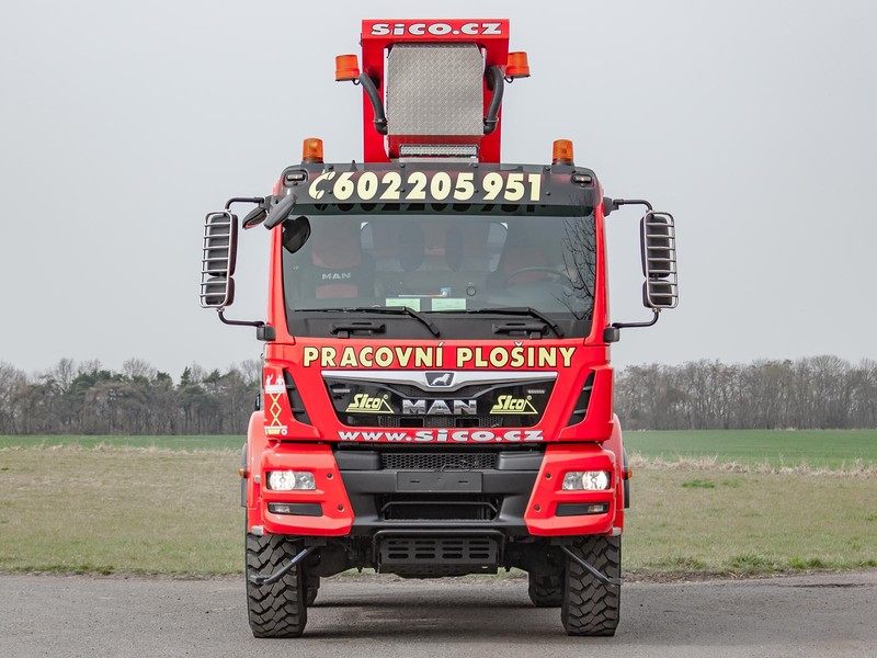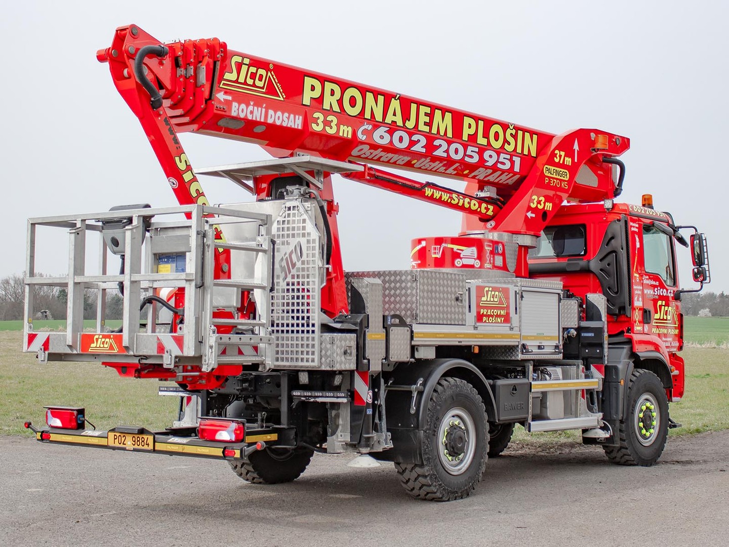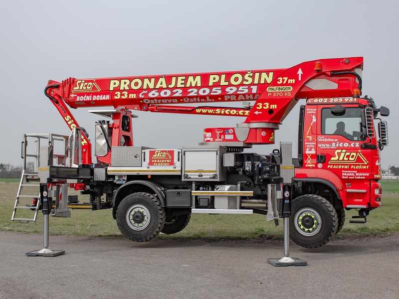 Nástavba Palfinger P370KS je sestavena z otoče na podvozku, výložníku s kloubovým teleskopem a pracovního koše na tzv. JIB ramenu, které umožňuje dostat pracovní koš i do špatně přístupných míst. Maximální dosah plošiny je 37 metrů do výšky. Velký pracovní koš s nosností až 500 kg je vybavený zásuvkami s napětím 230V. Vozidlo je osazeno terénními pneumatikami a díky pohonu 4x4 se tak dostane i do obtížněji přístupných míst. Rozvor kratší o 60 cm (oproti verzi I) zajišťuje perfektní manévrovatelnost. Stroj je možné dovybavit držáky deskového materiálu. Při pohybu výložníkem pouze do jedné strany je možné vysunout opěry jen na téže straně vozu a šetřit tak místo potřebné pro ustavení stroje. Autoplošina splňuje přísné bezpečností předpisy a mezinárodní normy. Stabilita plošiny je zajištěna pomocným rámem vozidla se čtyřmi výsuvnými podpěrami, které zachycují zatížení plošiny. Tato verze P370 je vybavena podvozkem s kratším rozvorem - 3,9 metru, to propůjčuje stroji lepší manévrovatelnost ve stísněných prostorech. Podmínky pronájmu, doporučení k používání, informace ke školení a výpis zakázané manipulace najdete zde.