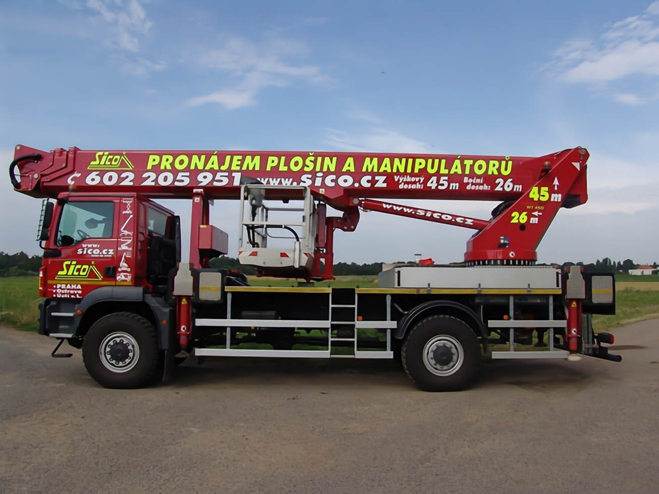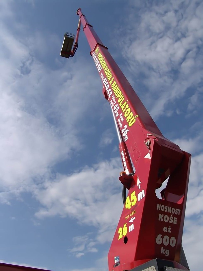 Pracovní výška 45 metrů, stranový dosah až 26 metrů, nosnost koše 600 kilogramů a dokonce i negativní dosah 6 metrů pod úroveň podvozku, to je naše WT450!