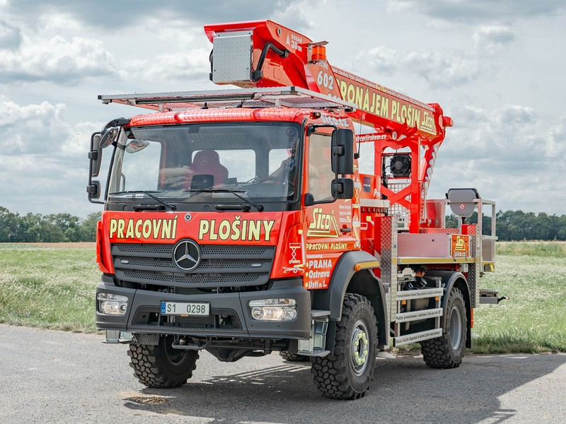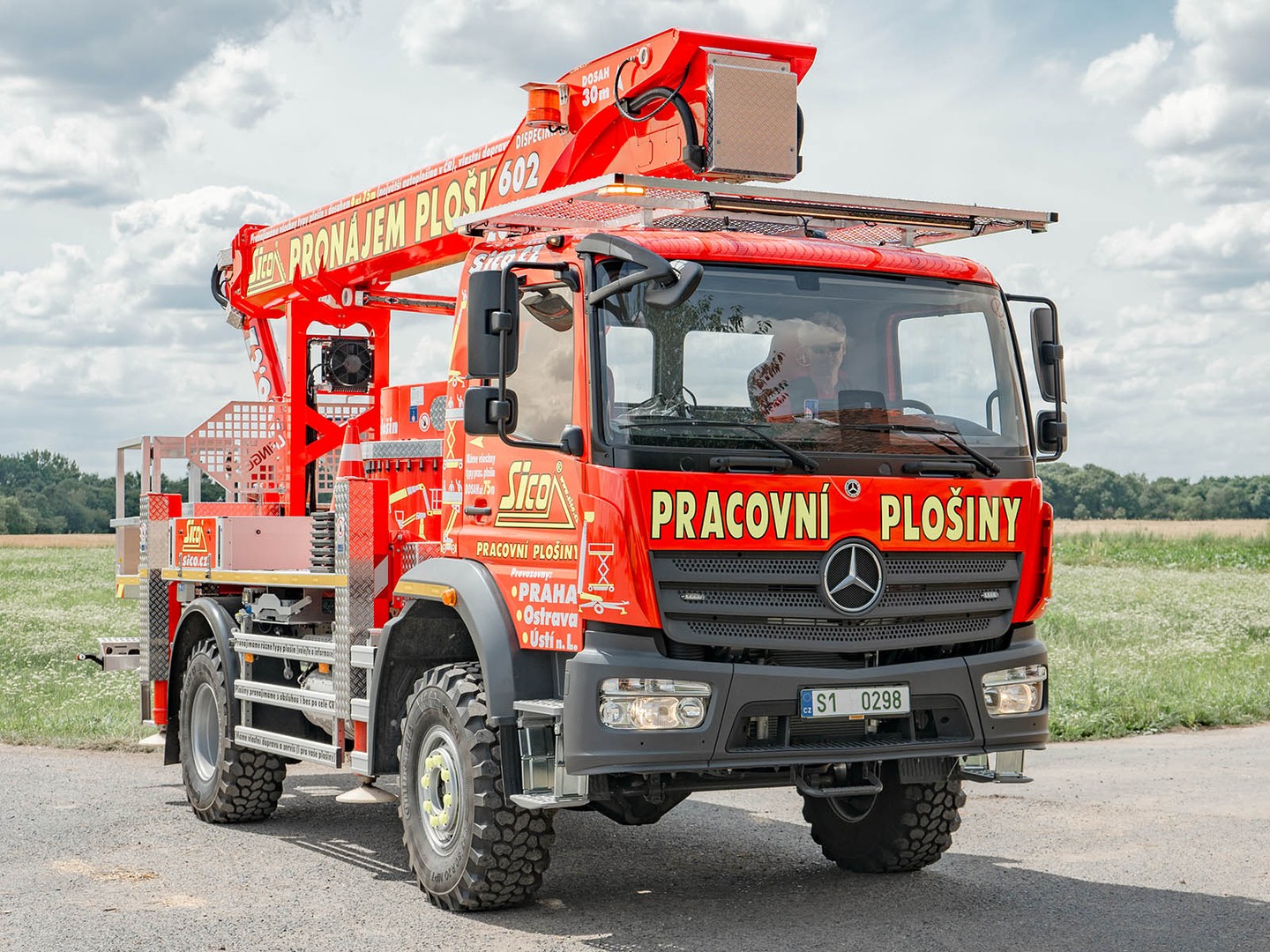 Palfinger P300KS je disponuje perfektními dosahy. Nástavba je montovaná na kompaktním podvozku M-B Atego 4x4. Do výšky 8 m je možný bez použití stabilizátorů - nabízí se využití při opravě veřejného osvětlení. Při použití ve svažitém terénu dovolí stabilizátory s výškou zdvihu 800 milimetrů vyrovnat sklon až 5°. Při využití opěr je k dispozici maximální pracovní výška až 30 metrů a stranový dosah až 20,5 metru (při 100 kilogramech v pracovním koši). JIB rameno je vertikálně pohyblivé v rozsahu 195° a výložník je schopný 540° rotace okolo své osy.