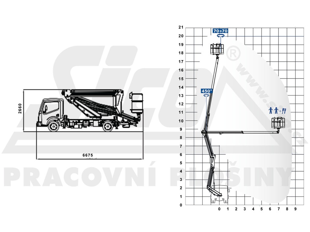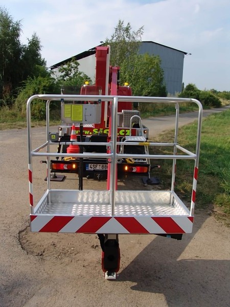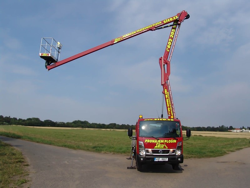 hodí na větší počet výškových prací v krátké době. Inovovaná konstrukce dvojitého kloubovo-teleskopického ramene umožňuje překlenout překážku ve výšce 8 metrů při zachování maximálního stranového dosahu 8,7 metrů. Maximální pracovní výška je 20 metrů a koš unese 300 kg. O pohon nástavby se postará motor vozu, nebo elektrický proud s napětím 230V. Autoplošina splňuje přísné bezpečností předpisy a mezinárodní normy. Stabilita plošiny je zajištěna pomocným rámem vozidla se čtyřmi výsuvnými podpěrami, které pouze minimálně převyšují šíři vozu, na ustavení tedy stačí prostor o šířce 2,33 metrů. Veškeré pohyby plošiny jsou jištěny pojistnými ventily. VYZVEDNU A VRÁTÍM - obecné podmínky a vysvětlení zde.Podmínky pronájmu, doporučení k používání, informace ke školení a výpis zakázané manipulace najdete zde.