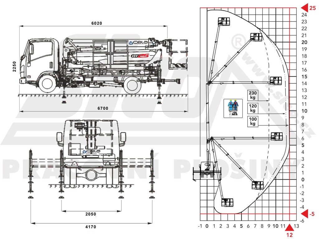 Minimální rozměry podvozku, hmotnost pod 3,5 tuny a pracovní výška až 25 metrů určují DT25 italského výrobce Cela pro široké spektrum využití.