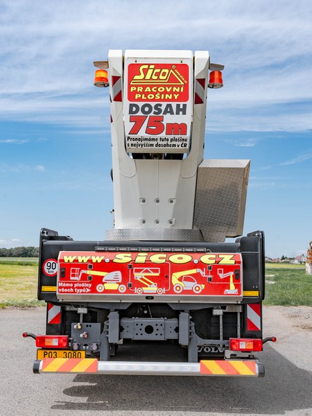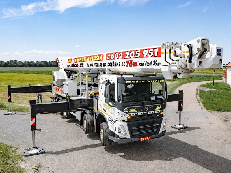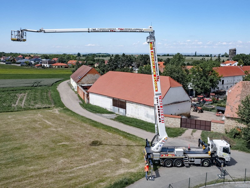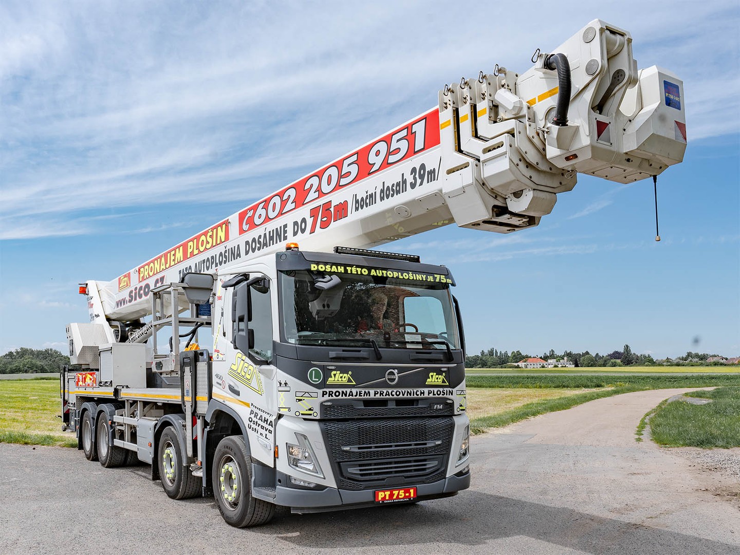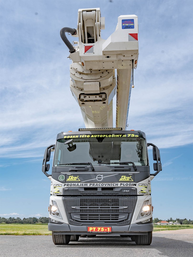Nejvyšší pracovní plošina v České republice! Maximální stabilita, maximální dosahy - 75 metrů do výšky, až 39 metrů do strany a nosnost koše až 600 kilogramů - to je Jumbo class Palfinger P750!