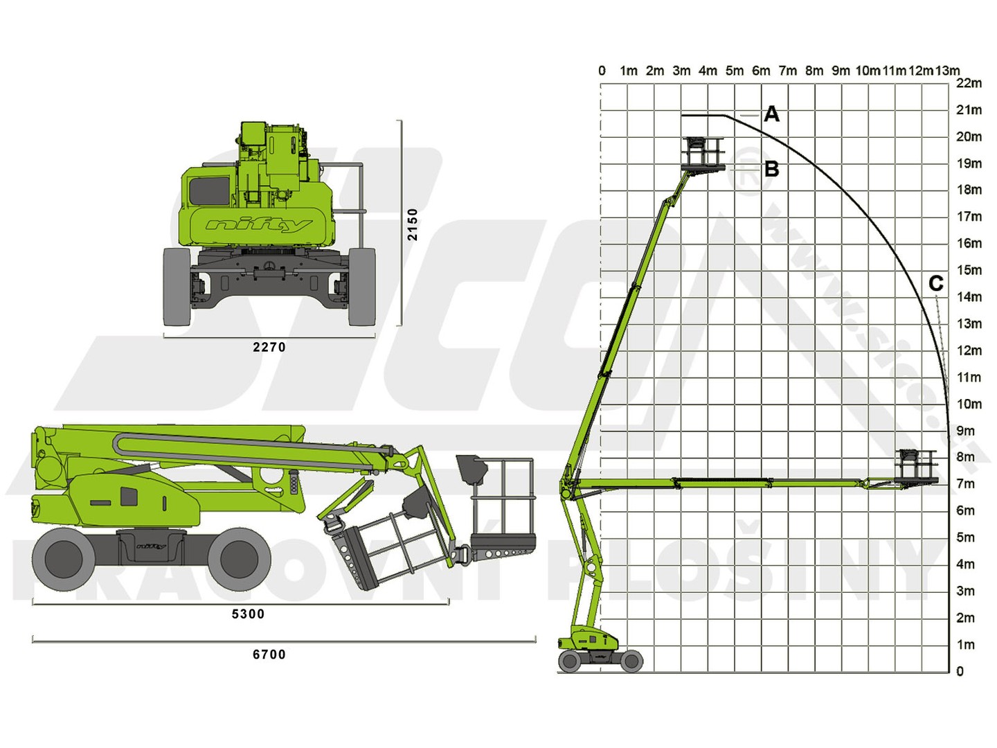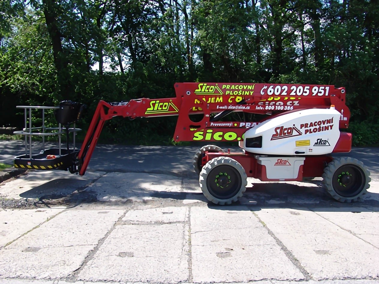 Žádaný stroj kloubové konstrukce s pohonem všech kol, který umožní pracovat ve výšce až 20,8 metrua je perfektně přizpůsobený pro práci venku i uvnitř (bezemisní provoz). JIB rameno je pohyblivé v rozsahu 100°, nástavba je otočná o 360° a maximální stranový dosah je 12,8 metru. O pohon plošiny se stará hybridní systém dieselového agregátu a elektromotorů pro pojezd i pro pohyb zdviže. Systém dovoluje využívat veškeré funkce pouze za použití akumulátorů (ideální pro využití v interiéru). Pro maximální efektivitu a pro ideální běh stroje je vhodné nevybíjet baterie pod 75% a využívat kombinovaný systém pohonu, který umožní maximální efektivitu, nabíjení za chodu a dokáže eliminovat nutnost připojovat stroj do sítě 230 V. Stabilitu a přístupnost do obtížných terénů zajišťuje její robustní konstrukce, velká kola a stoupavost 40%. Stroj je vhodný i pro práci v terénu. Přes vynikající hodnoty pracovní výšky a stranového dosahu zůstává stroj kompaktní - průjezdná šířka je pouhých 2,27 metru a průjezdná výška 2,15 metru. Stroj splňuje všechny přísné bezpečnostní normy a předpisy.