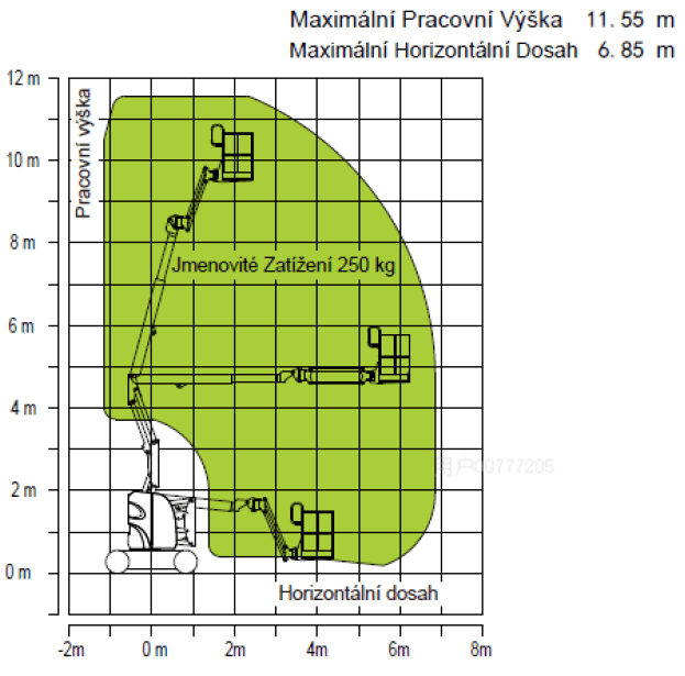 Maximální pracovní výška plošiny dosahuje 11,55 metru a stranový dosah činí až 6,85 metru, což umožňuje pohodlný přístup i k hůře dostupným místům. Otočné jibové rameno o délce 1,24 m poskytuje vysokou flexibilitu při polohování pracovního koše. Nosnost koše 230 kg umožňuje bezpečnou práci obsluhy včetně potřebného nářadí. Díky kompaktním rozměrům, malé výšce ve složeném stavu a dobré manévrovatelnosti je ZA10RJE praktickým řešením pro každodenní nasazení v interiéru.