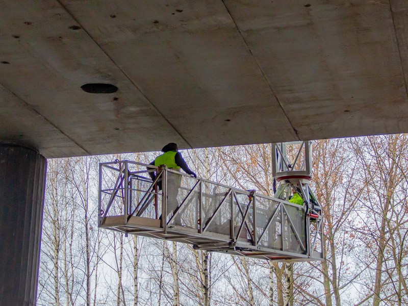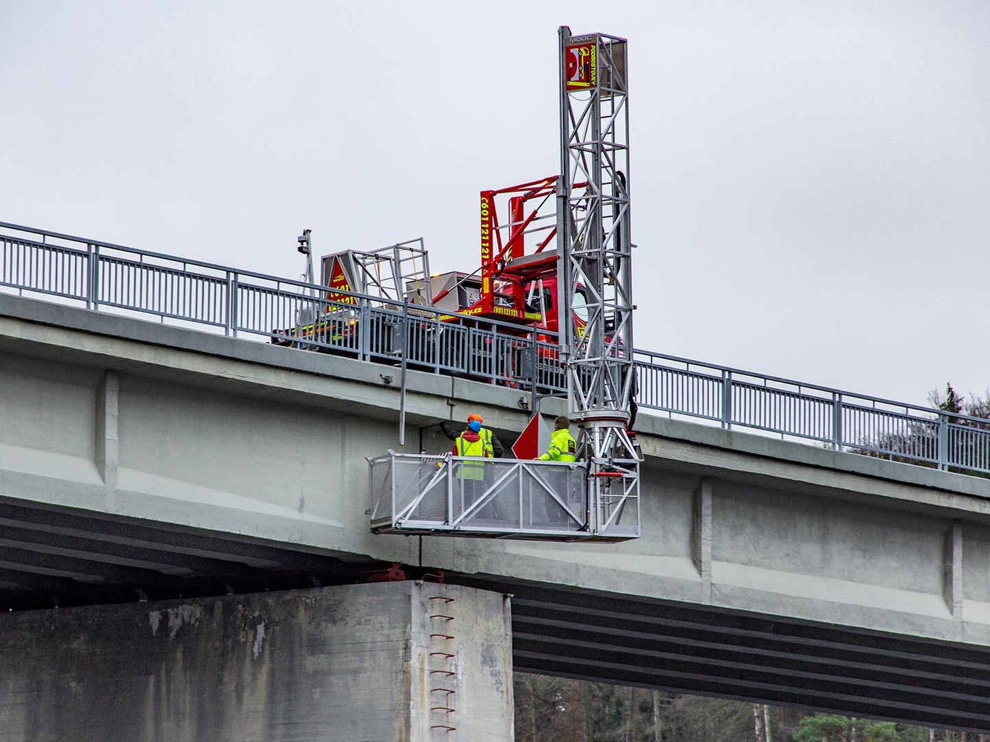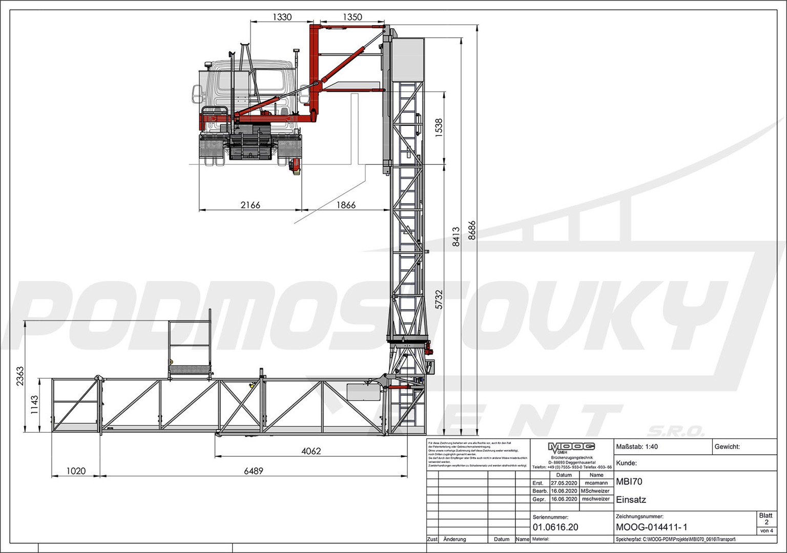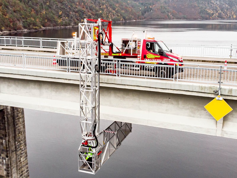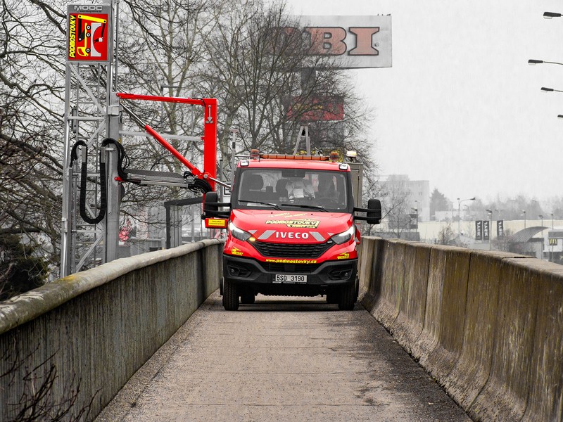 Mostní prohlížečka je umístěna na automobilovém podvozku IVECO DAILY. Inspekční lávka MOOG MBI 70-1/S umožňuje umístit hydropojezd na obě strany stroje, disponuje perfektními parametry nosnosti, dosahu lávky a hloubky spuštění. Kompaktní stroj oceníte na mostních konstrukcích, kde budete limitování rozměry a nosností. Stroj je vybaven generátorem elektrického proudu (napětí 230 V) pro připojení ručního nářadí. Pro obsluhu inspekční lávky MOOG MBI 70-1/S jsme proškoleni přímo ve středisku MOOG GmbH. Technické řešení splňuje všechny bezpečnostní požadavky pro konstrukci a provoz vyhrazených zdvihacích zařízení.