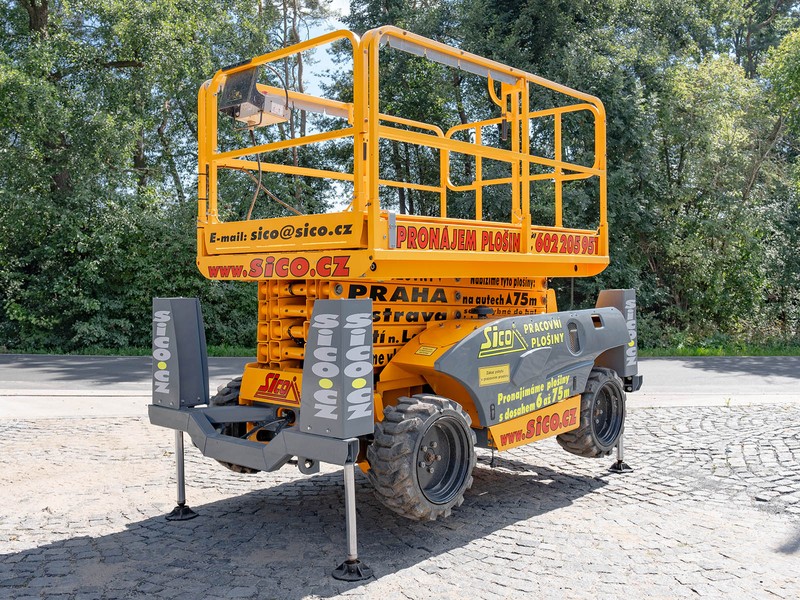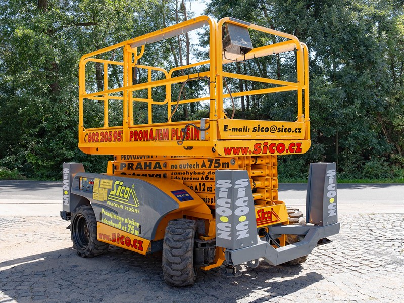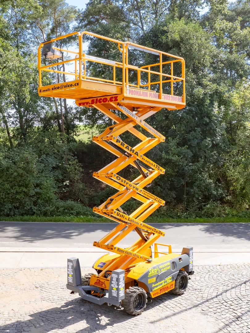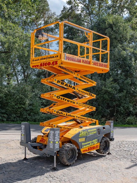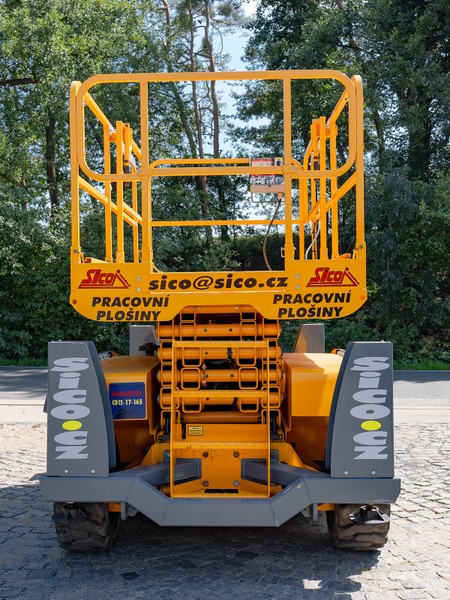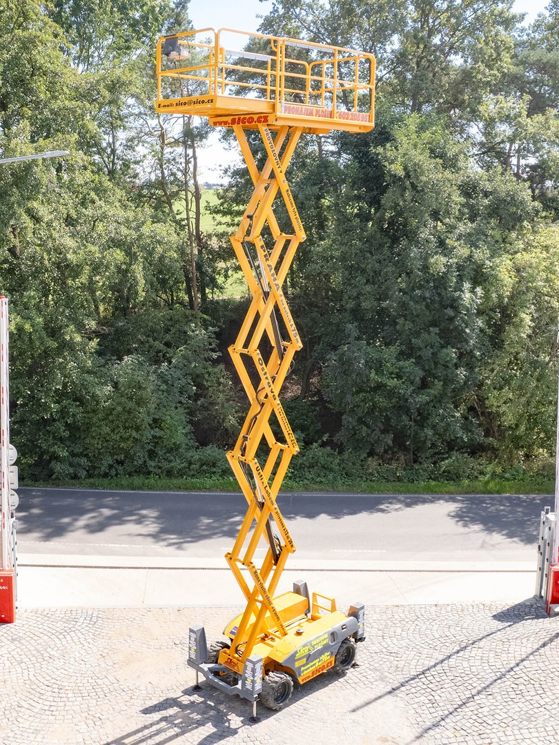 Dieselová nůžková plošina Haulotte pro práce v obtížném terénu. H 12 DX disponuje maximální pracovní výškou 12,06 metru a v koši unese 450 kilogramů.