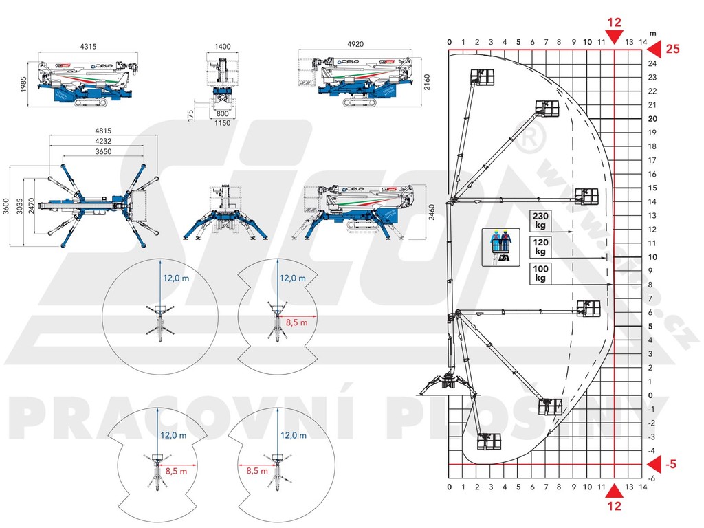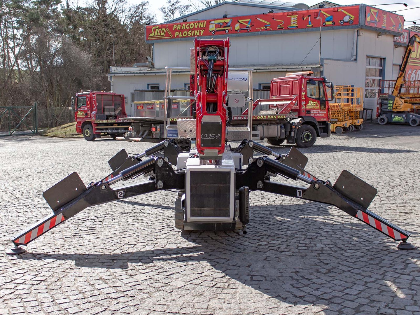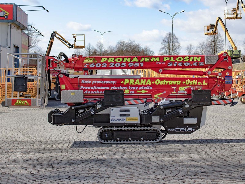 Plošina DT25 SPYDER byla speciálně vytvořena pro vnitřní i vnější práce na velkých halách – letištích, nákupních centrech, továrnách a dalších prostorných budovách. Díky kompaktní konstrukci pracovní plošiny je možné snadnou úpravou dosáhnout průjezdné šířky pouze 80 cm a odnímatelnému koši je možné ji použít i pro práci v těžko přístupných místech. Pracovní koš je snadno nahraditelný jeřábovým hákem s nosností 260 kilogramů (vysvětleno ZDE na autoplošinách Cela). Pracovní plošina DT25 SPYDER má pásový pojezd a lze ji řídit i dálkově. Její pracovní výška plošiny je 25 metrů. Při zatížení koše 120 kilogramy činí stranový dosah 11,5 metru, při plném zatížení je z bezpečnostních důvodů omezen na 9 metrů. Stroj také umožní negativní dosah 5 metrů pod úroveň terénu. Pracovní plošina splňuje přísné bezpečností předpisy a mezinárodní normy. Ochranný systém plošiny – hydraulické zámky, přetlakové ventily, dvojnásobné jištění elektrických a hydraulických prvků – zajišťuje perfektní bezpečnost pracovníka v koši i personálu na zemi.