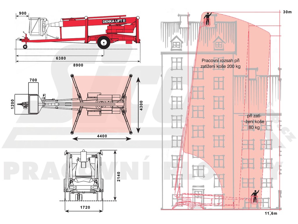 Stroj disponuje stranovým dosahem 11,6 metru (při zatížení 80kg). Při využití maximálního zatížení koše 200kg je stranový dosah omezen na 8,6m. Robustní konstrukce teleskopického výložníku a bezpečnostní systém dvojitého jištění elektrických a hydraulických prvků zajišťují maximální bezpečnost. Plošina je vybavena sadou osmi akumulátorů a je vhodná pro dlouhé pracovní nasazení s častým měněním pozic. Pohon stroje zajišťují akumulátory a nájemce je povinný zajistit jejich dobíjení denně po dobu minimálně 12 hod (napětí 230 V). Stroj je vybaven i dieselovým agregátem, který je vhodné využít např. při přejezdech stroje na delší vzdálenosti (úspora energie v bateriích). Stroj se do pracovní pozice ustavuje přímo z koše a vestavěné automatické omezení zatěžovacího momentu zajišťuje optimální stranový dosah v závislosti na zatížení v koši. Náš nejvyšší přívěs, Denka-Lift DL 30, pomáhá při výškových pracích ve stísněných podmínkách, kde by jiné a konstrukčně větší stroje měly již potíže.