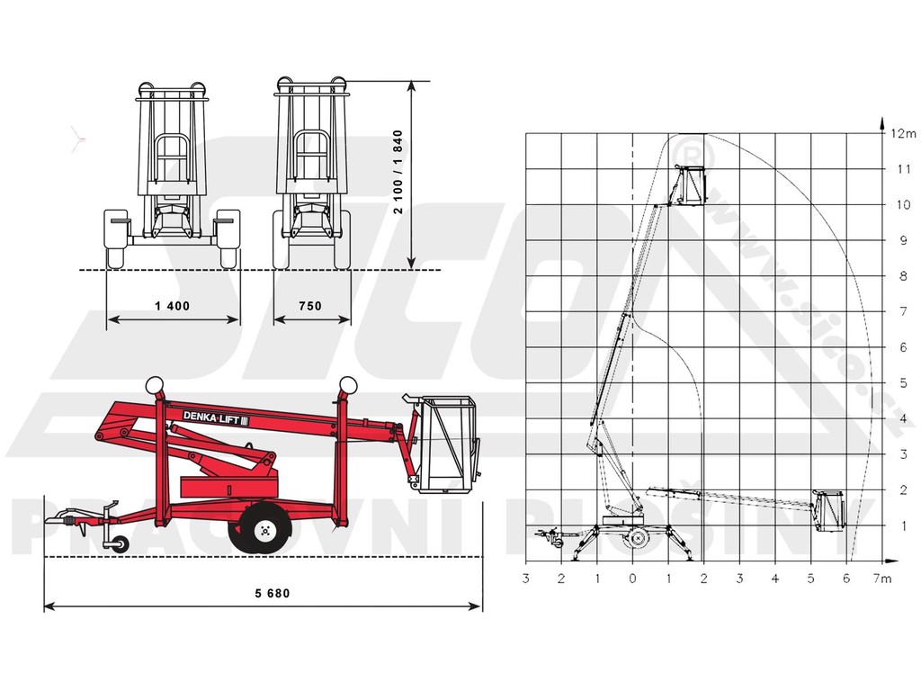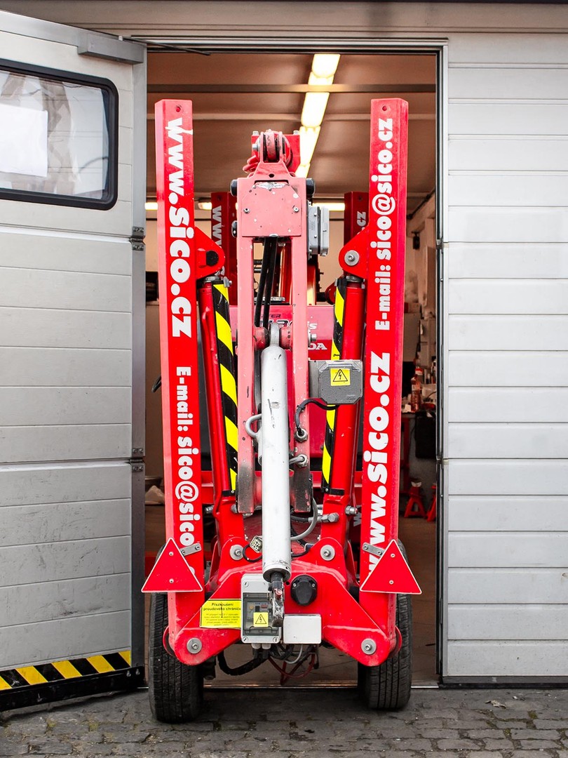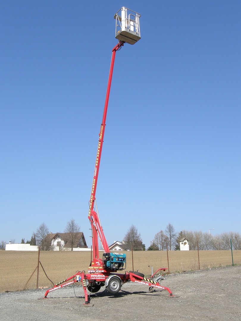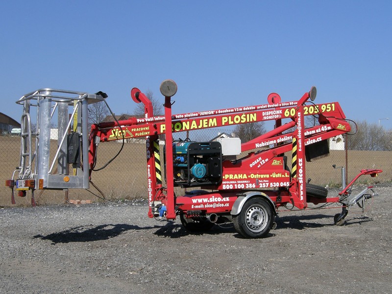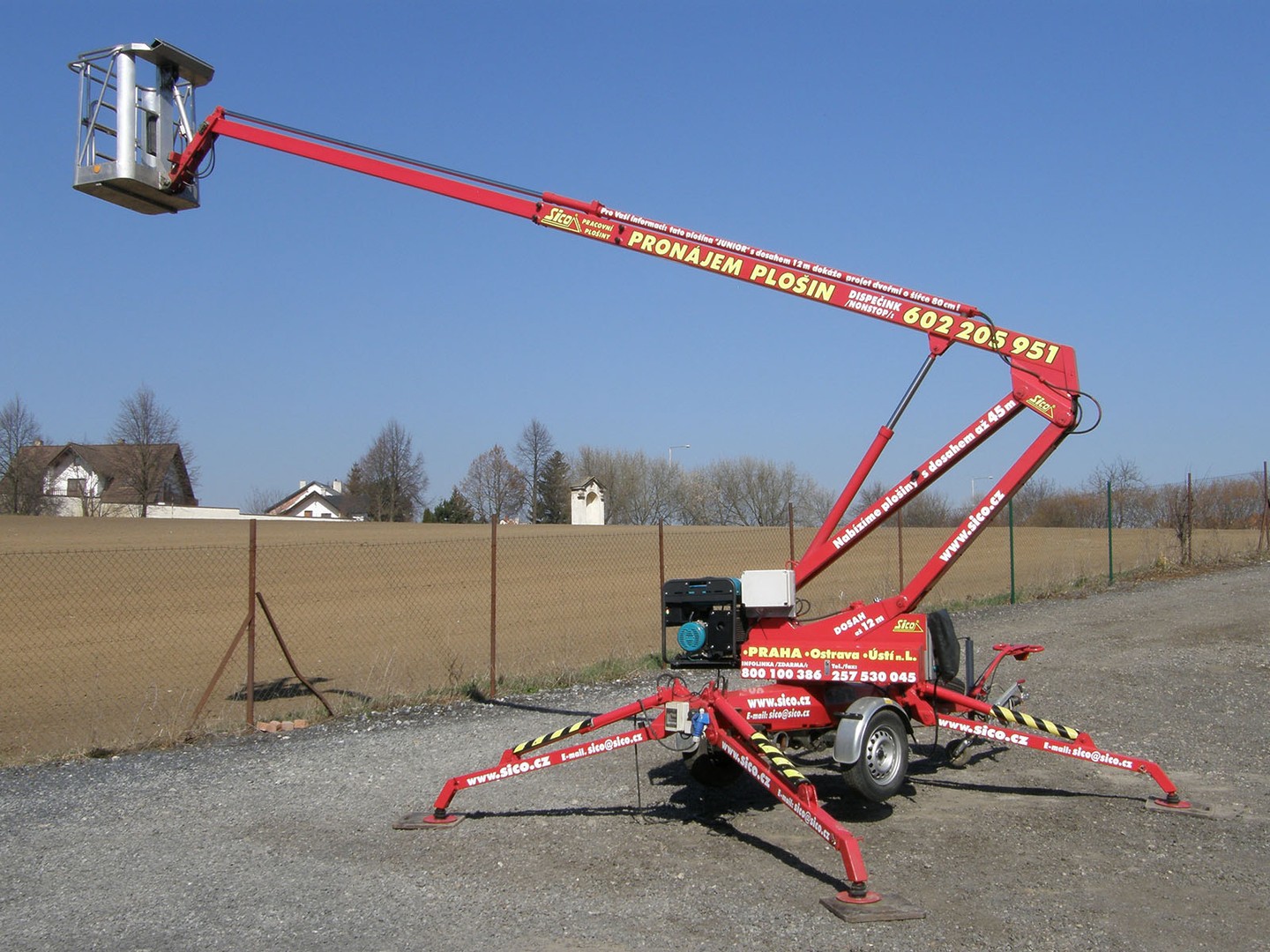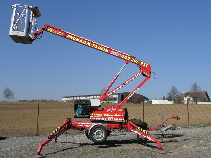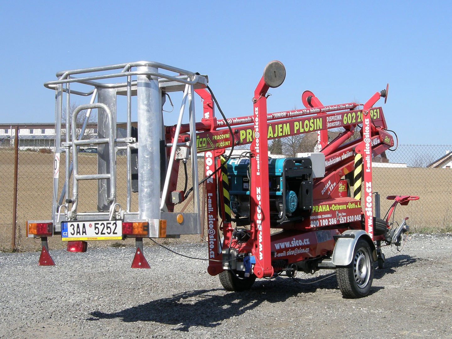 Nejmenší zástupce přívěsných plošin. Stroj váží pouhých 1000 kg, ale přesto s ním můžete pracovat až ve 12metrové výšce.